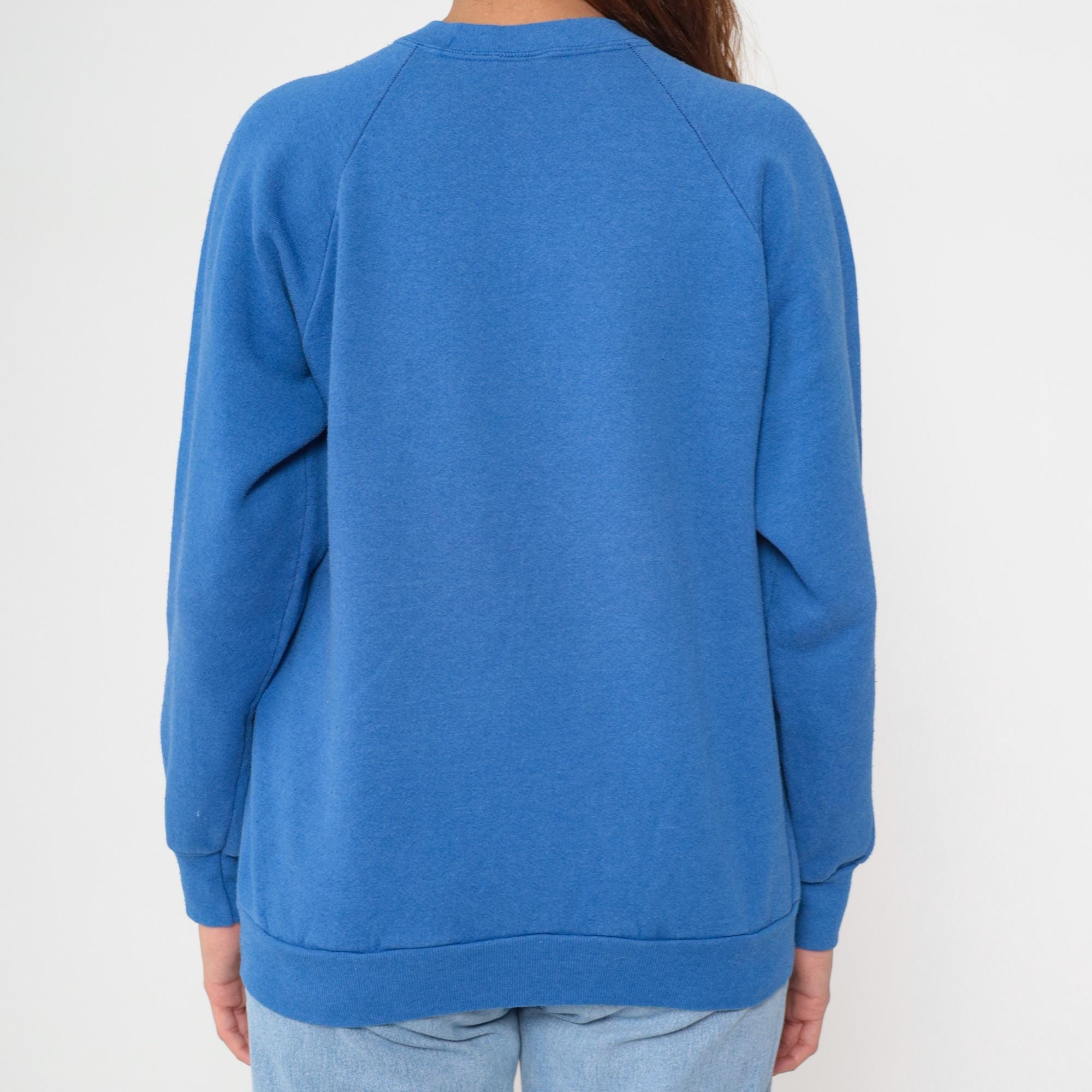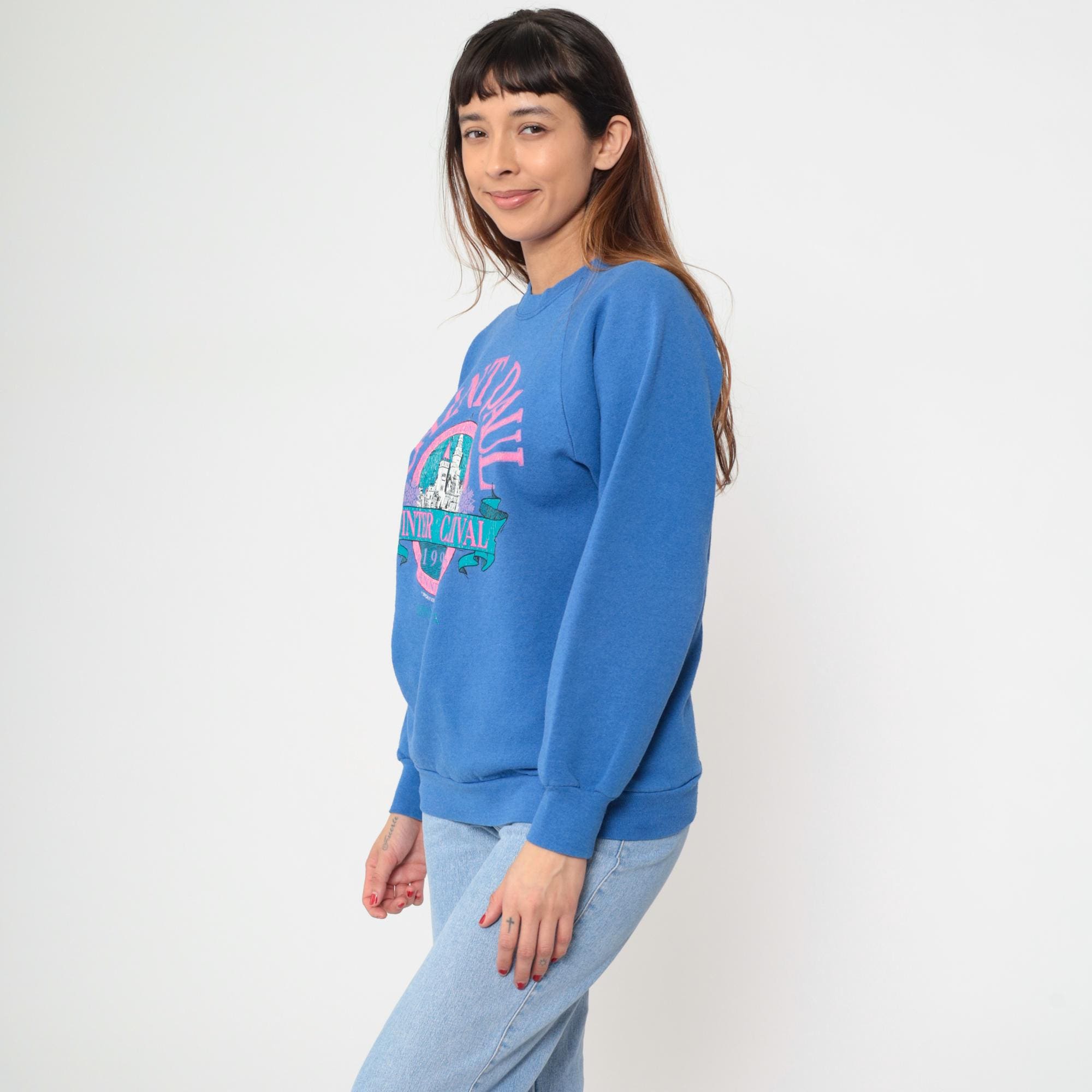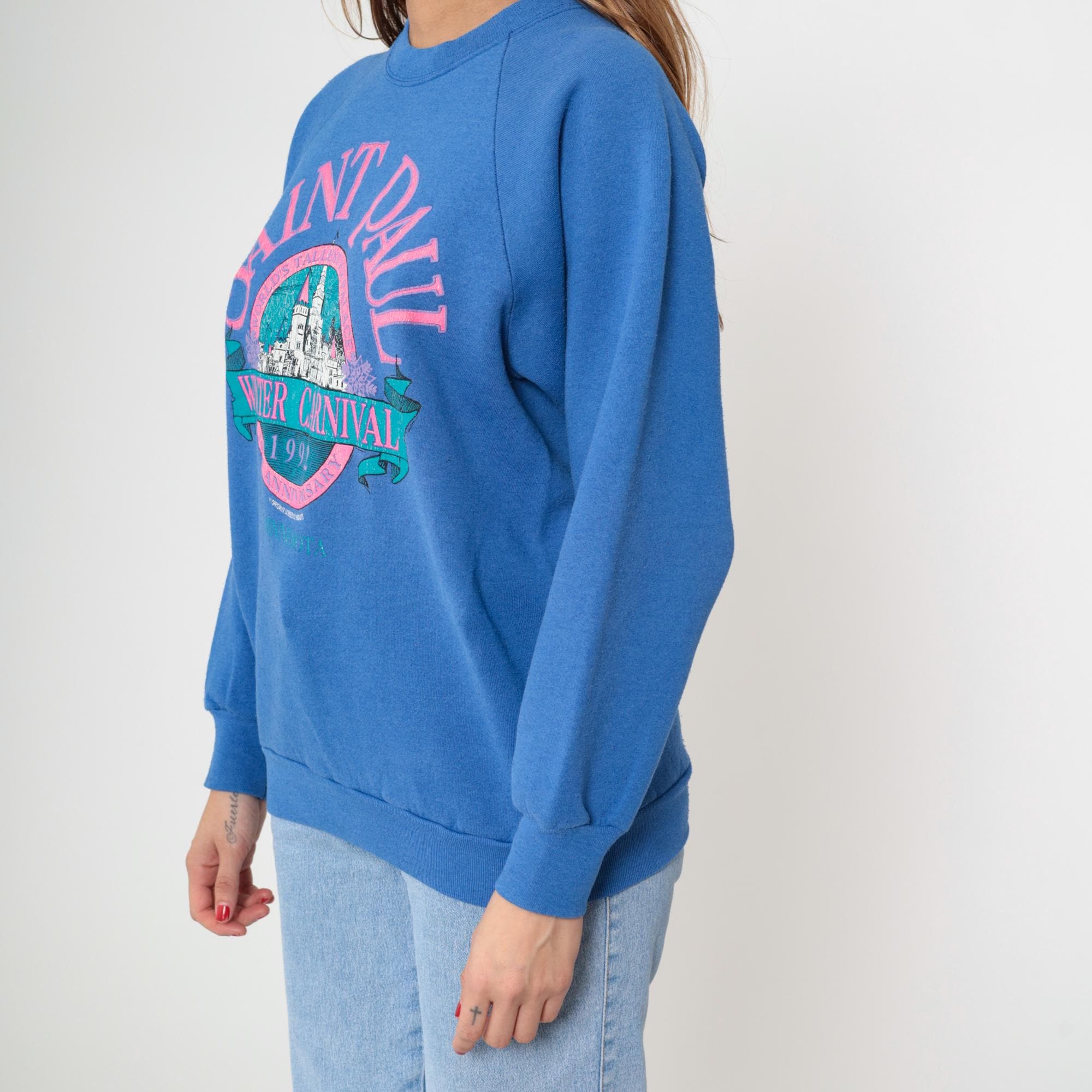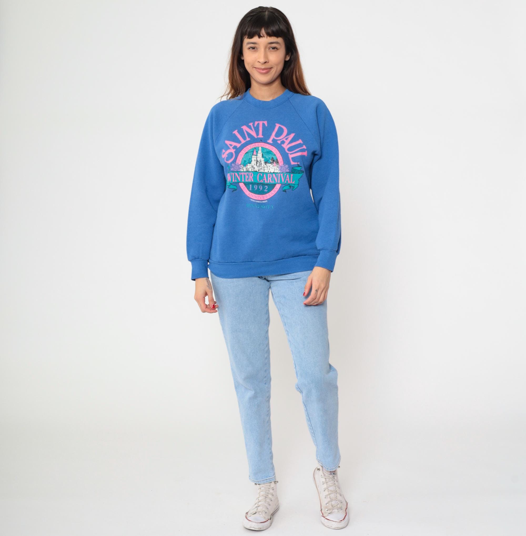 90s blue sweatshirt from Fruit of the Loom with Saint Paul Winter Carnival 1992 graphic print. Pink and teal design features castle illustration with "SAINT PAUL" text arched across top, "WINTER CARNIVAL 1992" banner across center, and "MINNESOTA" text at bottom. Raglan sleeves with ribbed cuffs, ribbed crew neckline and hem.