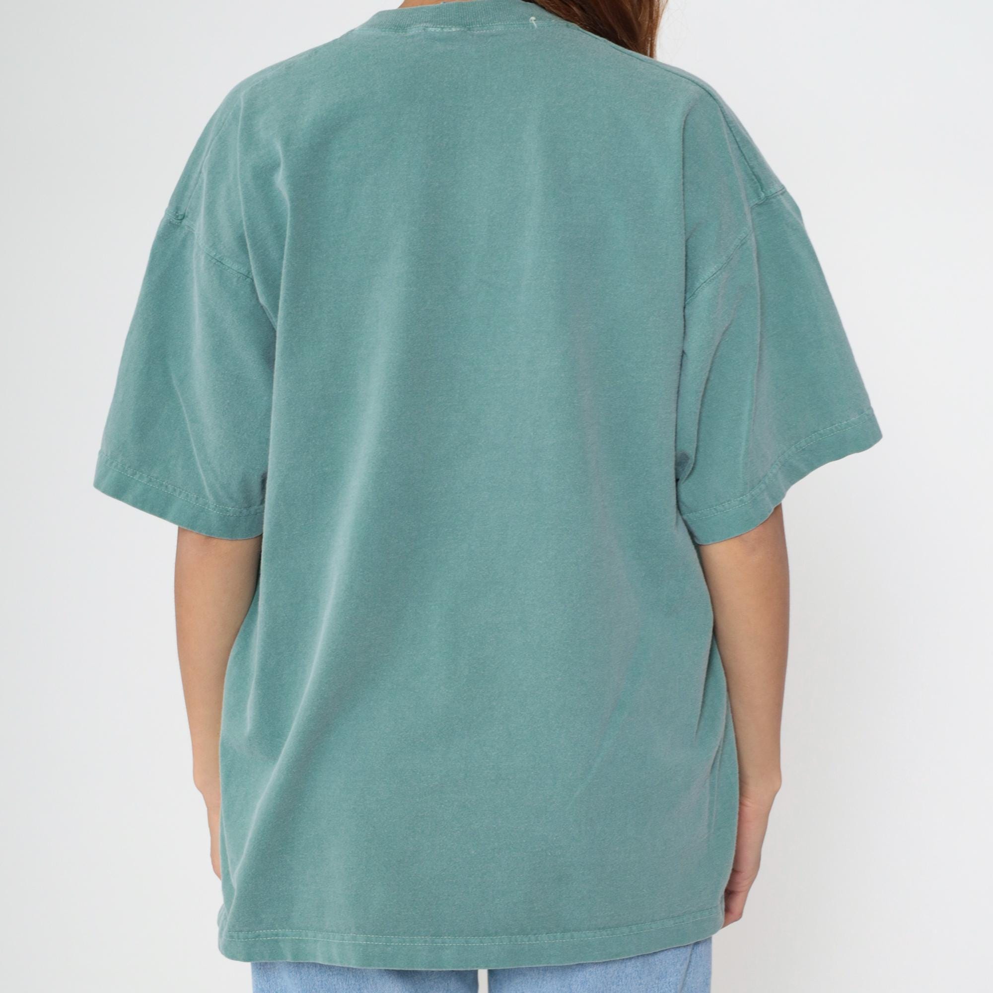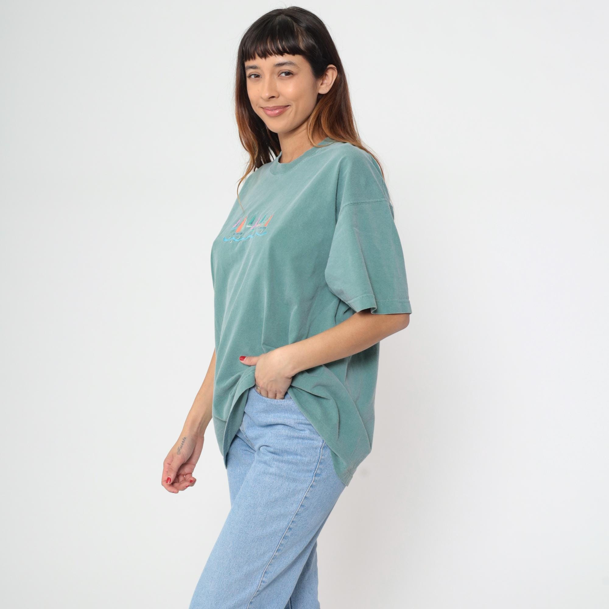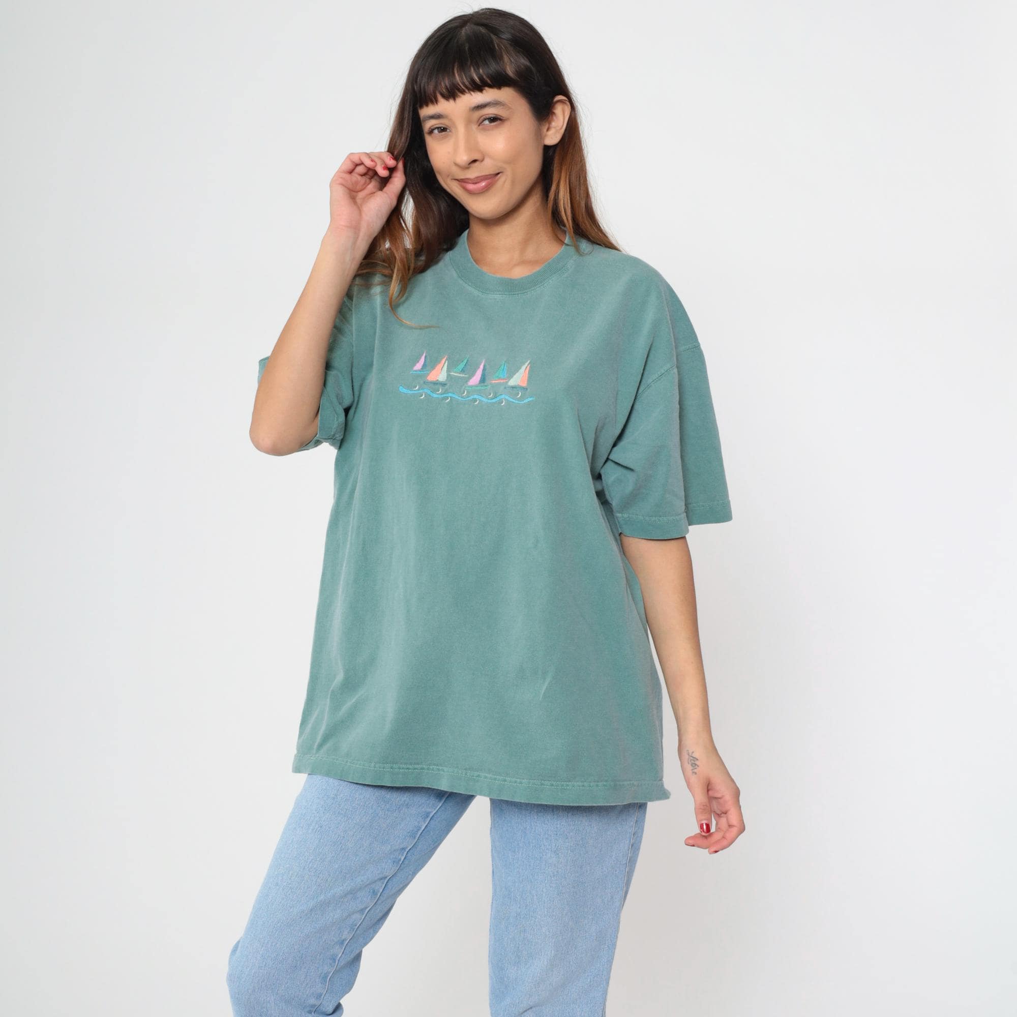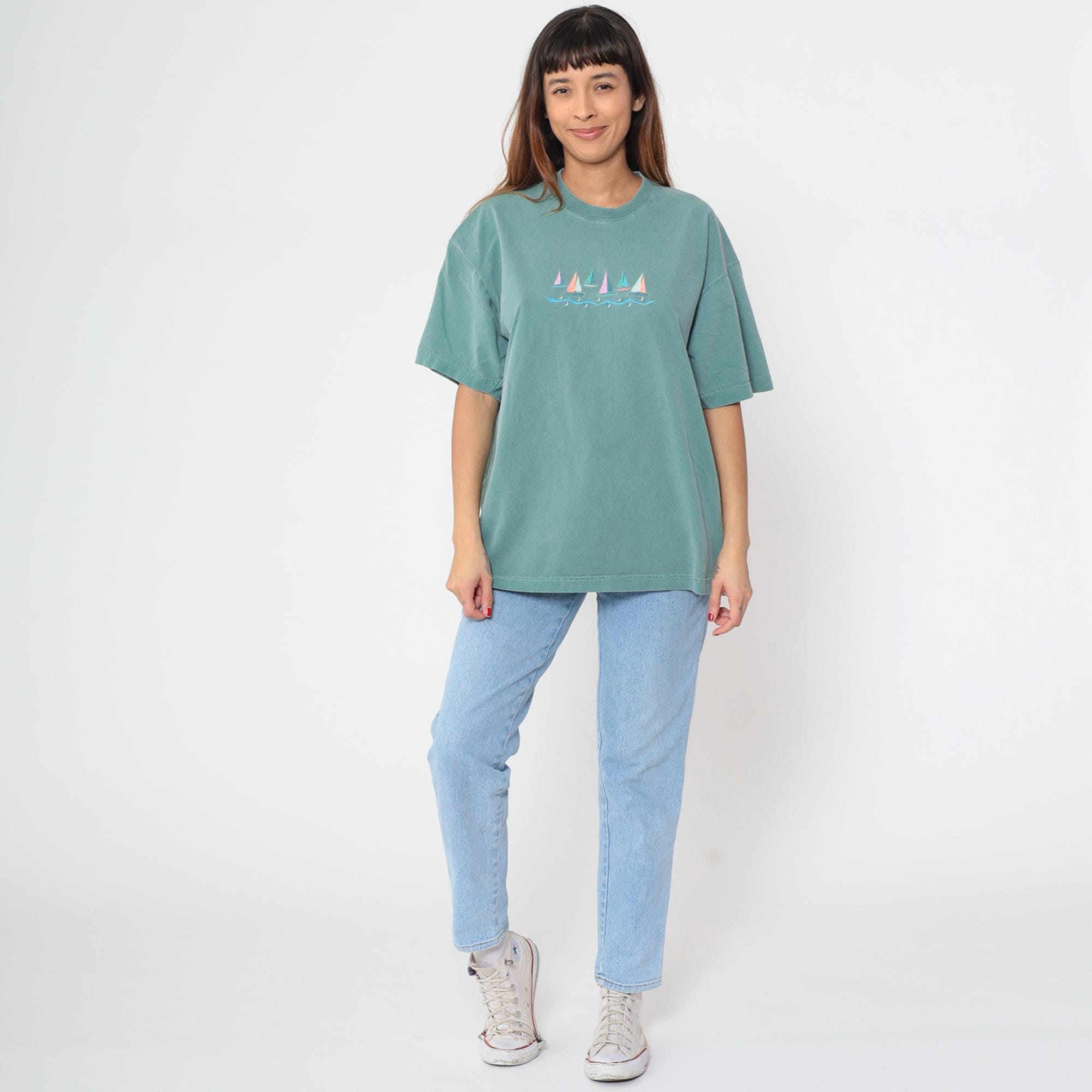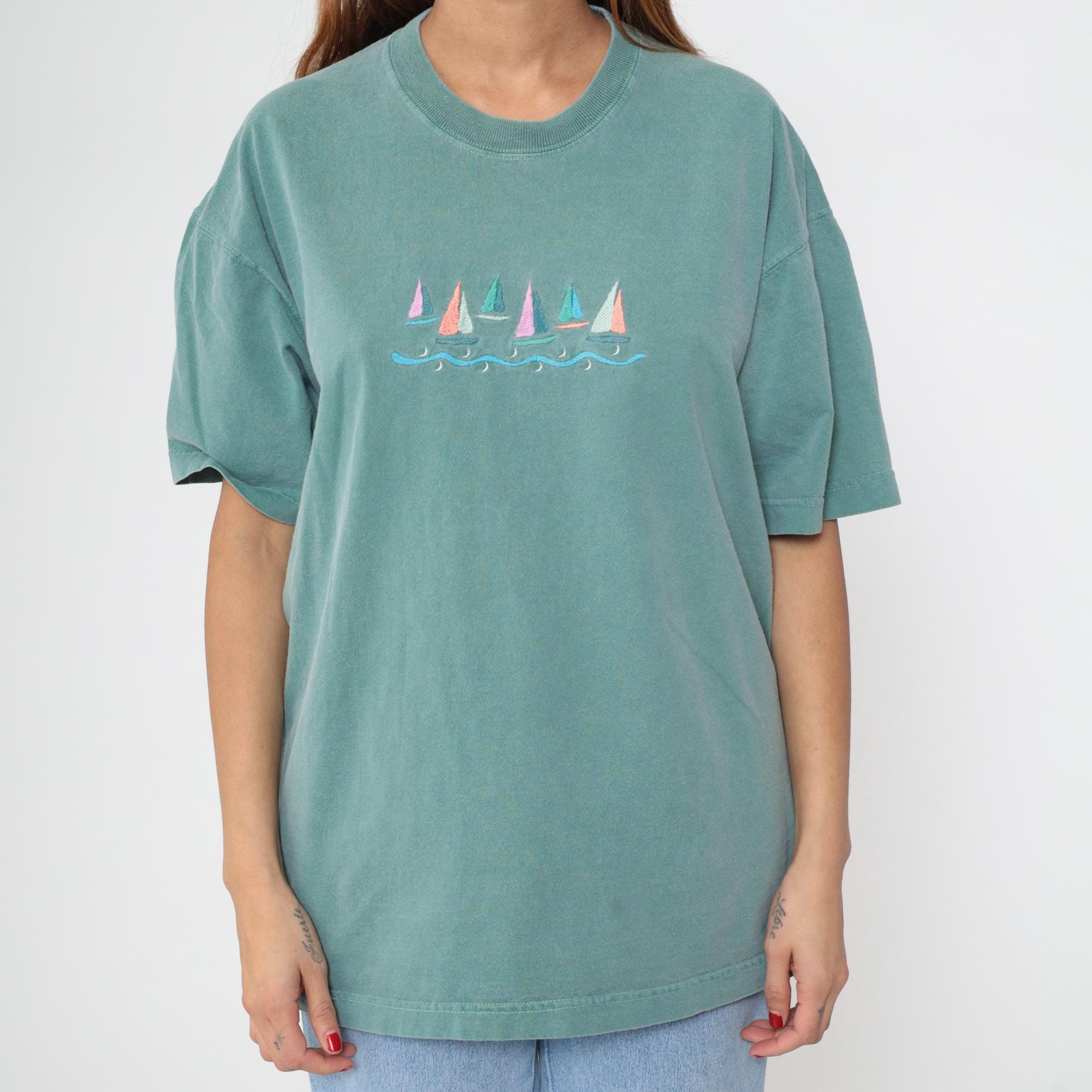 90s seafoam green t-shirt with embroidered sailboat design across the chest, featuring pink, coral, teal, lavender, white, and orange sails above blue wave embroidery. Crew neckline and short sleeves.