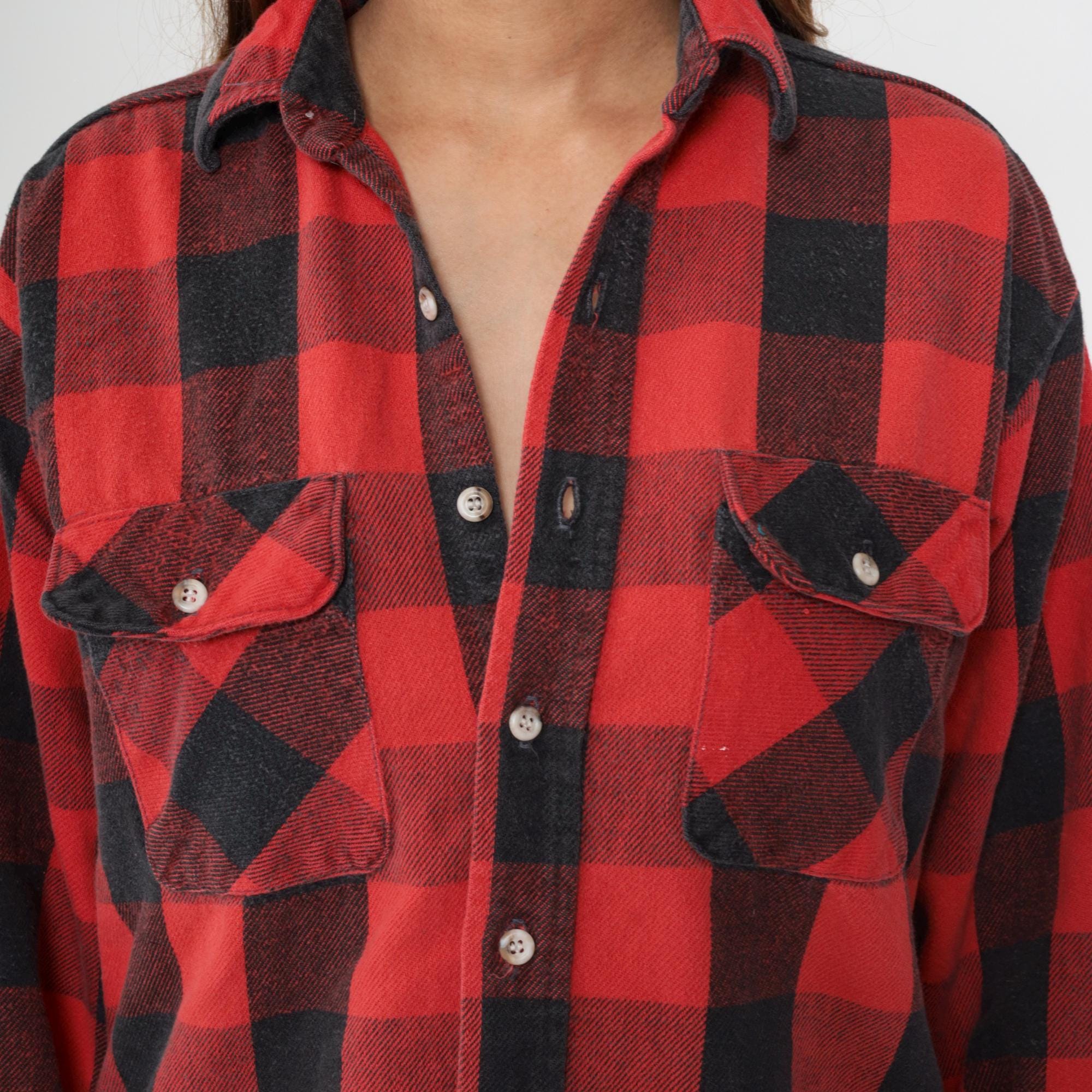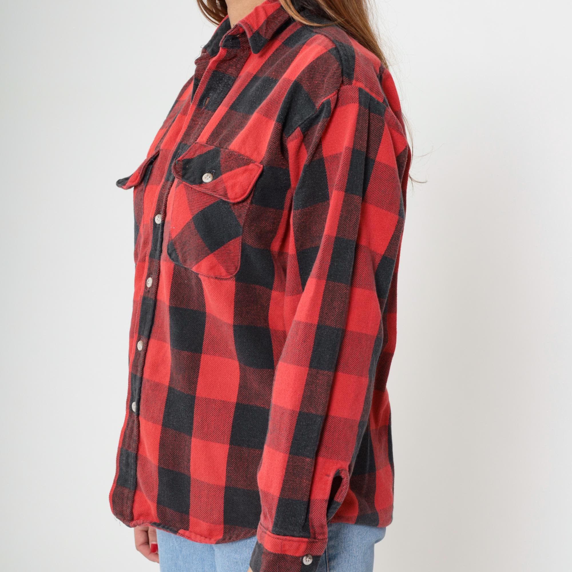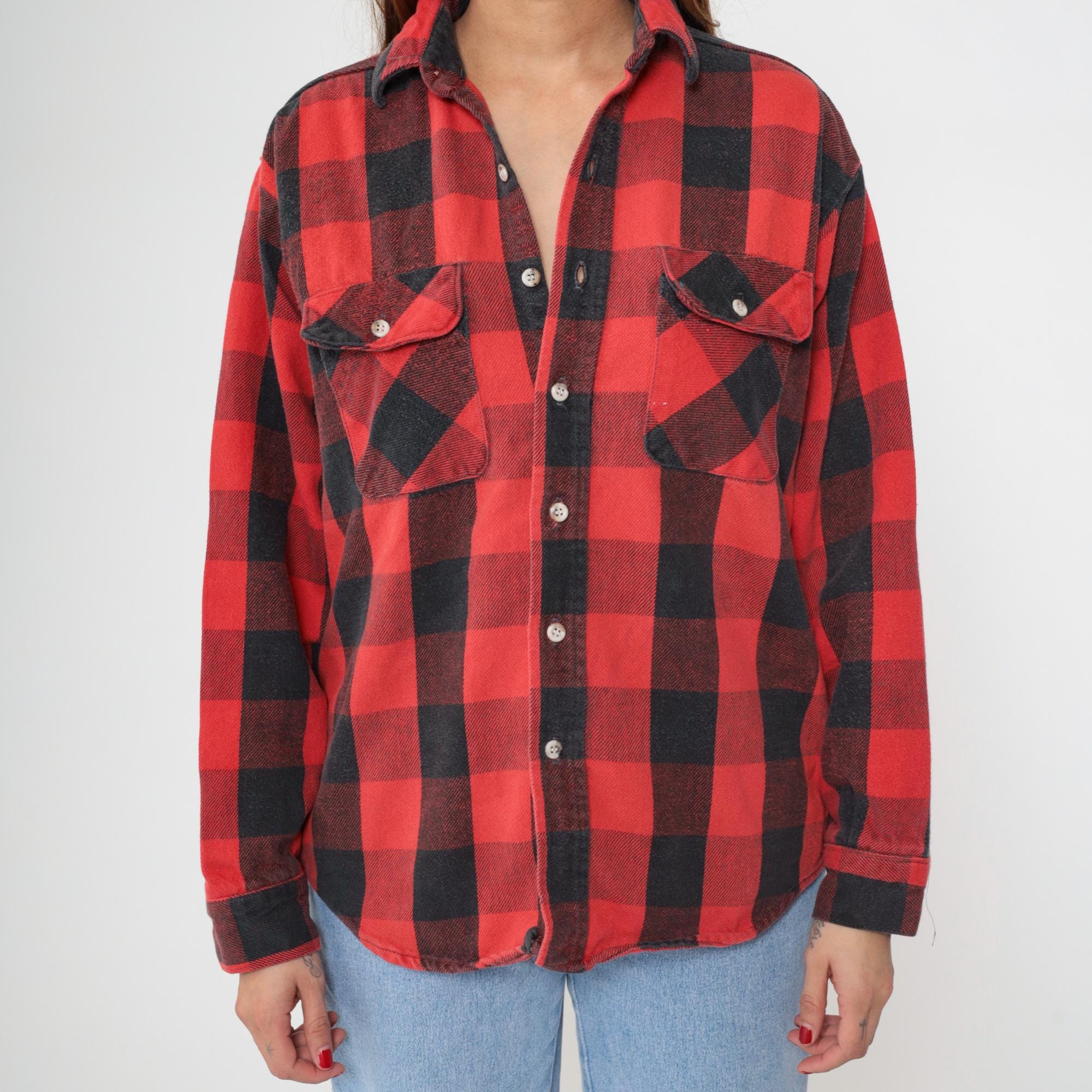 90s red and black buffalo plaid flannel shirt with button front closure and two chest pockets with button flaps. Long sleeves with button cuffs, pointed collar, white buttons throughout.