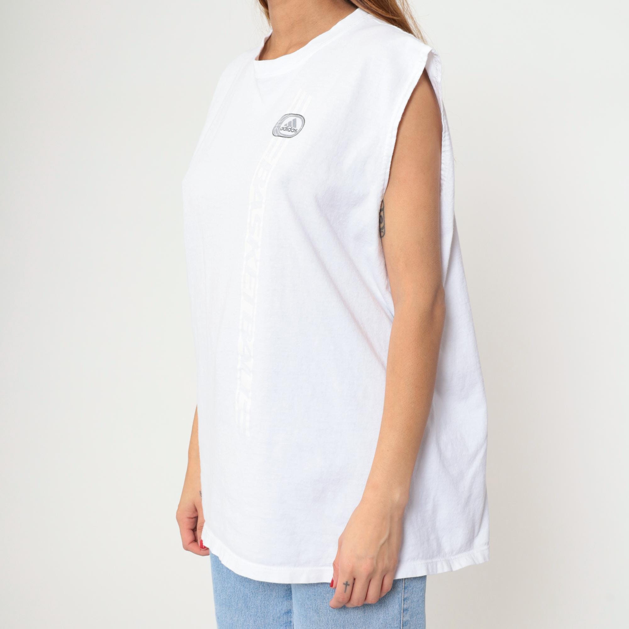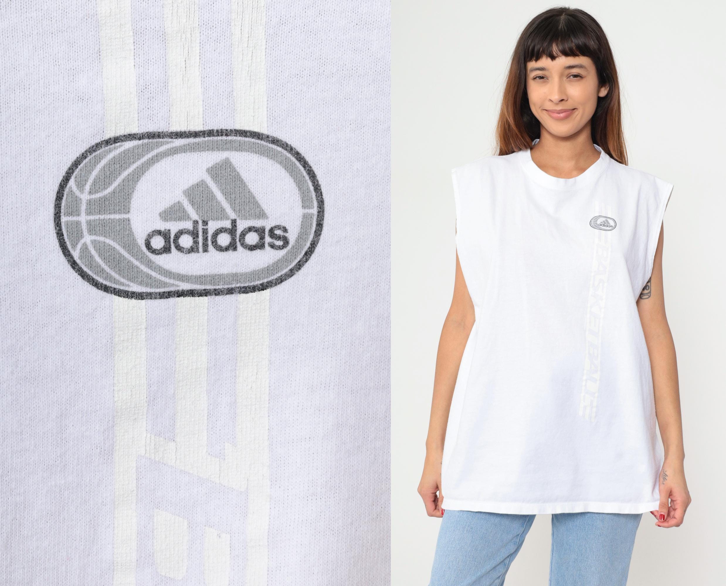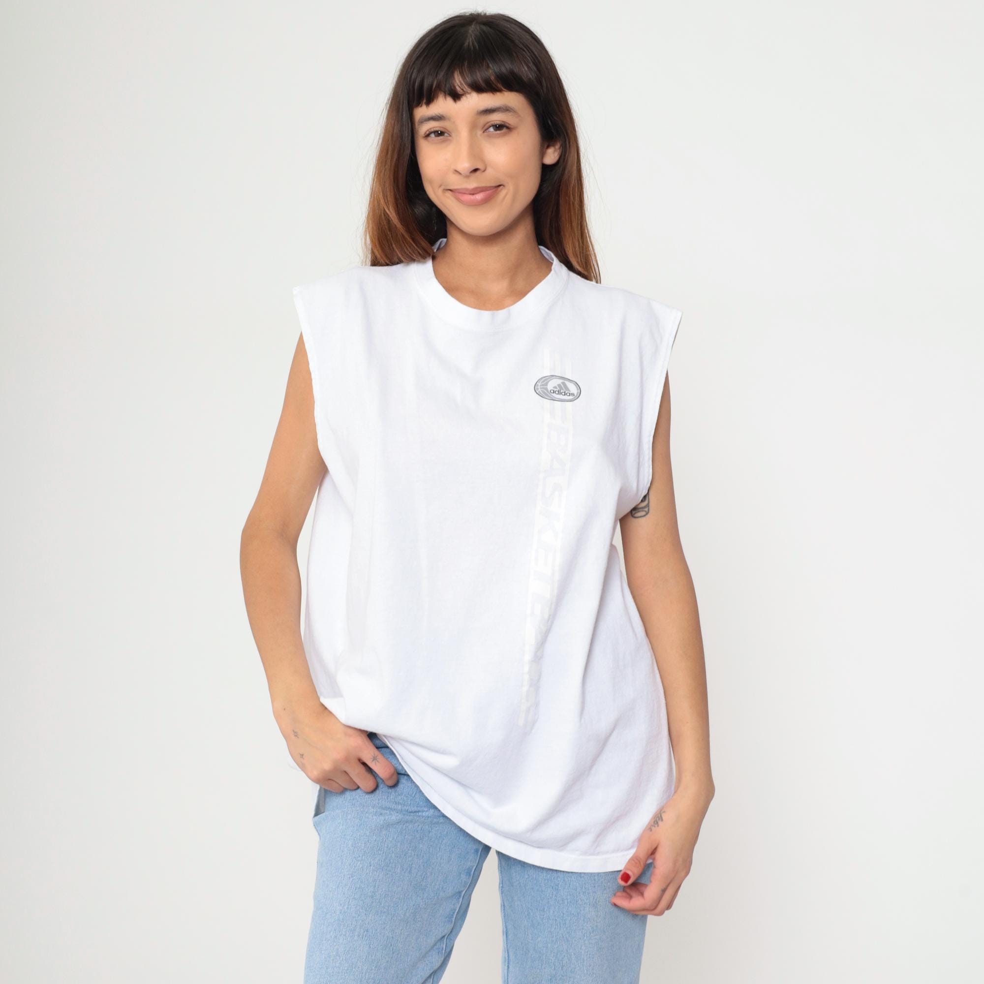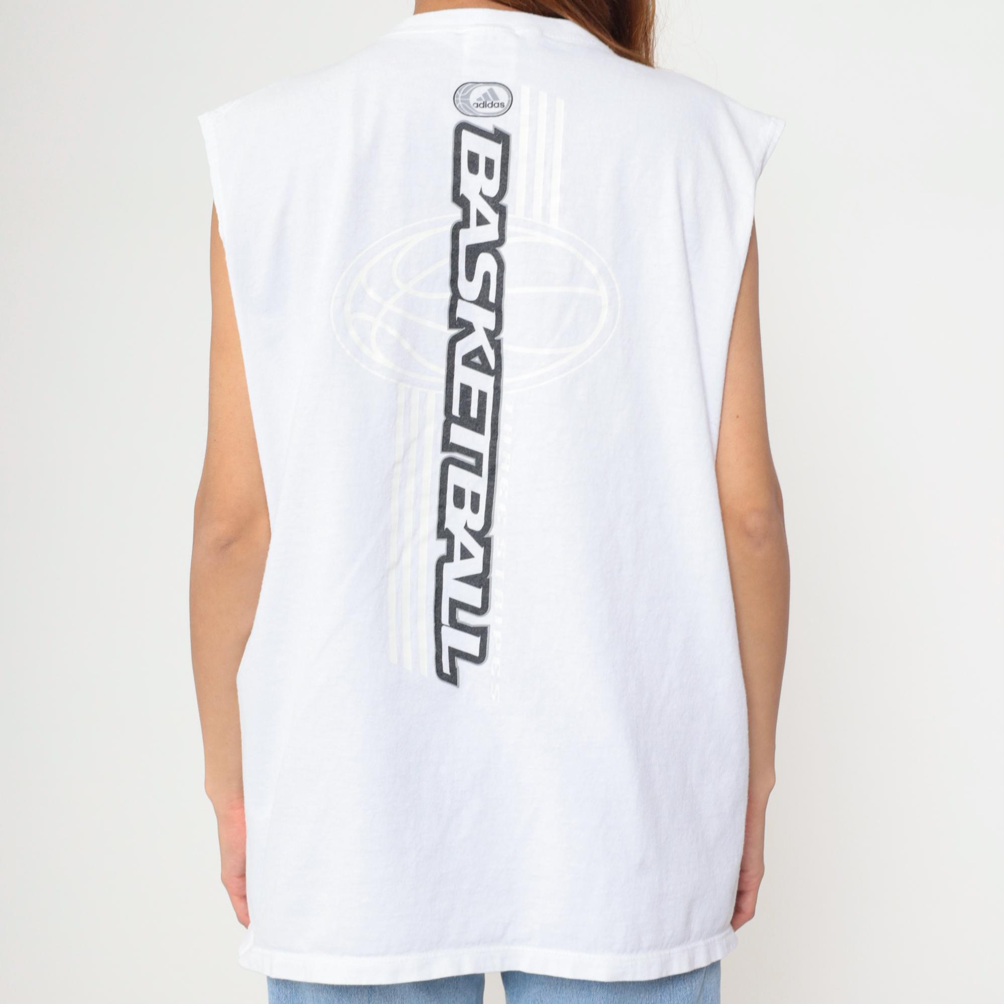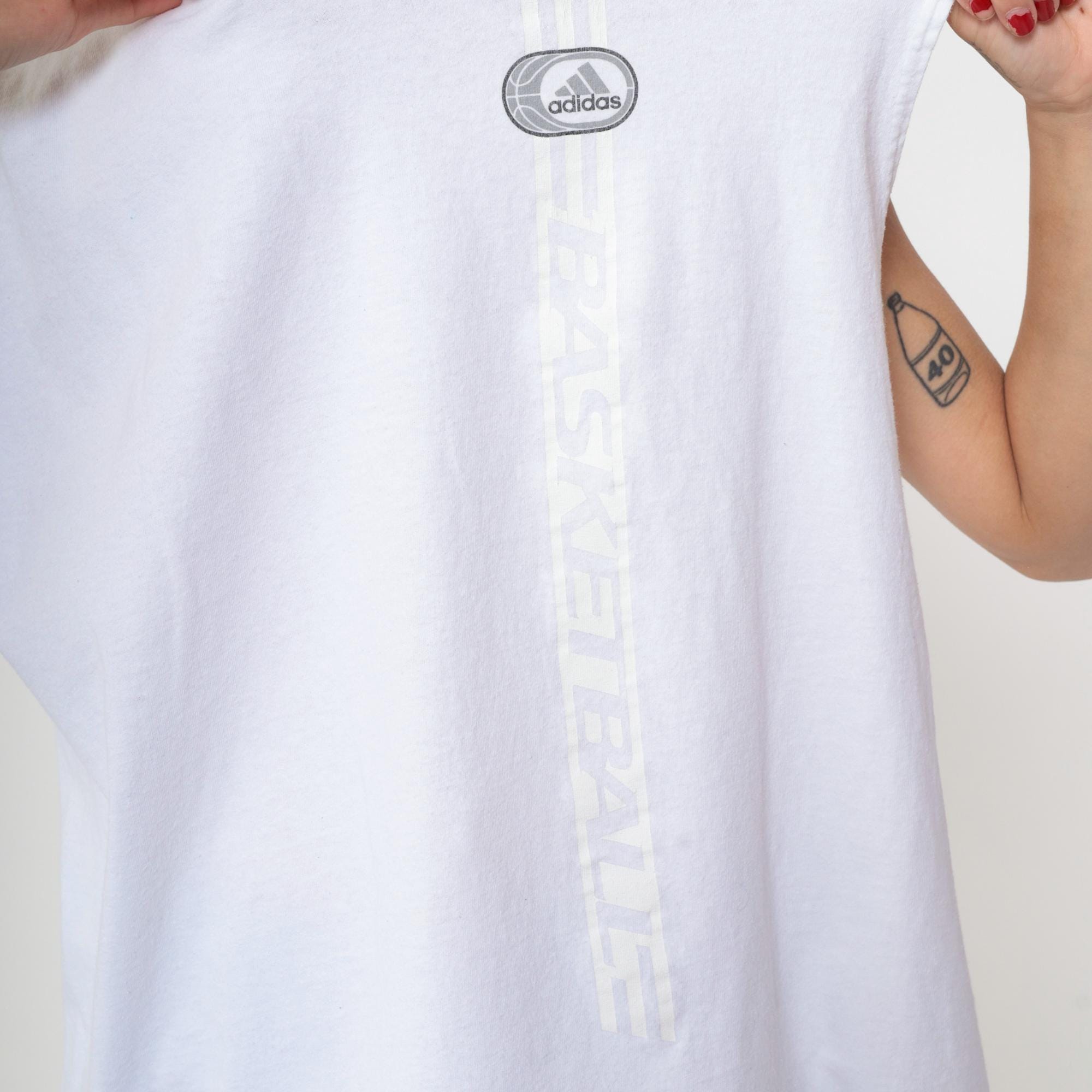 Y2k white sleeveless basketball tank from Adidas with "BASKETBALL" text running vertically down the center back in dark gray outlined letters. Small oval Adidas logo on upper back and left chest, crew neckline, muscle tee cut with dropped armholes.