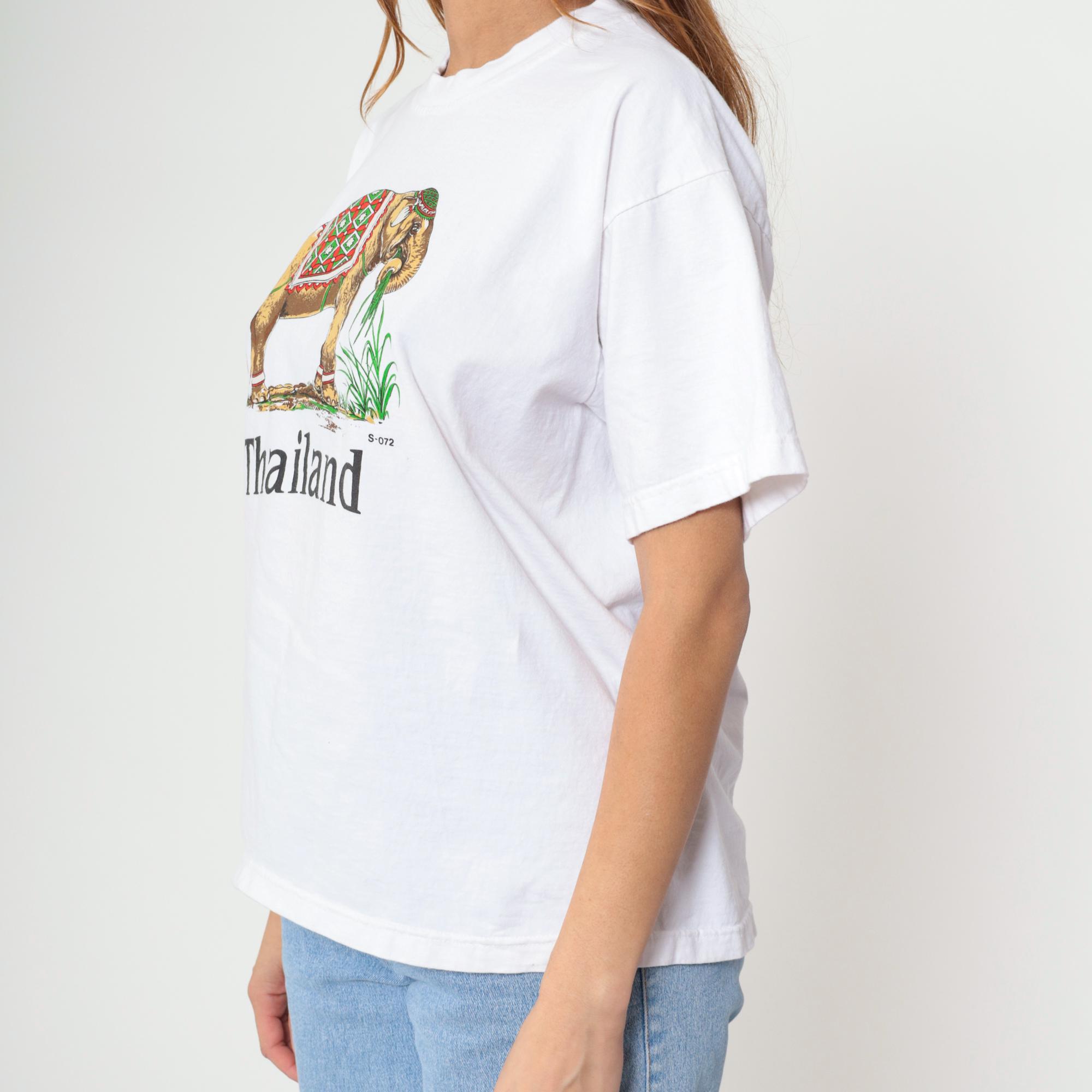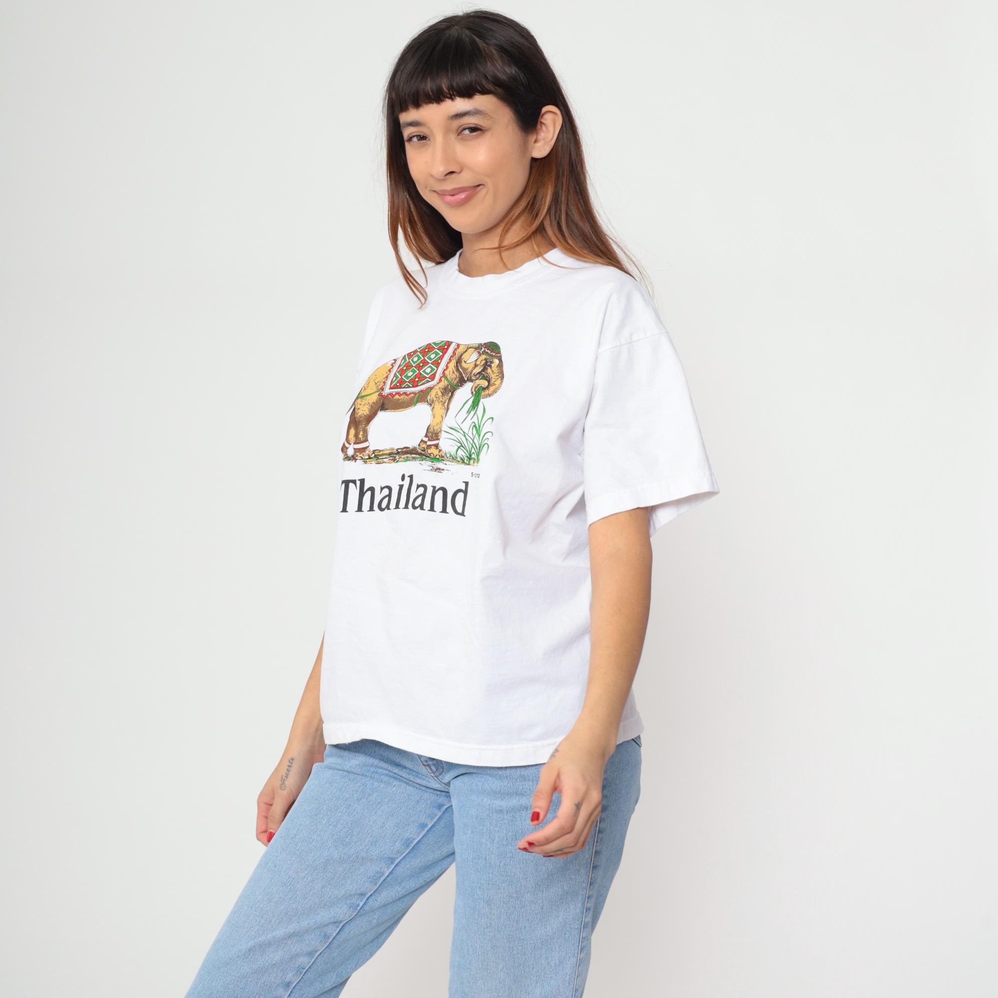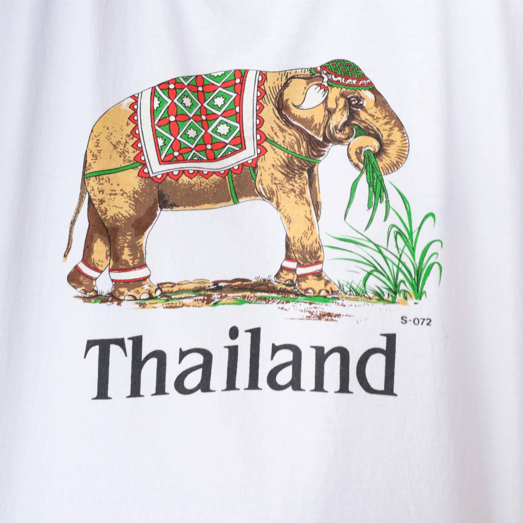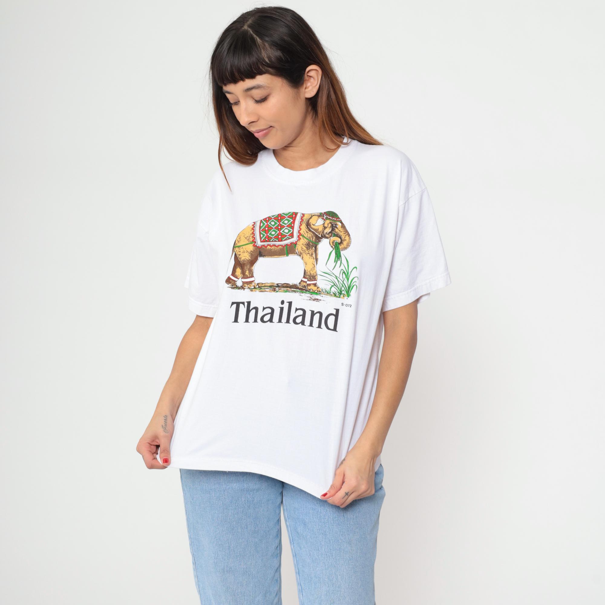 Y2K white t-shirt with Thailand elephant graphic across the front. Elephant features ornate red and green diamond-pattern covering and holds green plant in trunk, with "Thailand" text below the design.