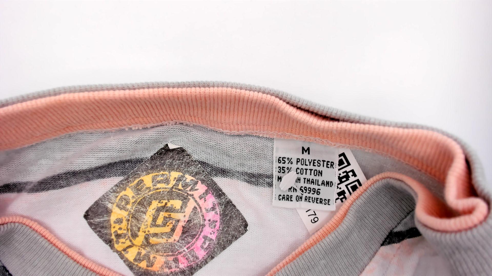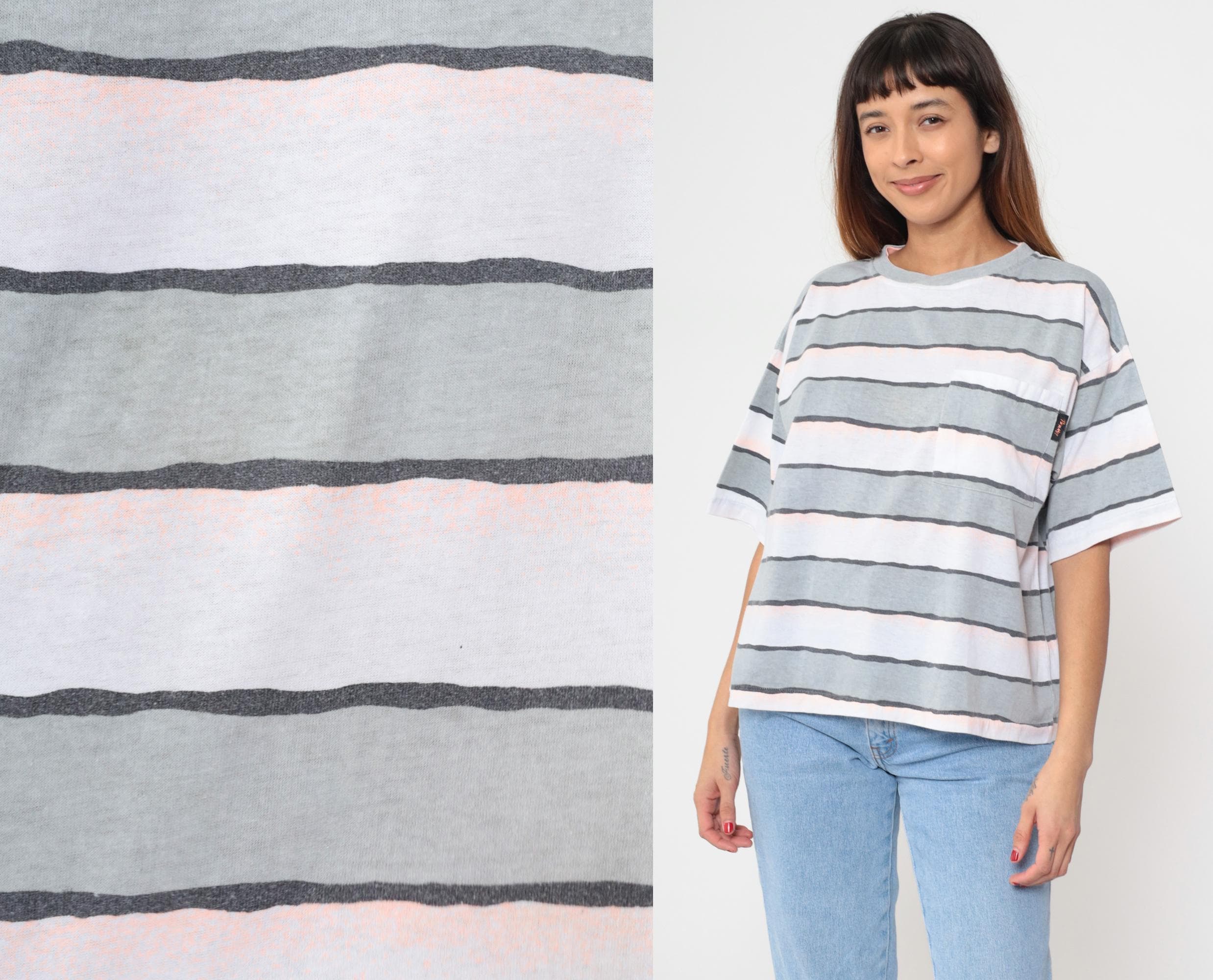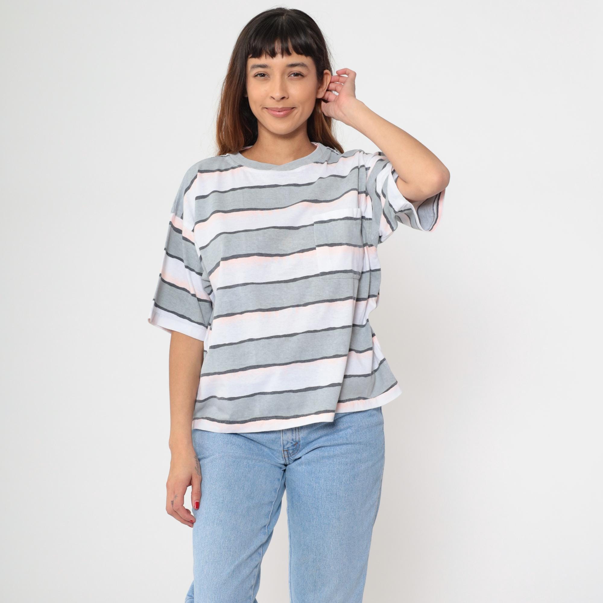 90s striped t-shirt in white, gray, pale pink, and charcoal horizontal stripes. Relaxed boxy fit with short sleeves, crew neckline with ribbed trim.