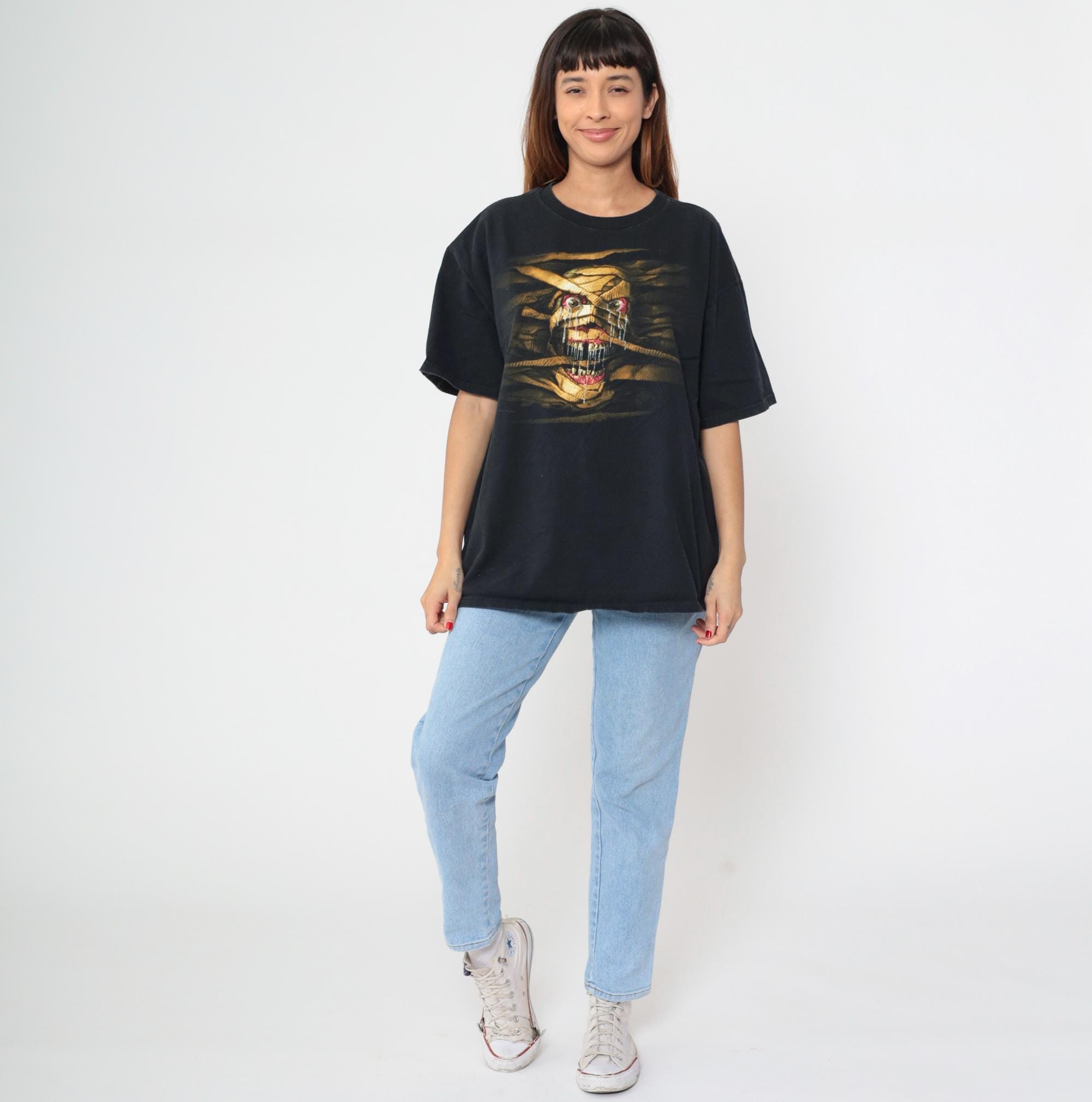 90s black t-shirt from Universal Studios Halloween Horror Nights III in 1999. Front shows mummy graphic wrapped in bandages with bloodshot eyes and exposed teeth, back reads "I SURVIVED HALLOWEEN HORROR NIGHTS III 1999 AT UNIVERSAL STUDIOS HOLLYWOOD" in yellow text with green spooky graphic.