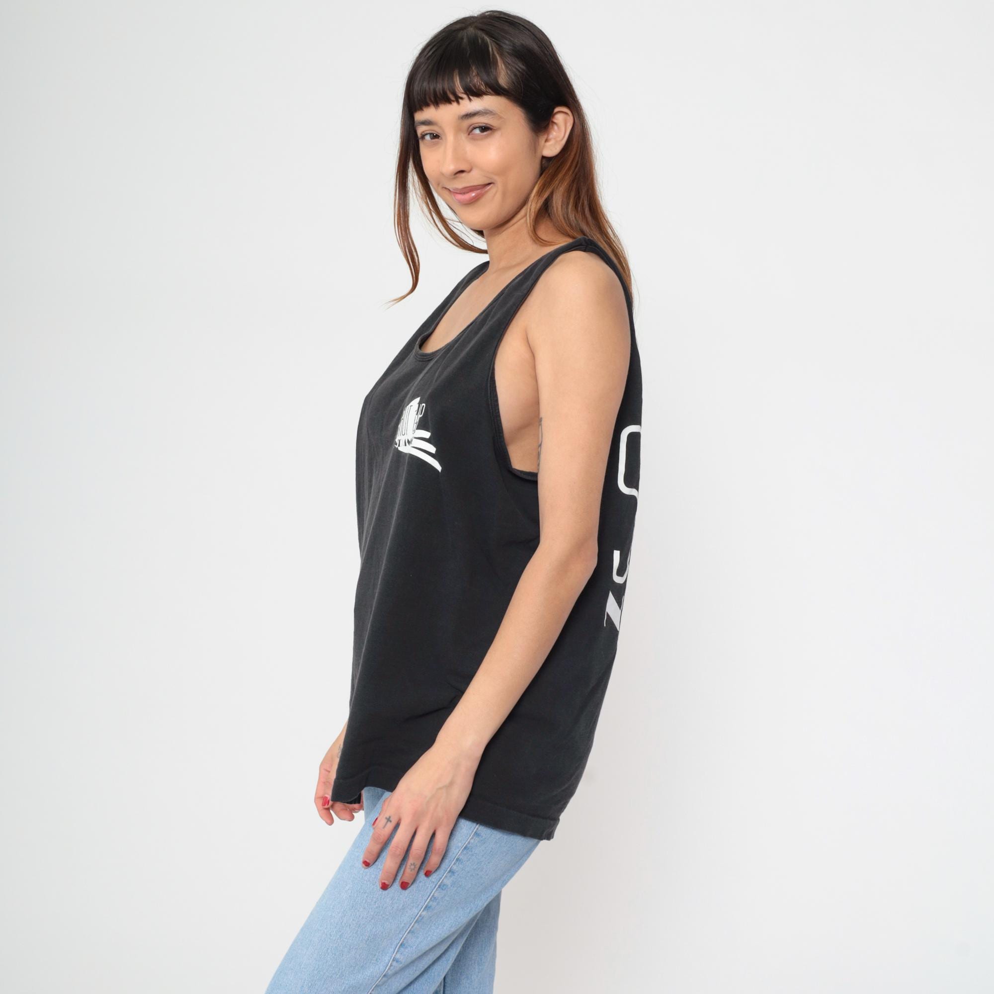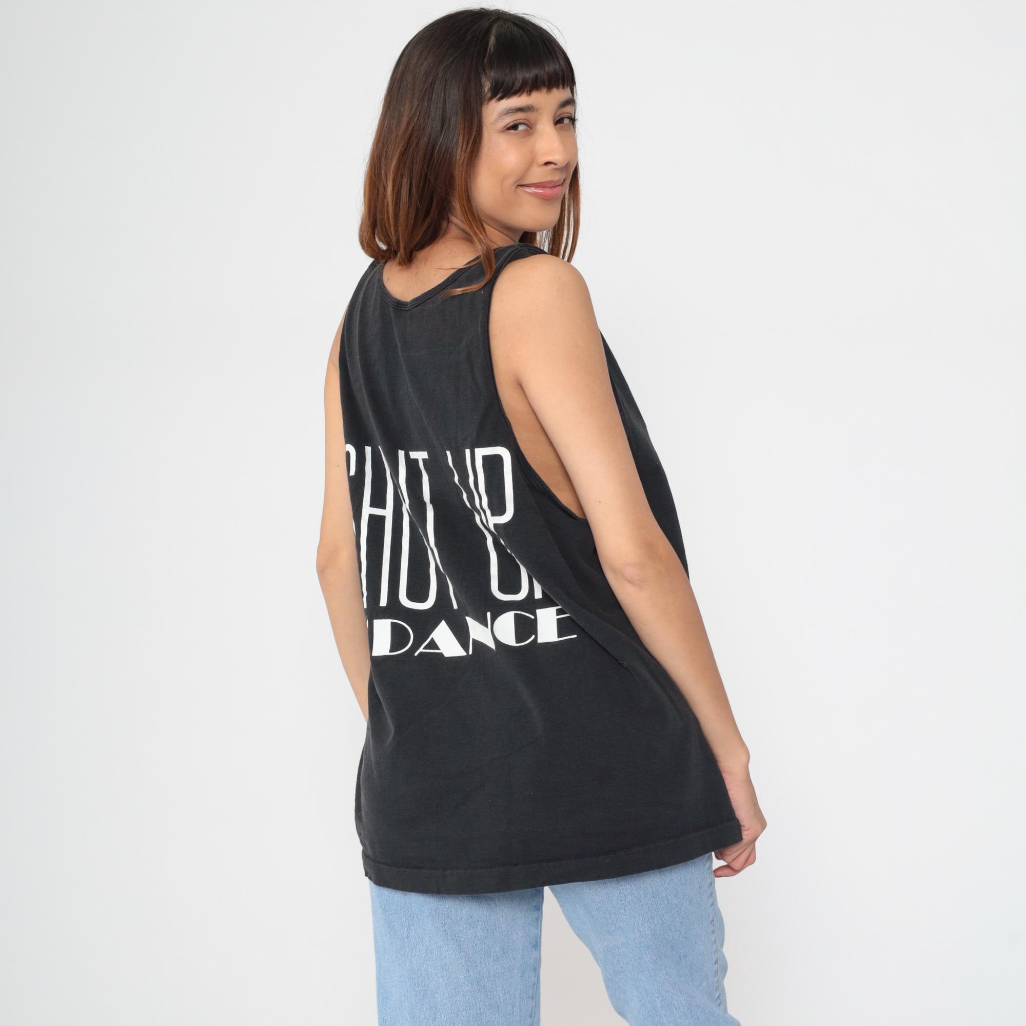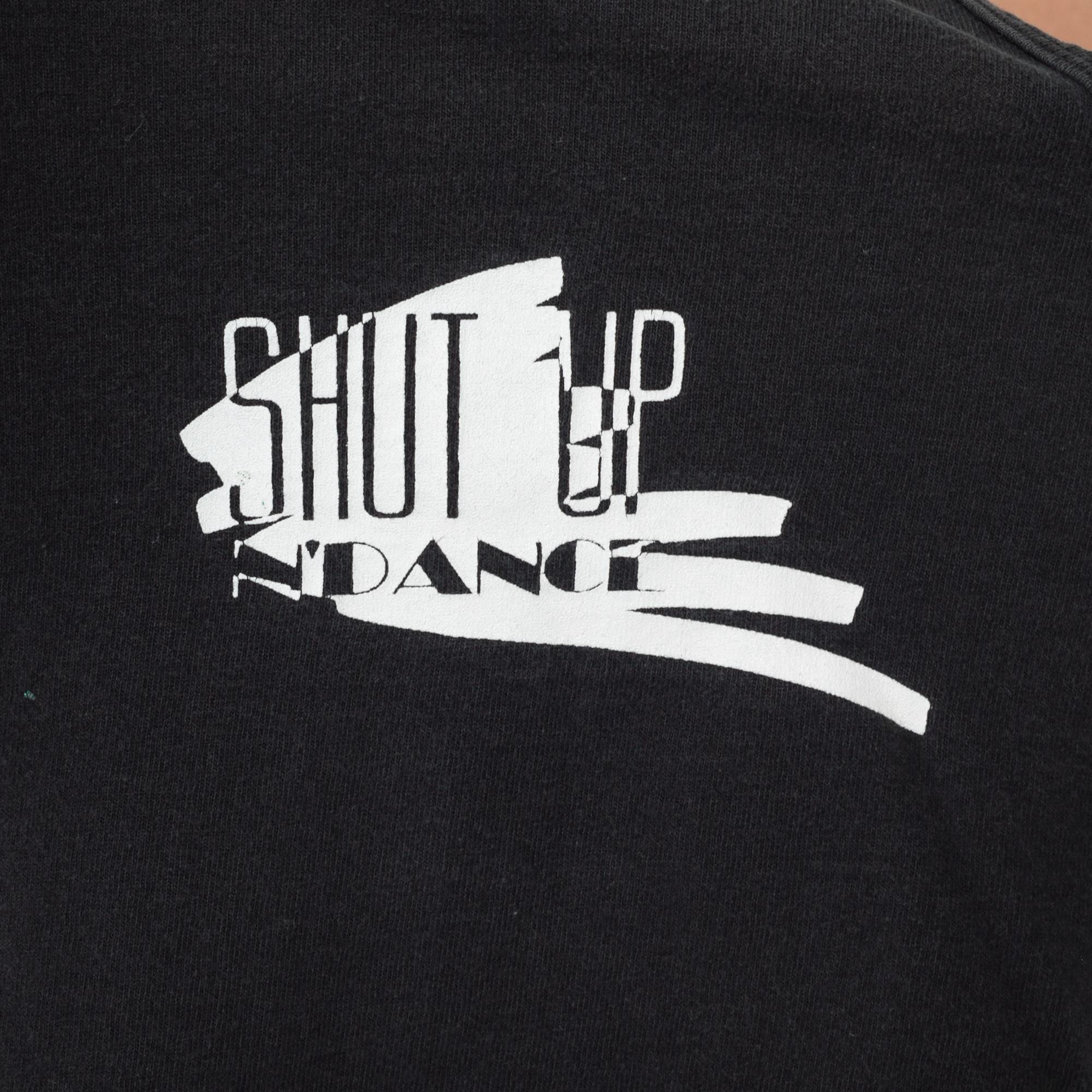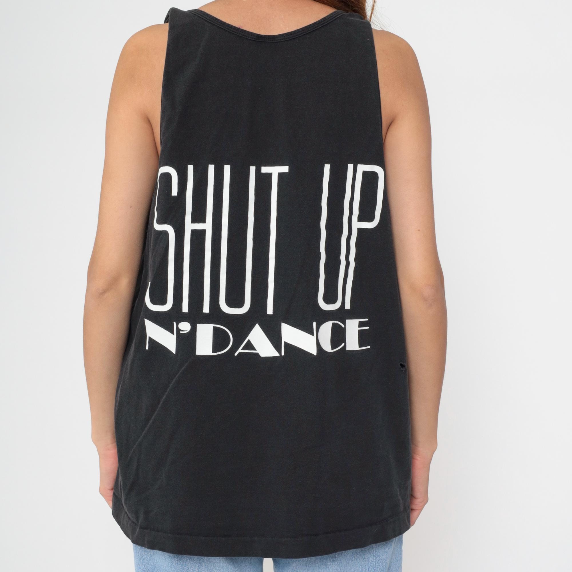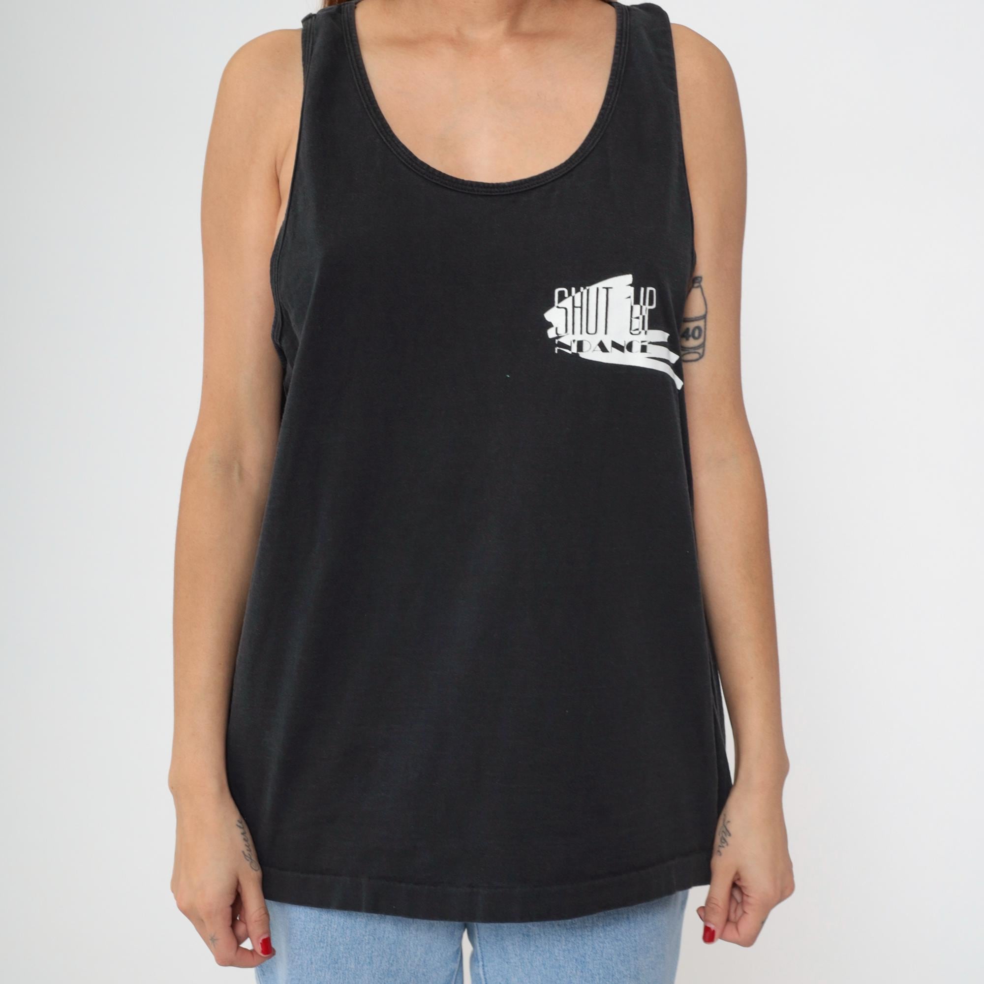 90s black graphic tank top from Fruit of the Loom with "SHUT UP N' DANCE" text printed in white on back and small matching logo on left chest. Standard racerback construction with scoop neckline.