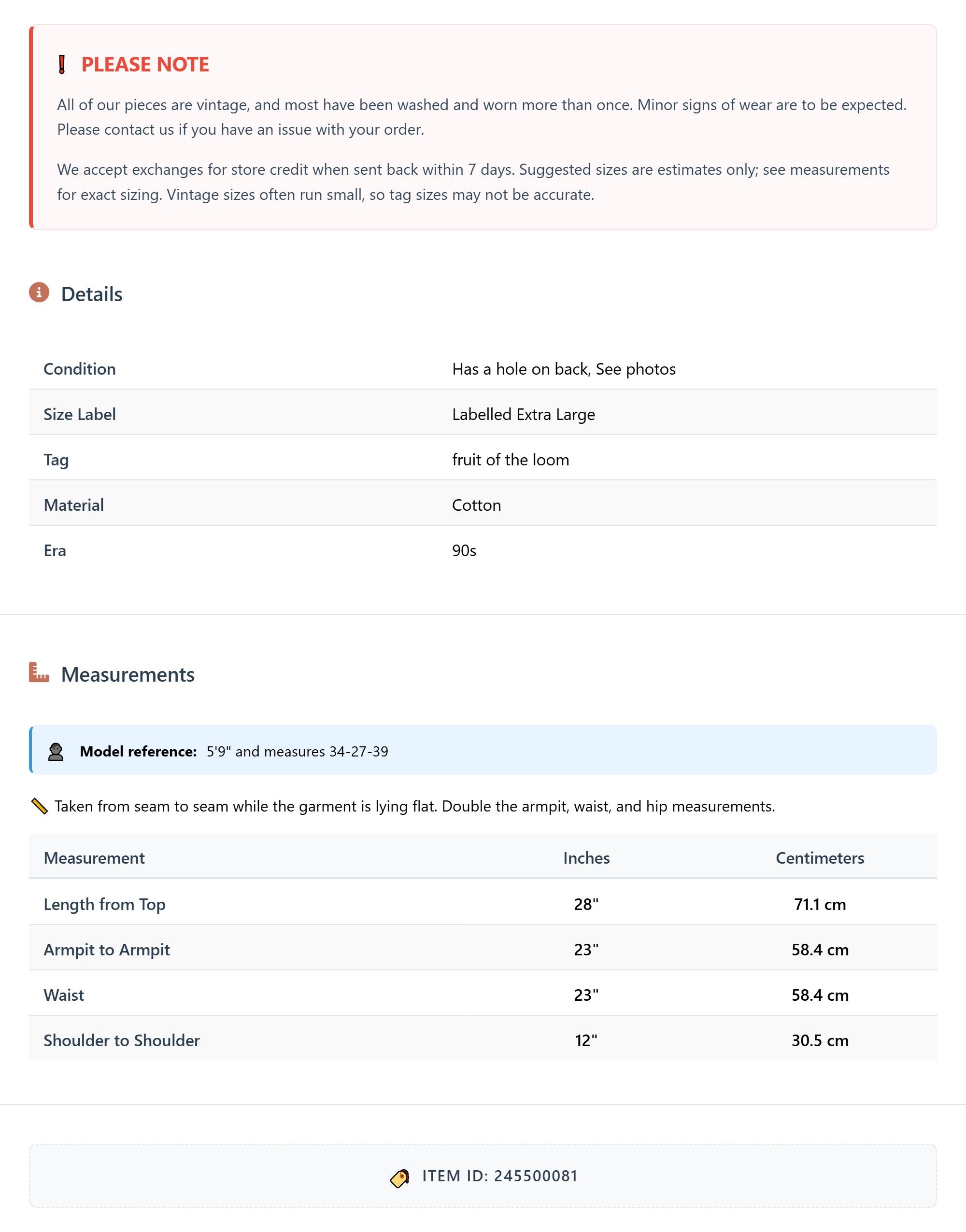 All of our pieces are vintage, and most have been washed and worn more than once. Minor signs of wear are to be expected. Please contact us if you have an issue with your order. We accept exchanges for store credit when sent back within 7 days.