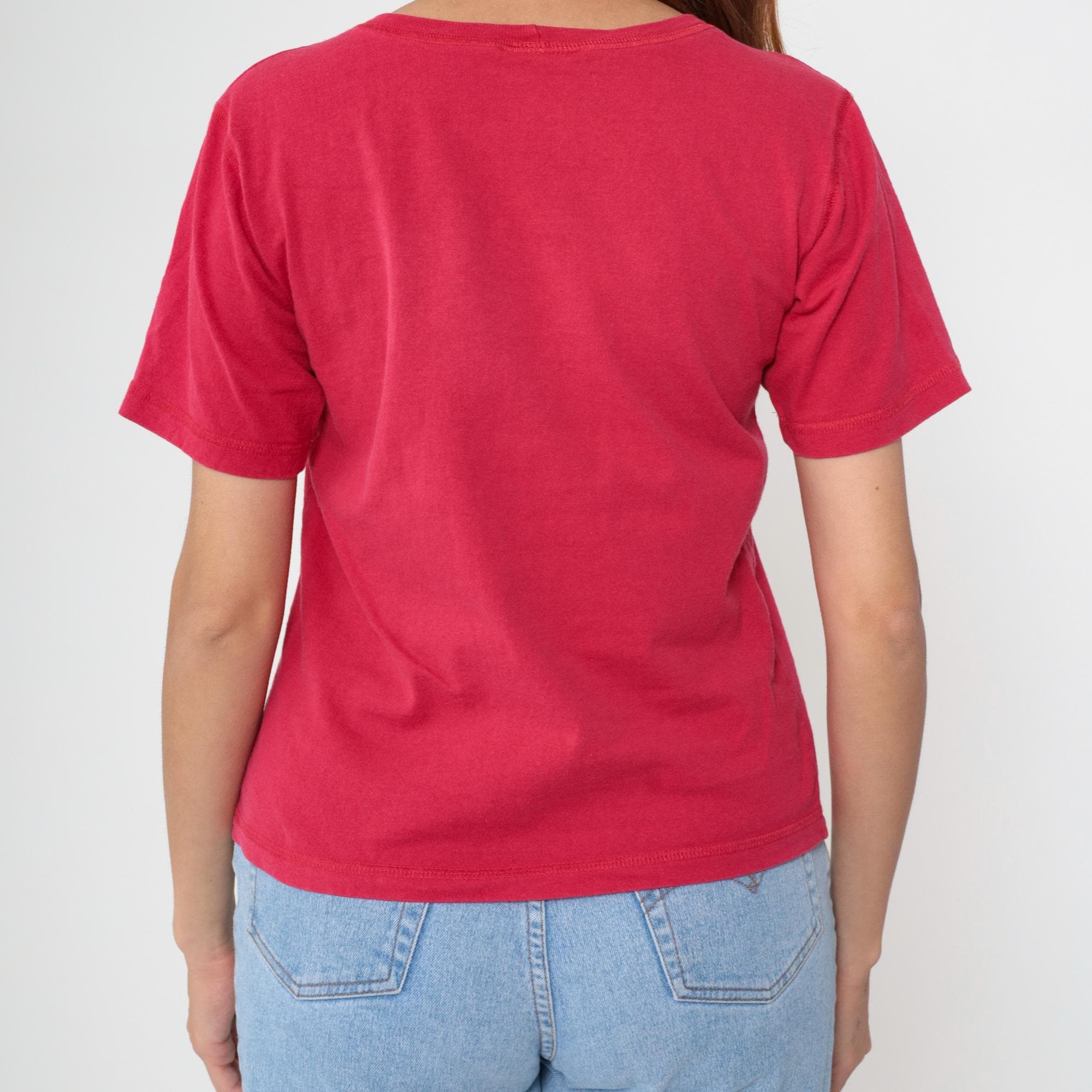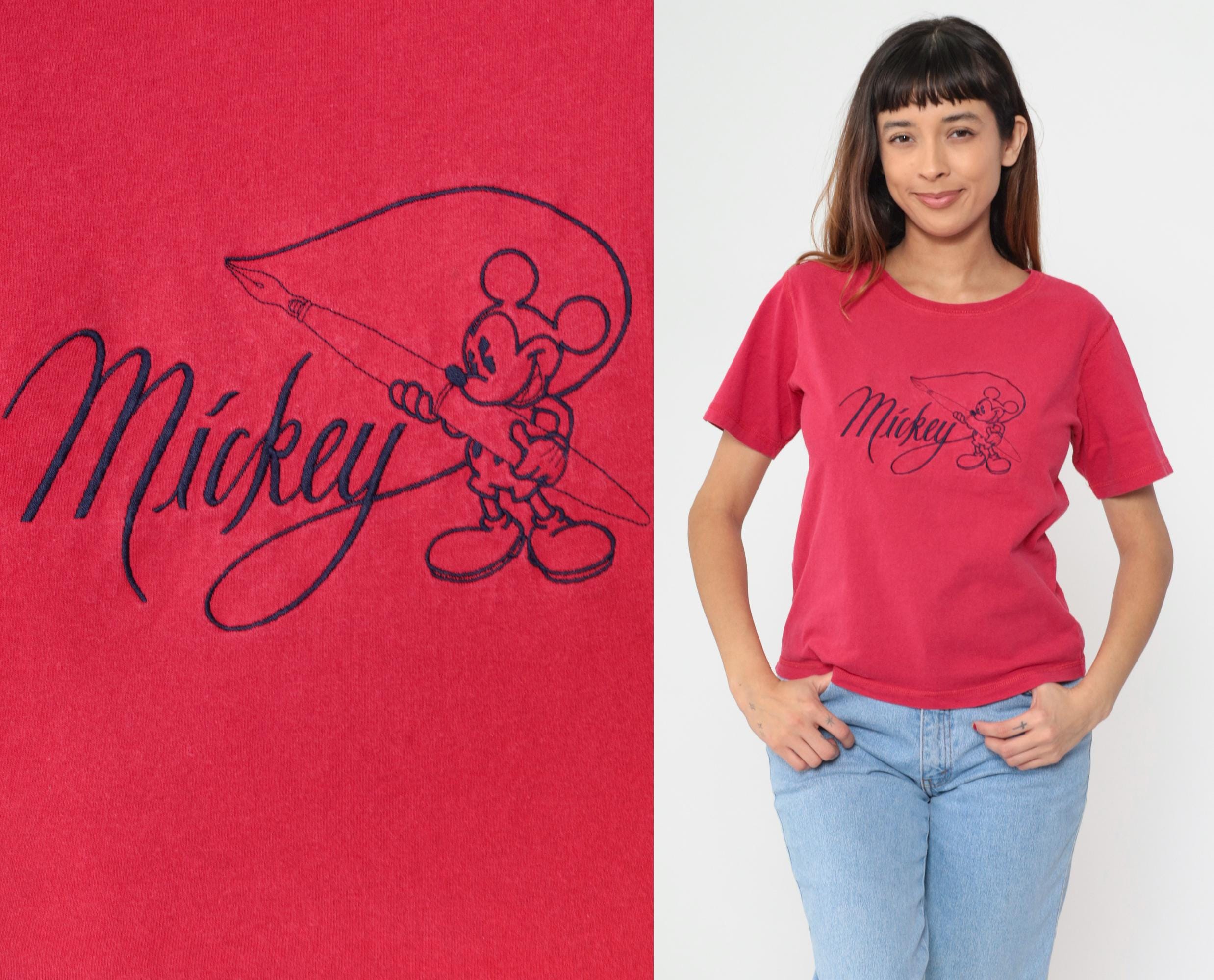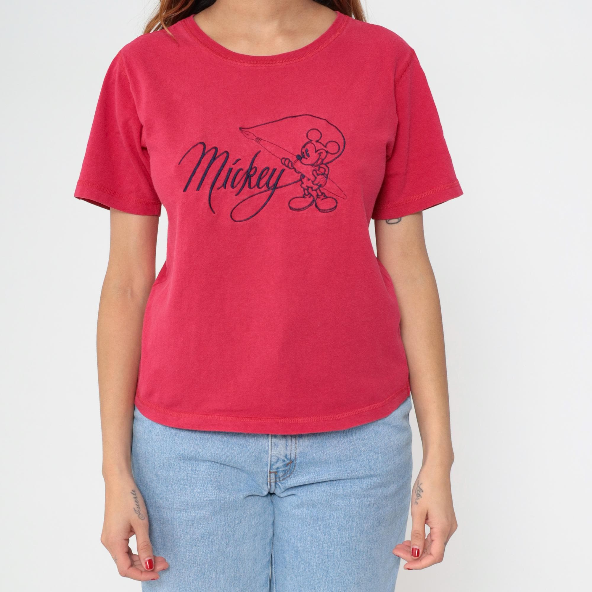 90s red Mickey Mouse t-shirt with graphic of Mickey holding a fishing rod and "Mickey" in script lettering across the front. Crew neckline and short sleeves in faded red cotton. From mickey & co.