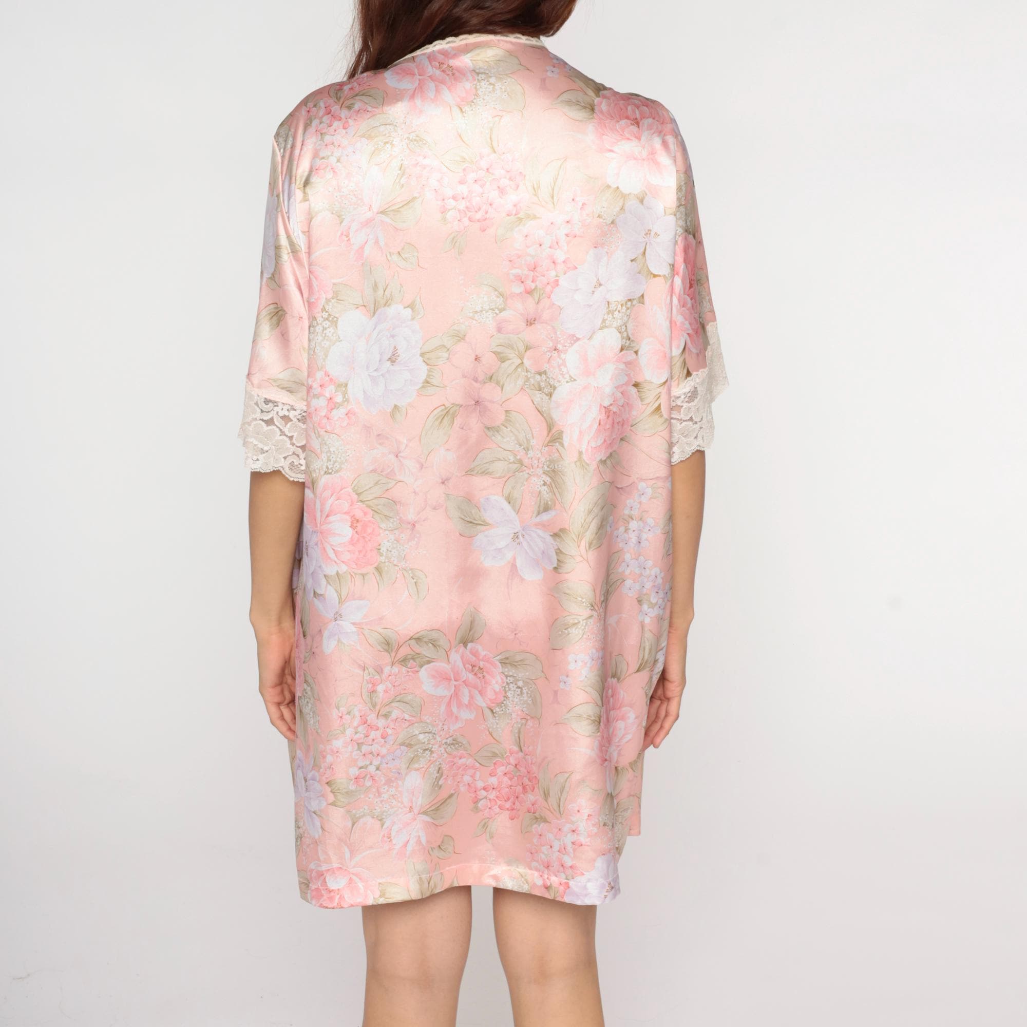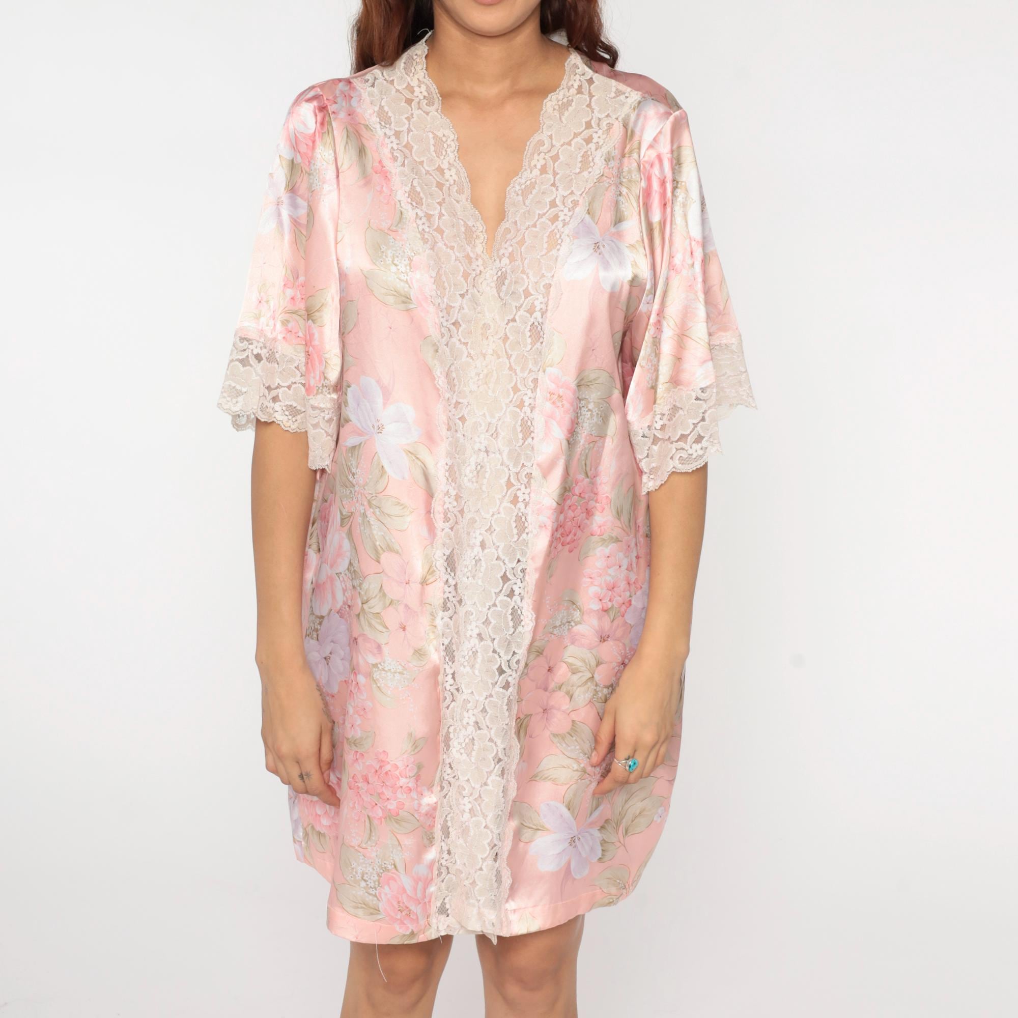 90s pink floral kimono robe from wendy ann with white and pink flowers and green leaves across the fabric. Open front with cream lace trim along edges and sleeve hems, short kimono-style sleeves.