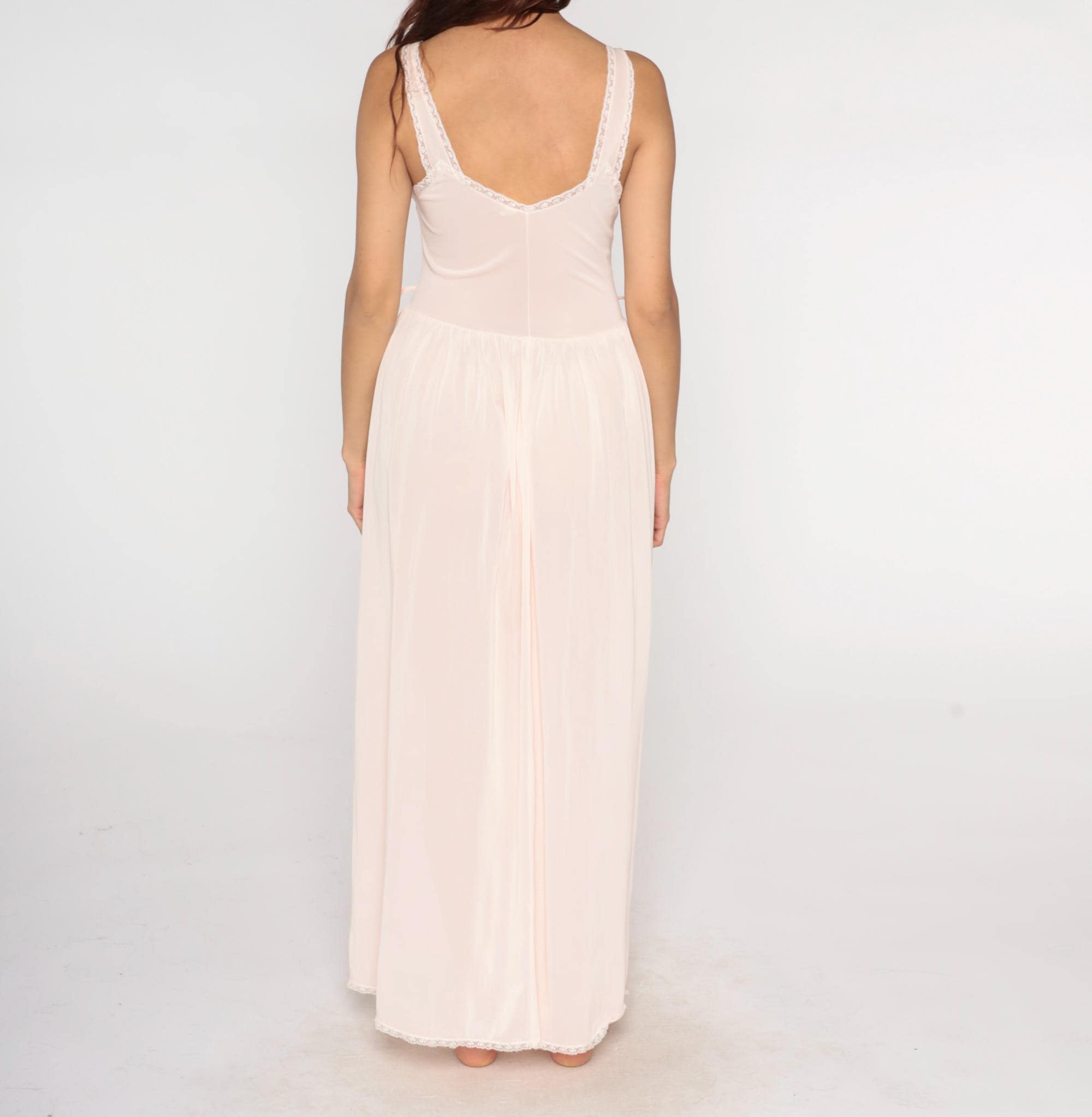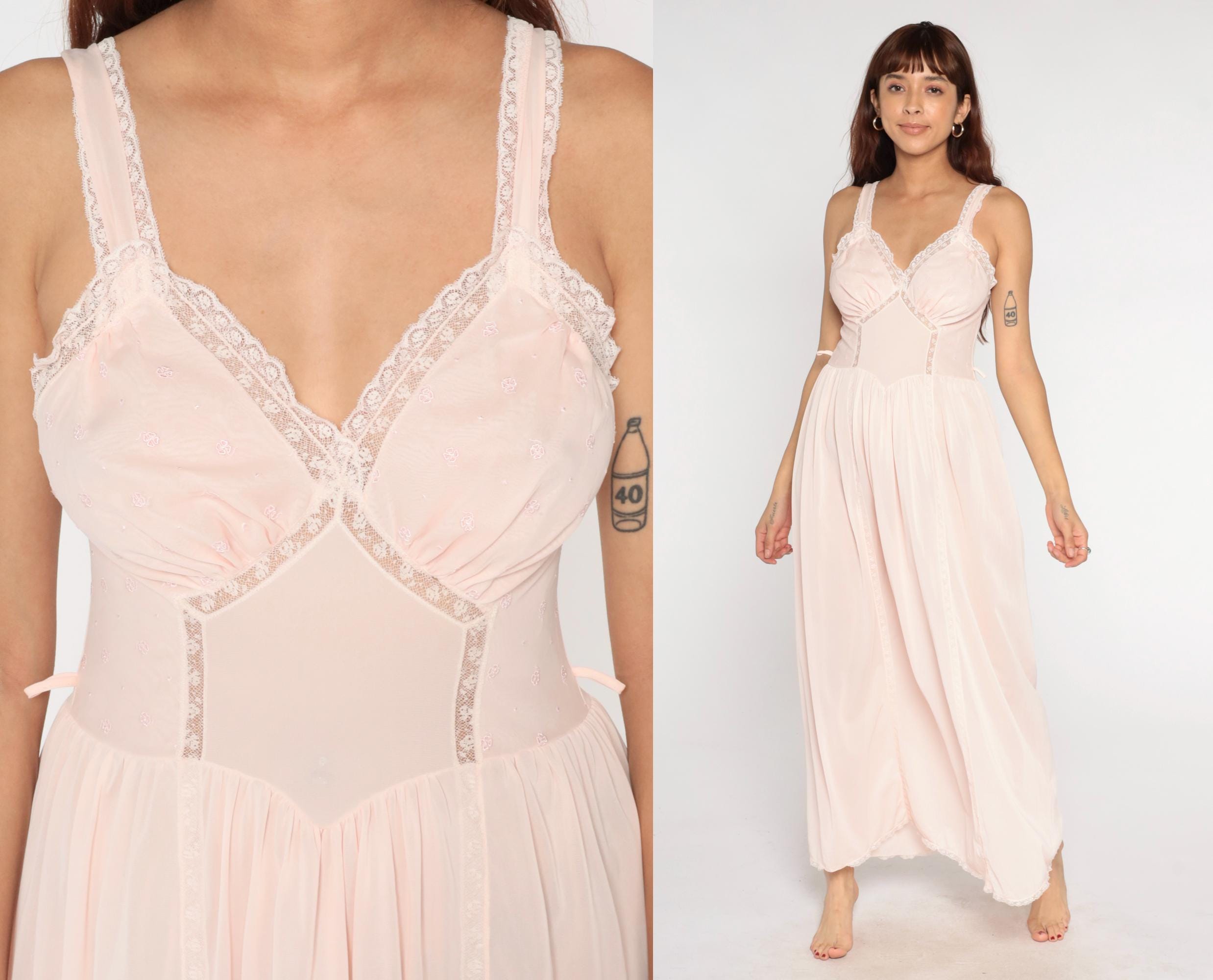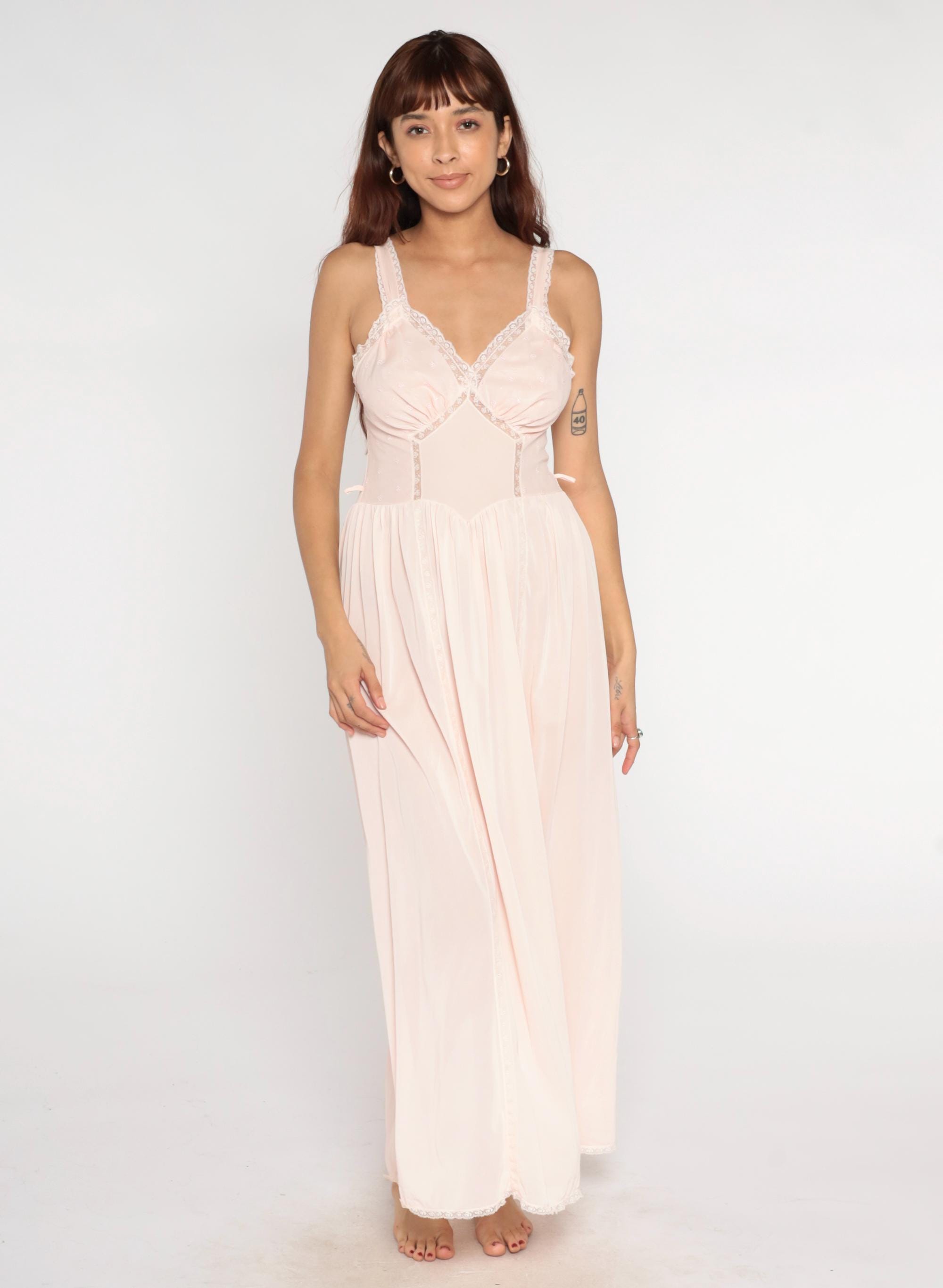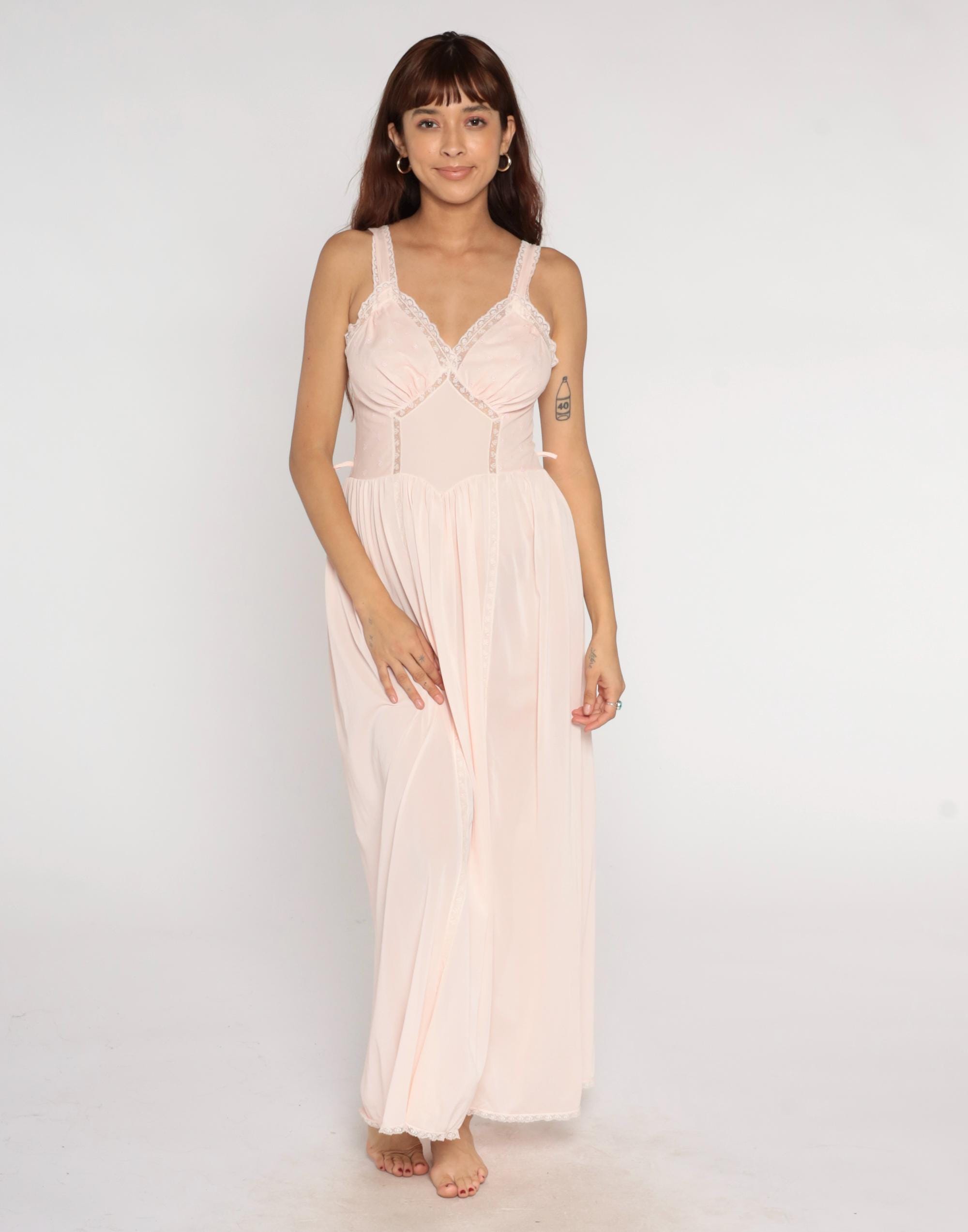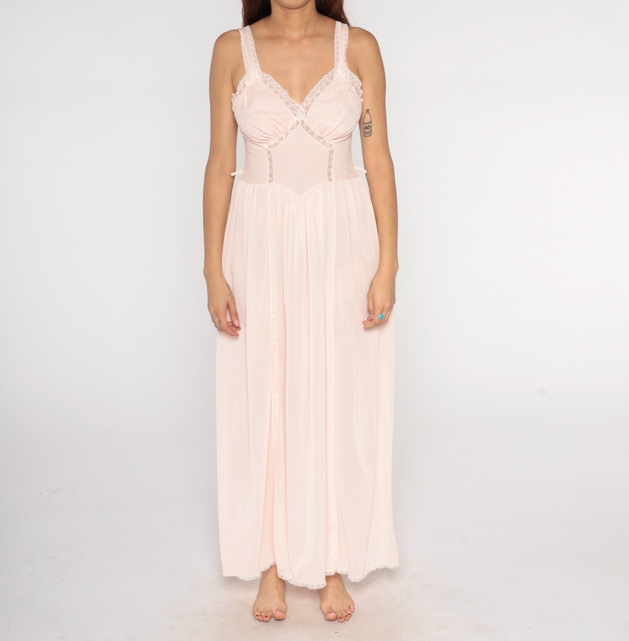70s pale pink nightgown from Artemis in sheer nylon with white lace trim on straps and V-neckline. Structured bust cups with gathered bodice detail, empire waist seam, full gathered maxi skirt. White lace trim on hem.