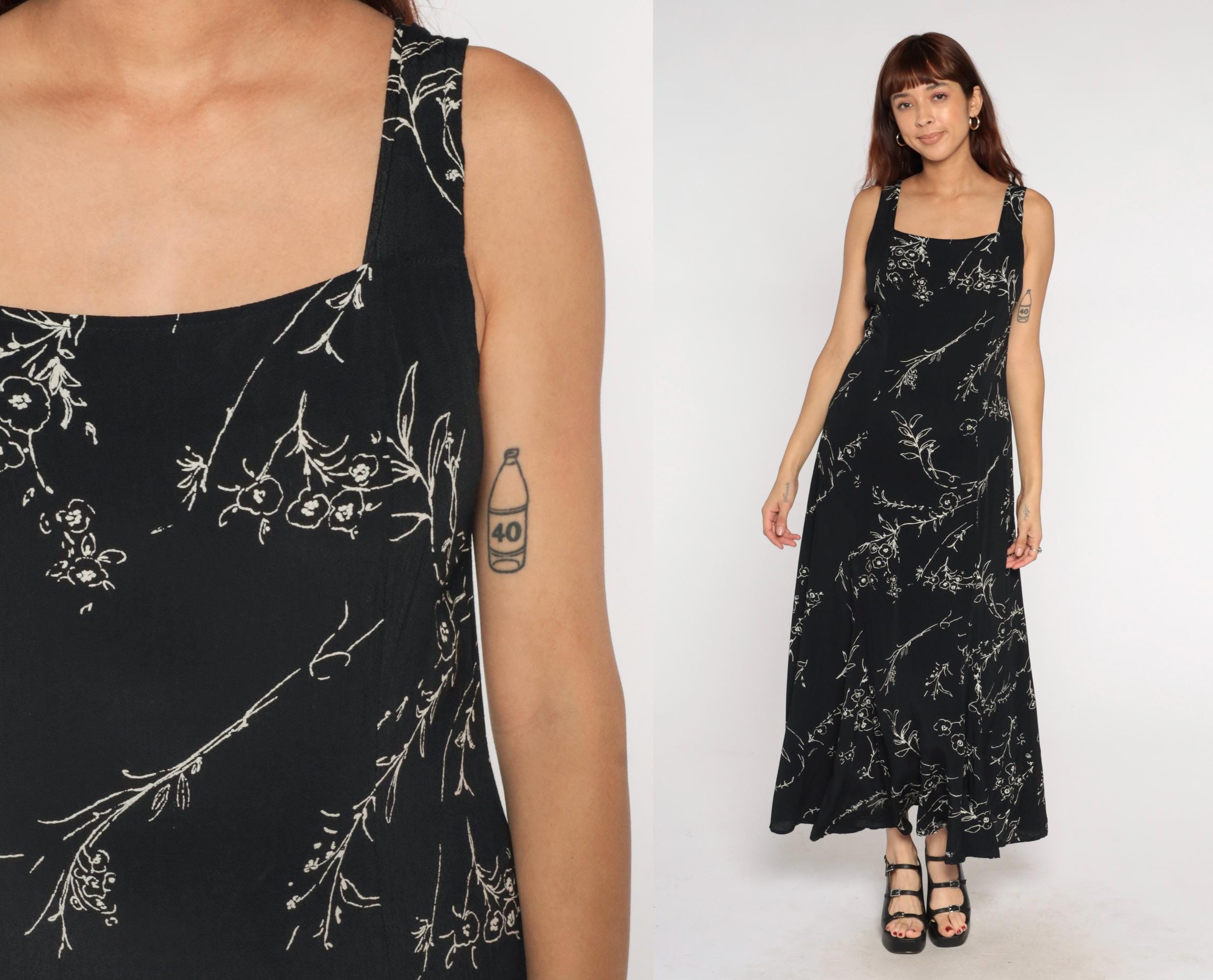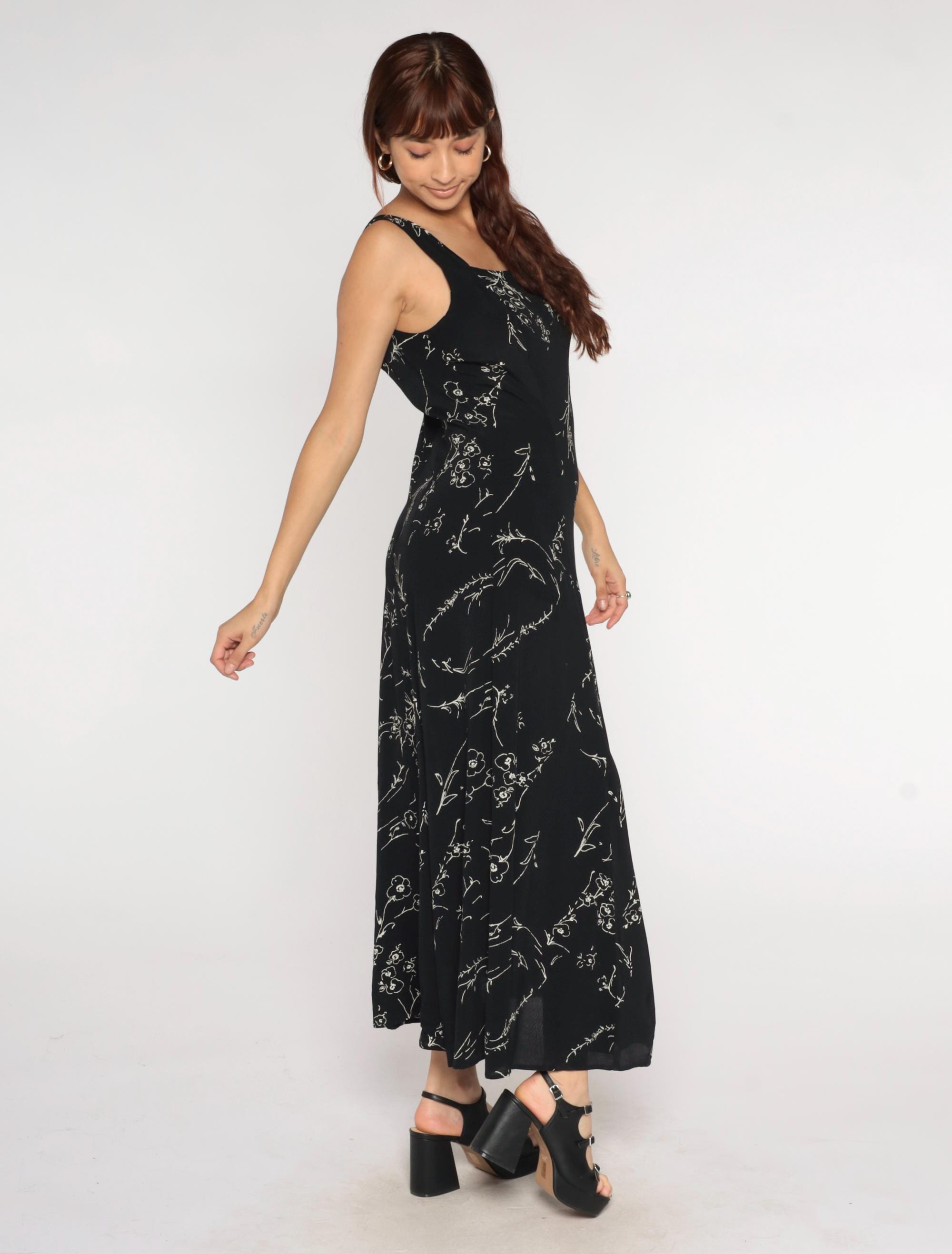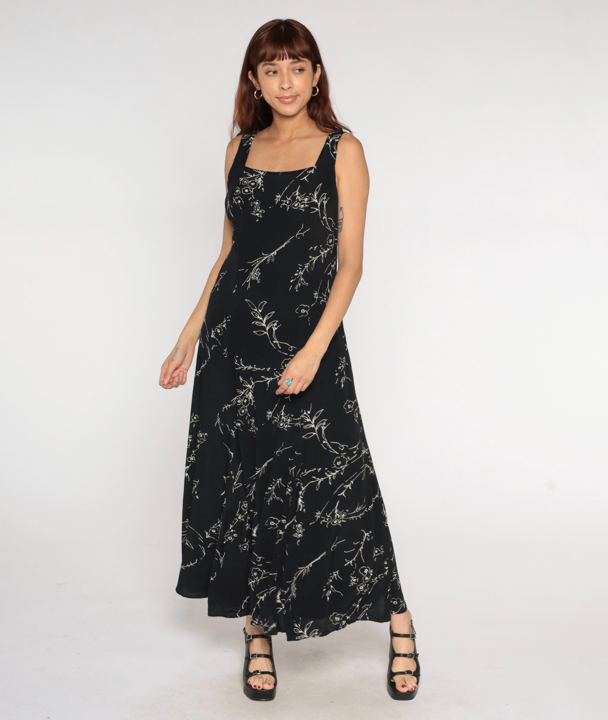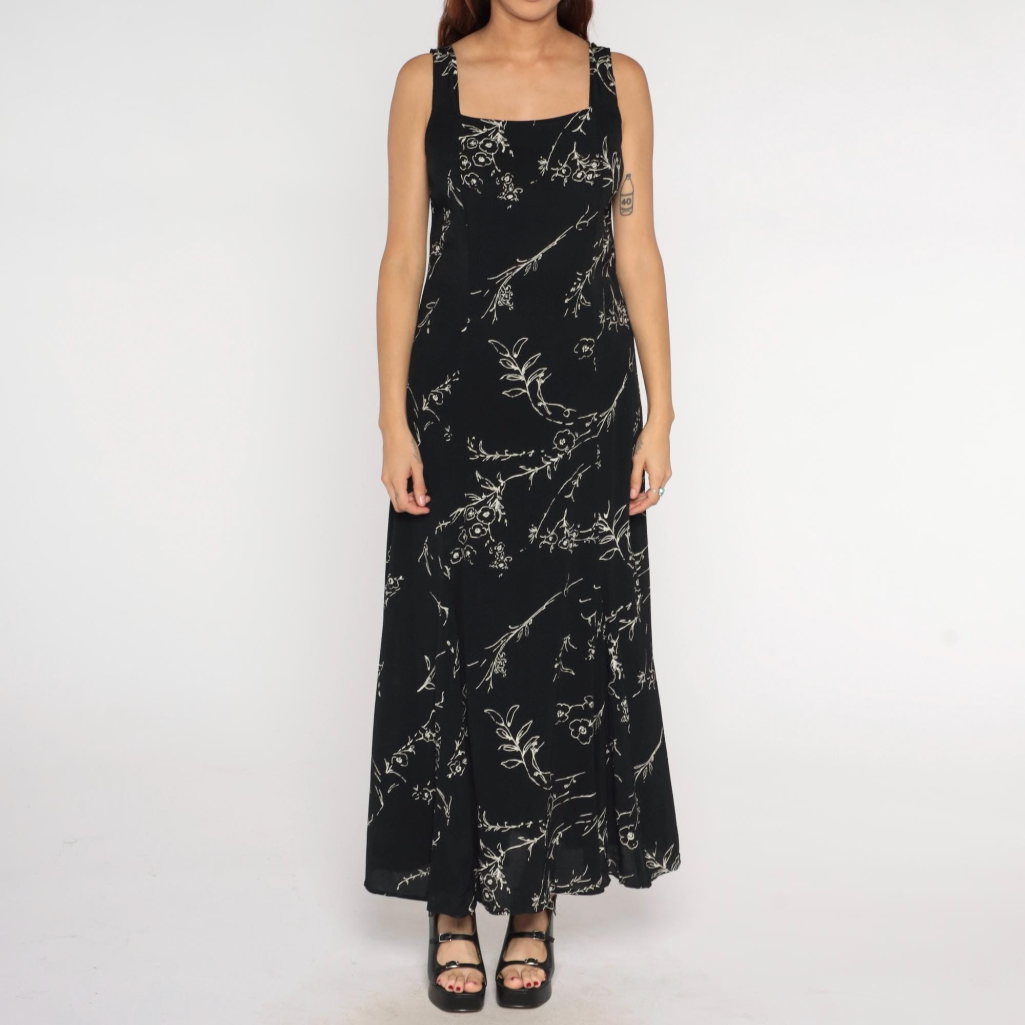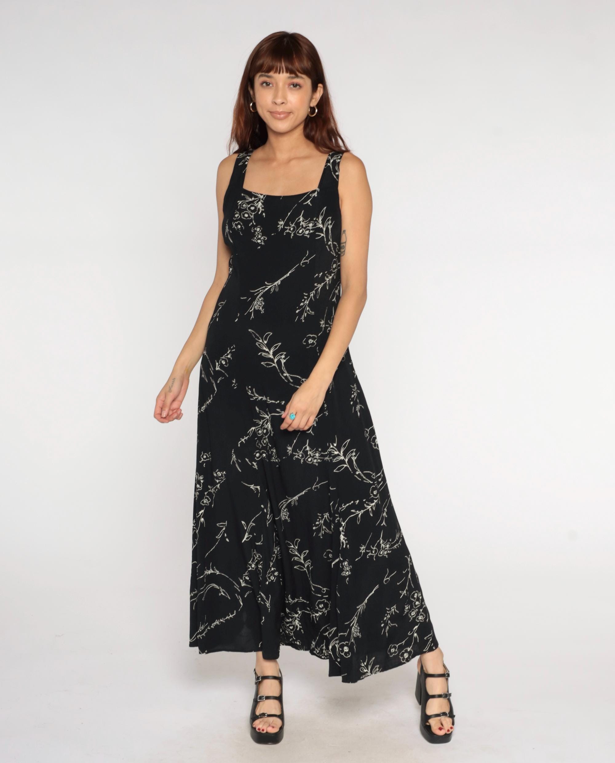 90s black maxi dress with white floral line drawing pattern throughout. Square neckline with thick shoulder straps and empire waist. Ankle-length straight silhouette.