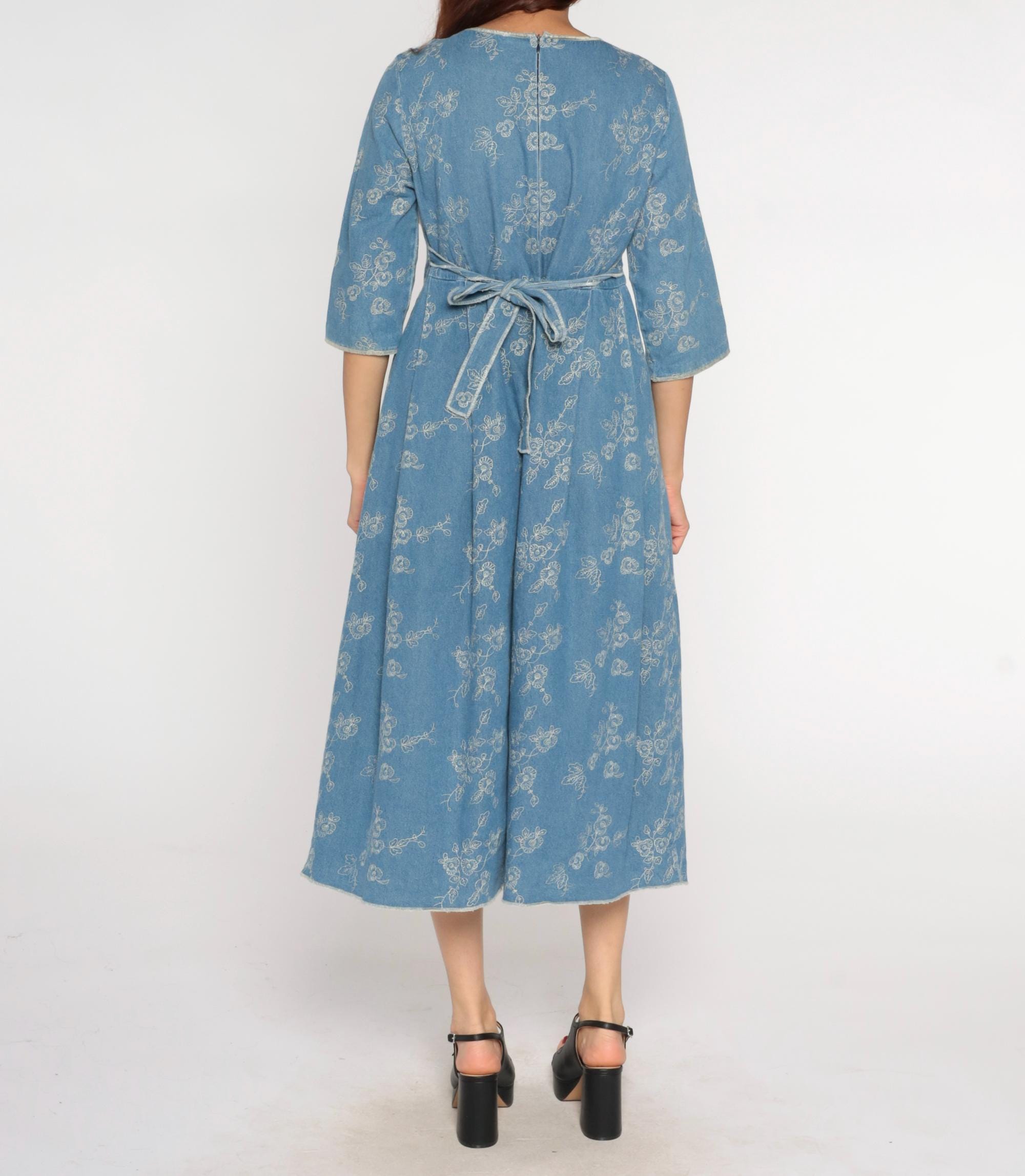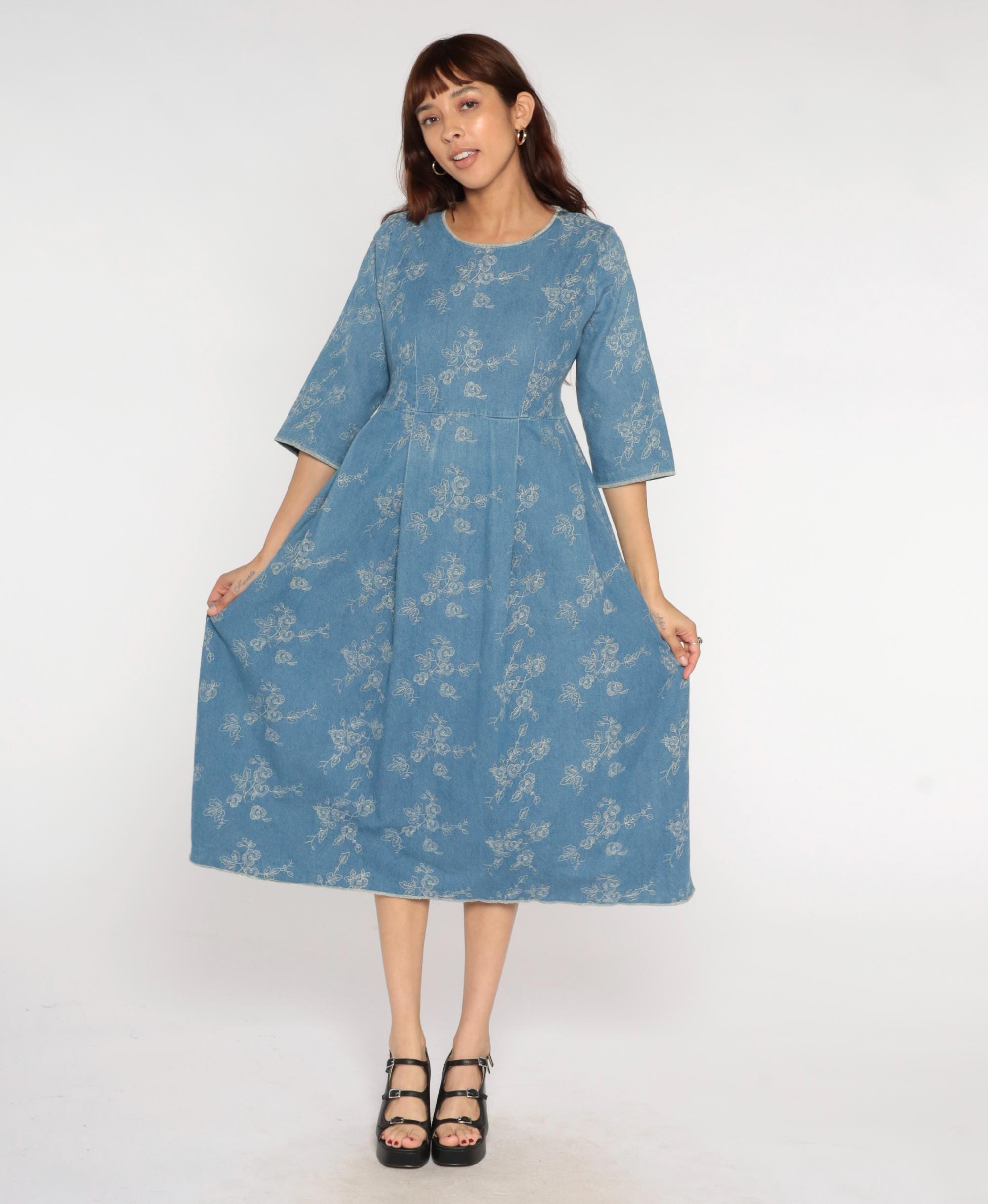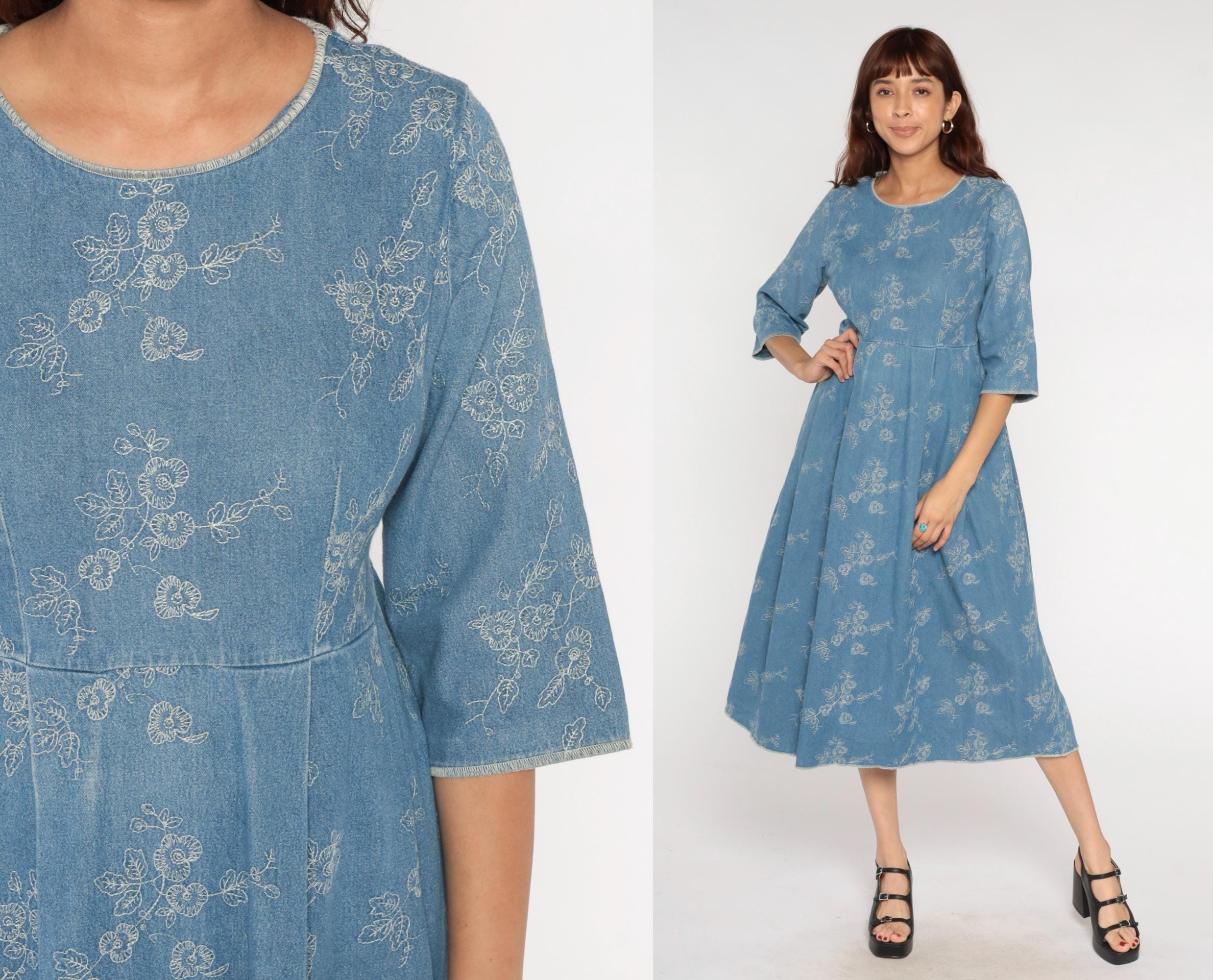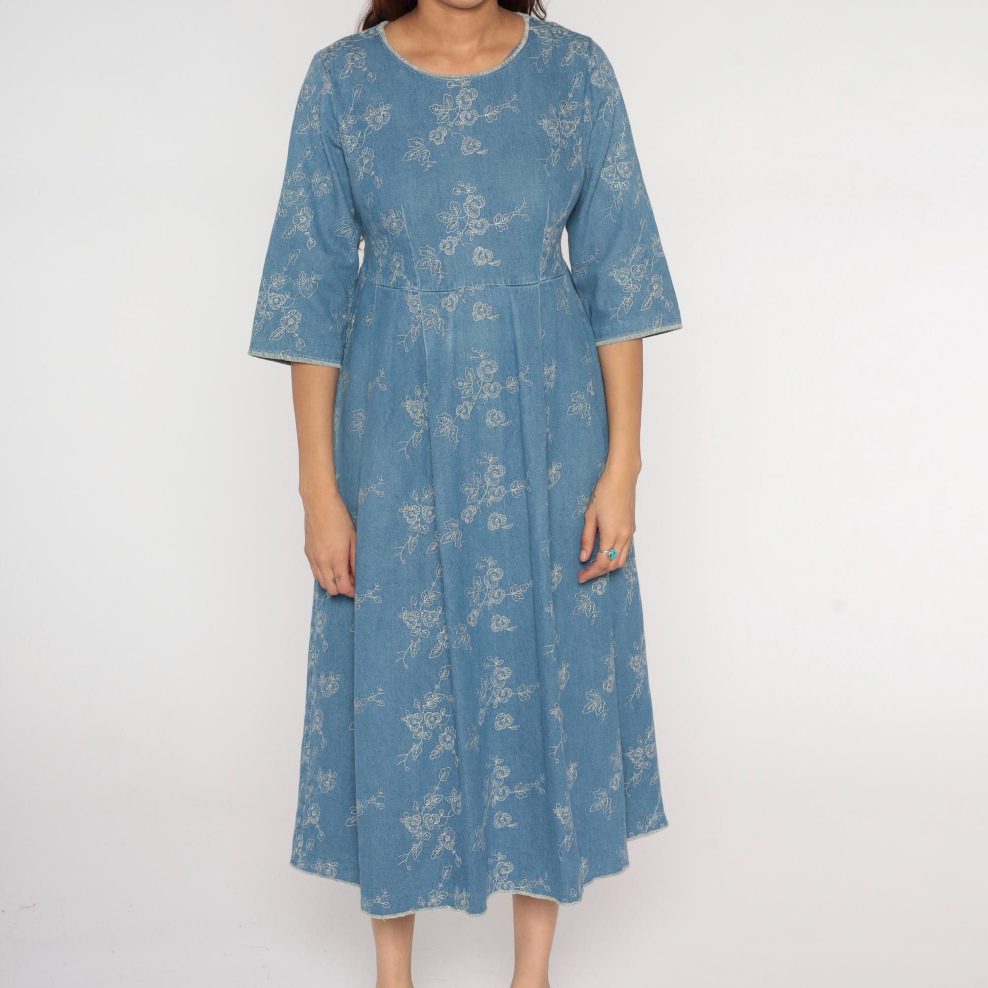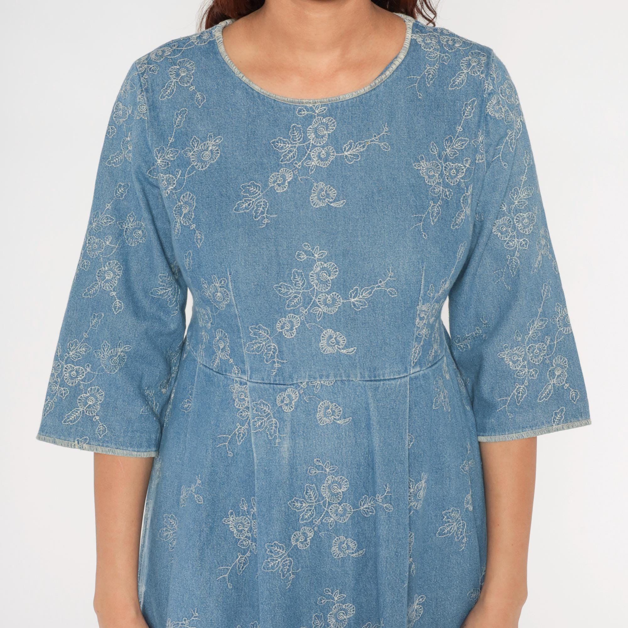 Y2k blue embroidered dress with white floral embroidery pattern across the entire garment. Round scoop neckline, 3/4 sleeves, fitted bodice with empire waist seam transitioning to A-line skirt. Back zipper closure with matching tie belt.
