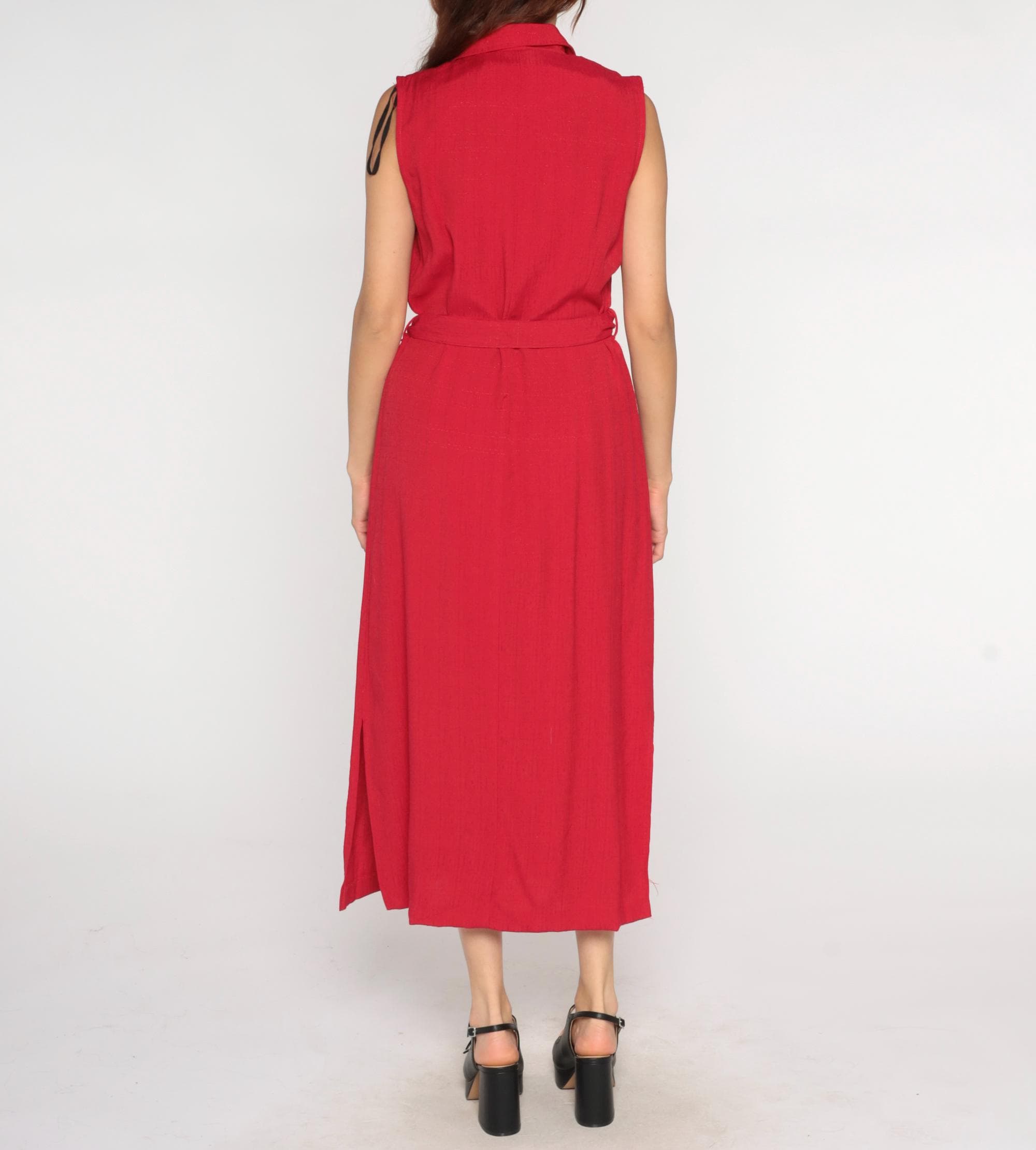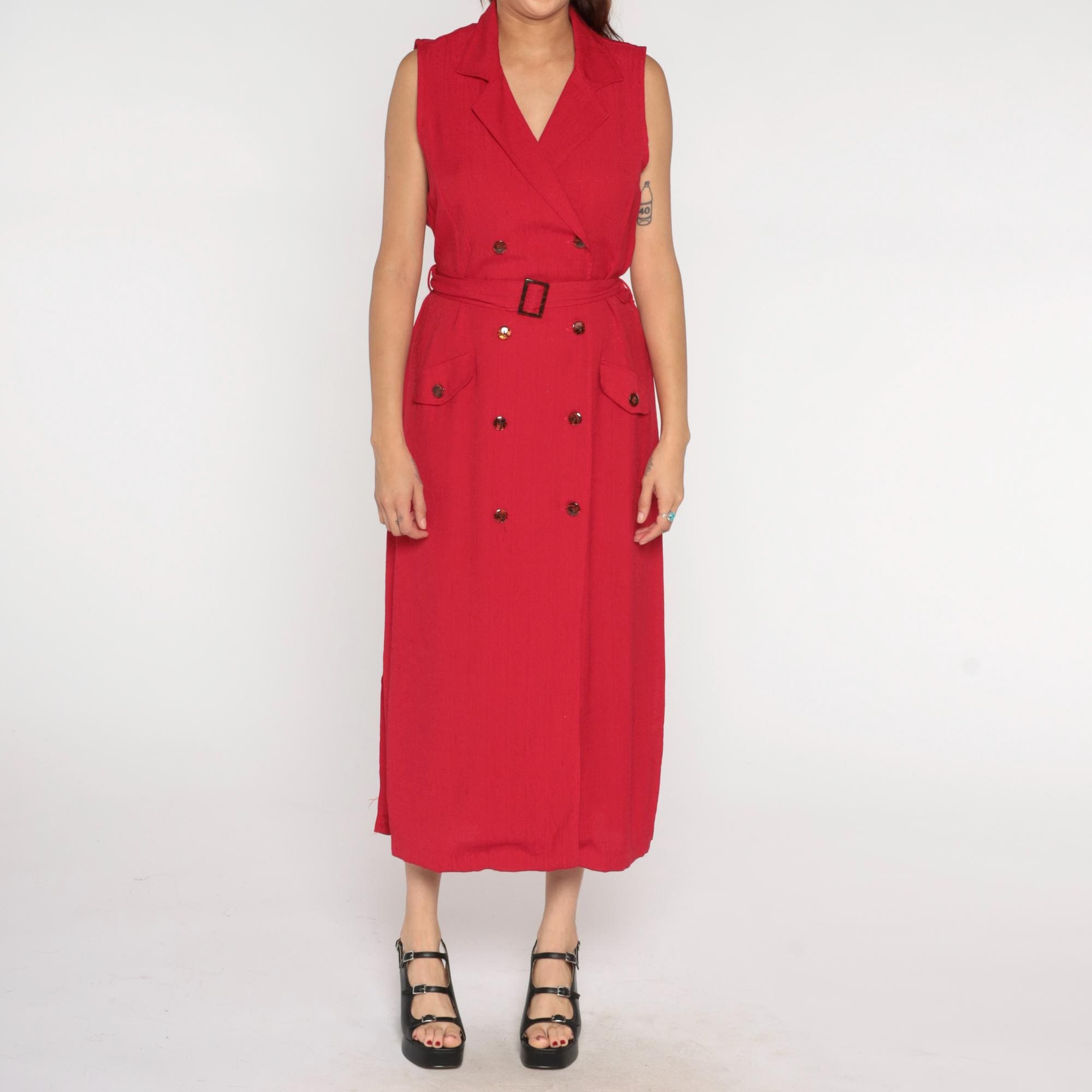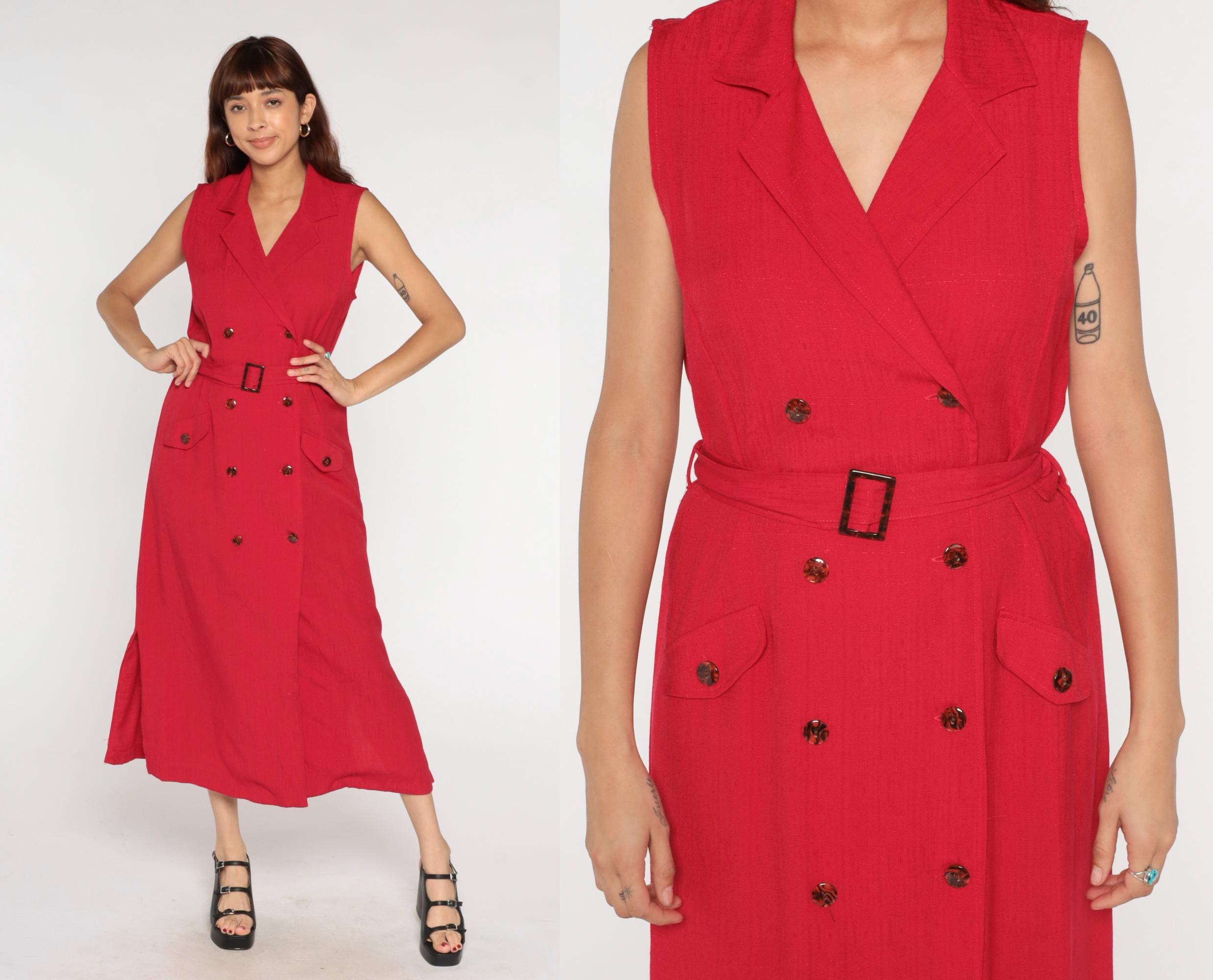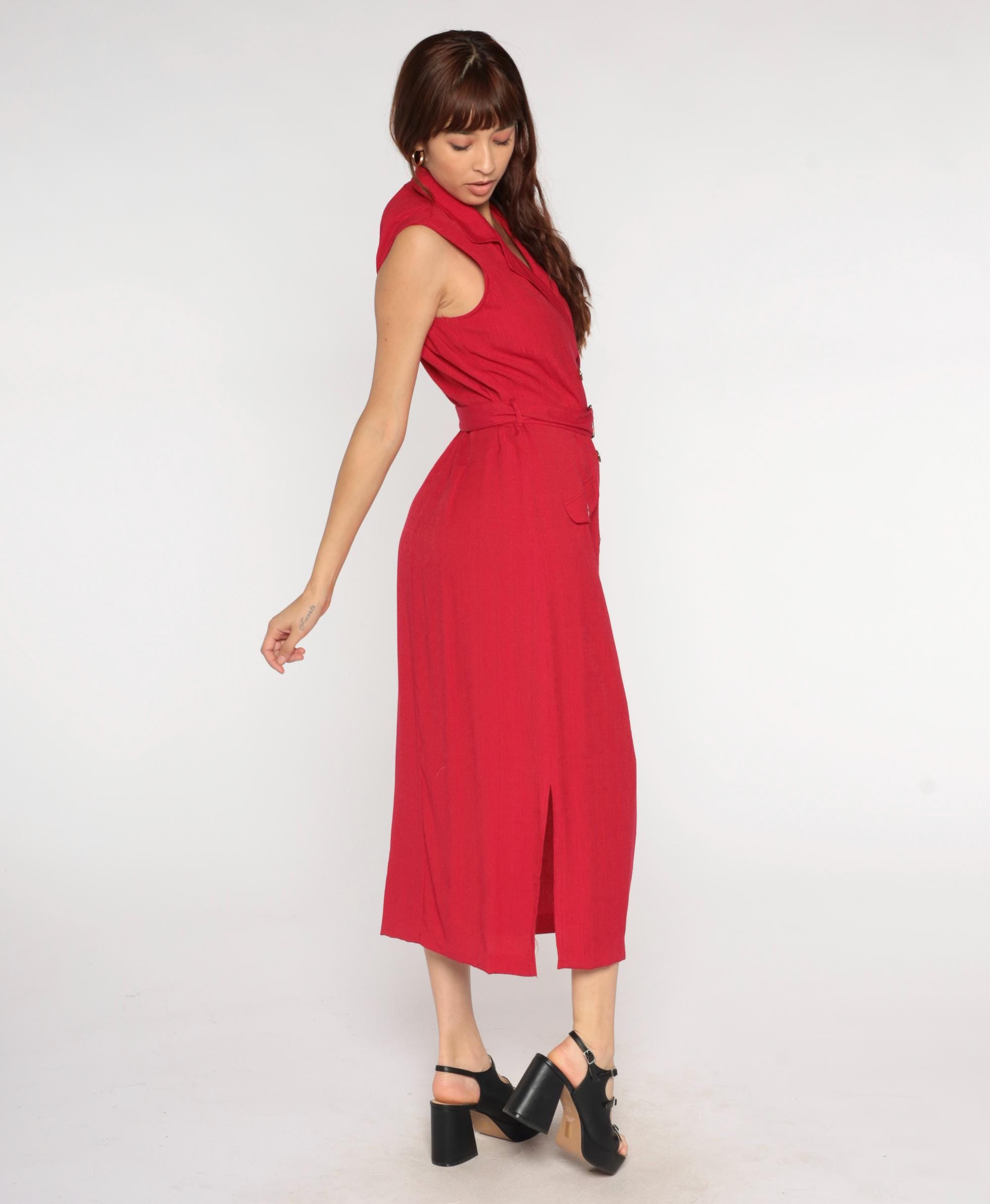 90s red midi dress from sag harbor with notched collar and double-breasted button front. Sleeveless with matching fabric belt and rectangular buckle at waist, patch pockets at hips.