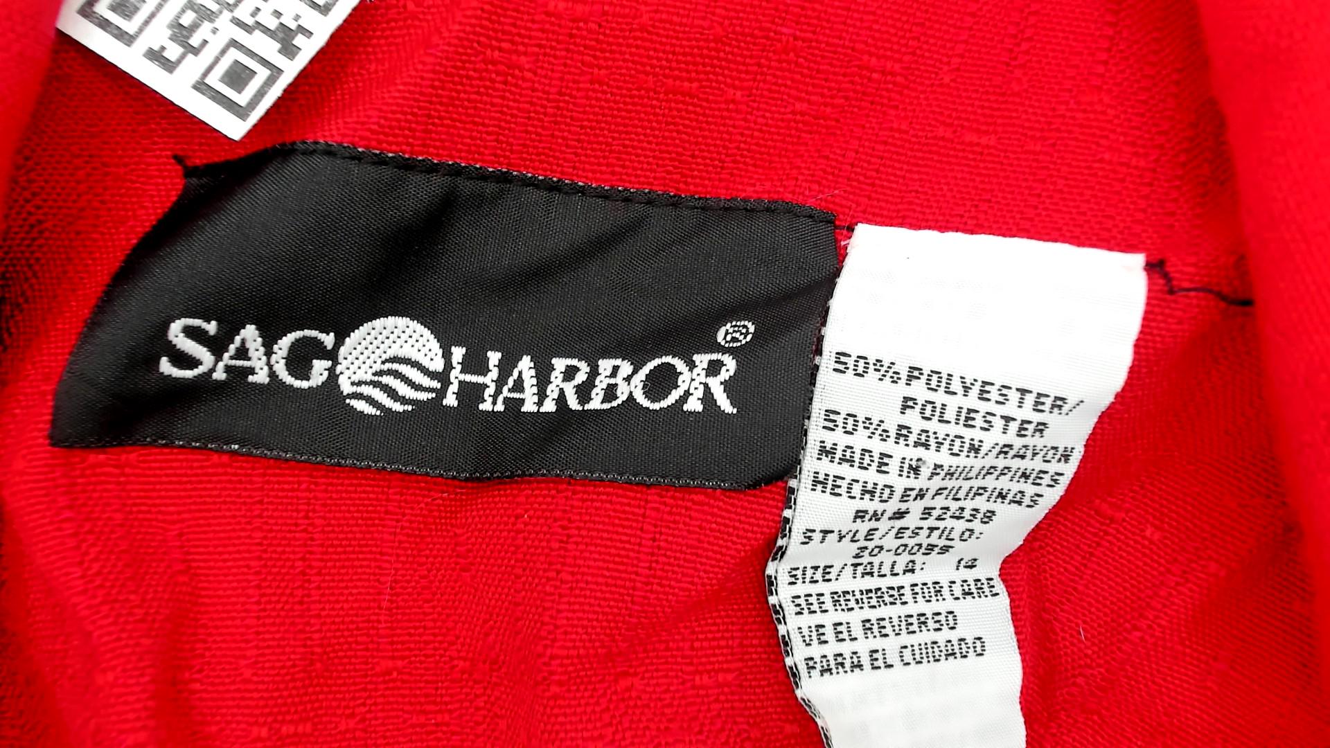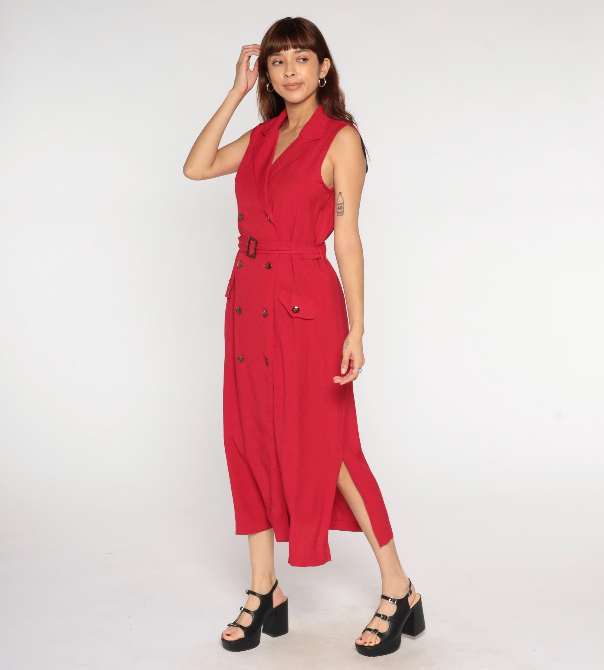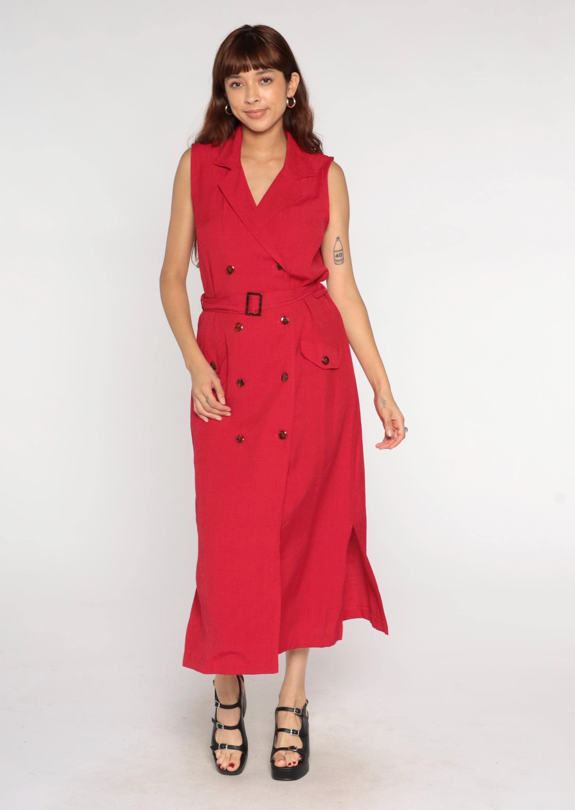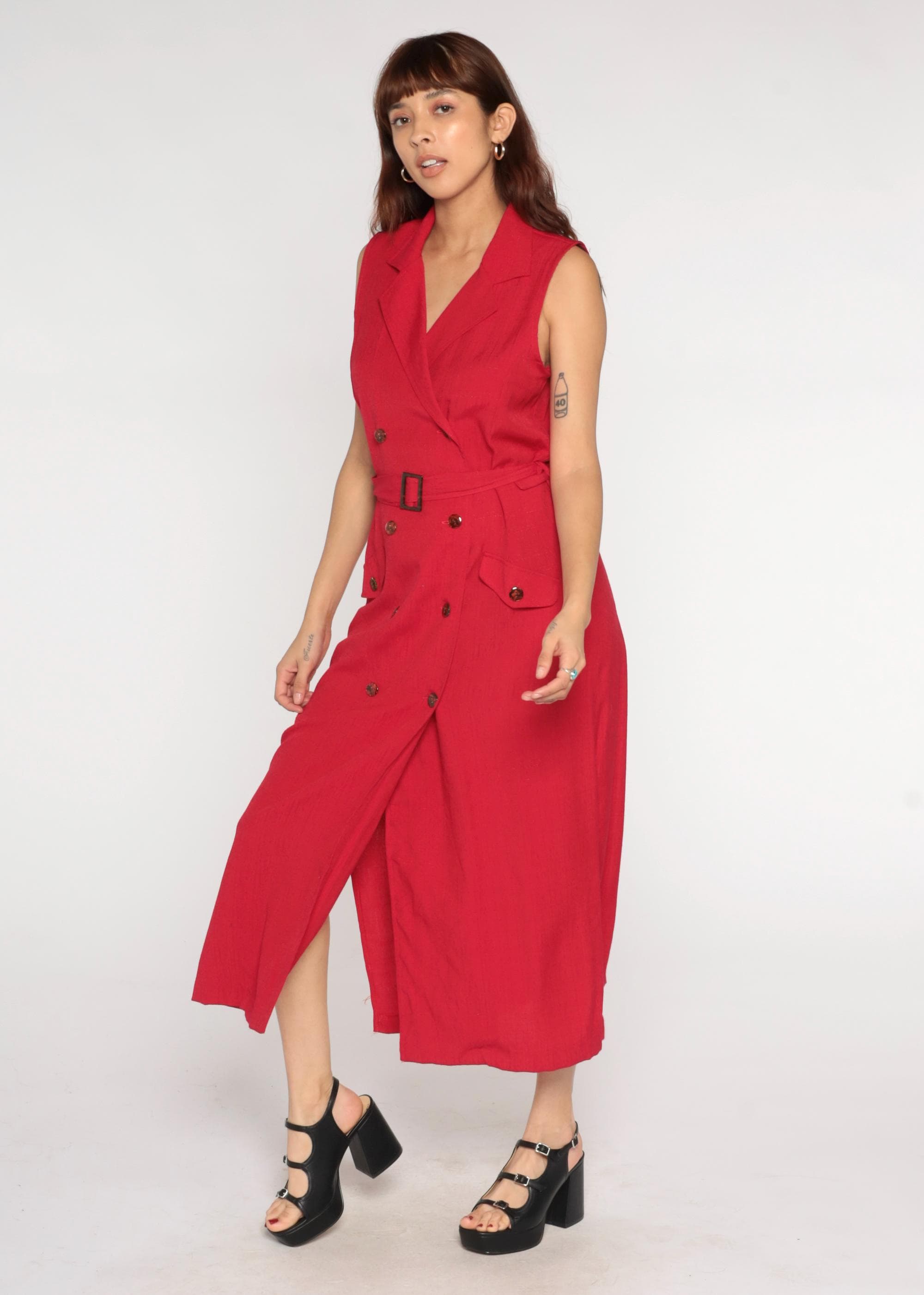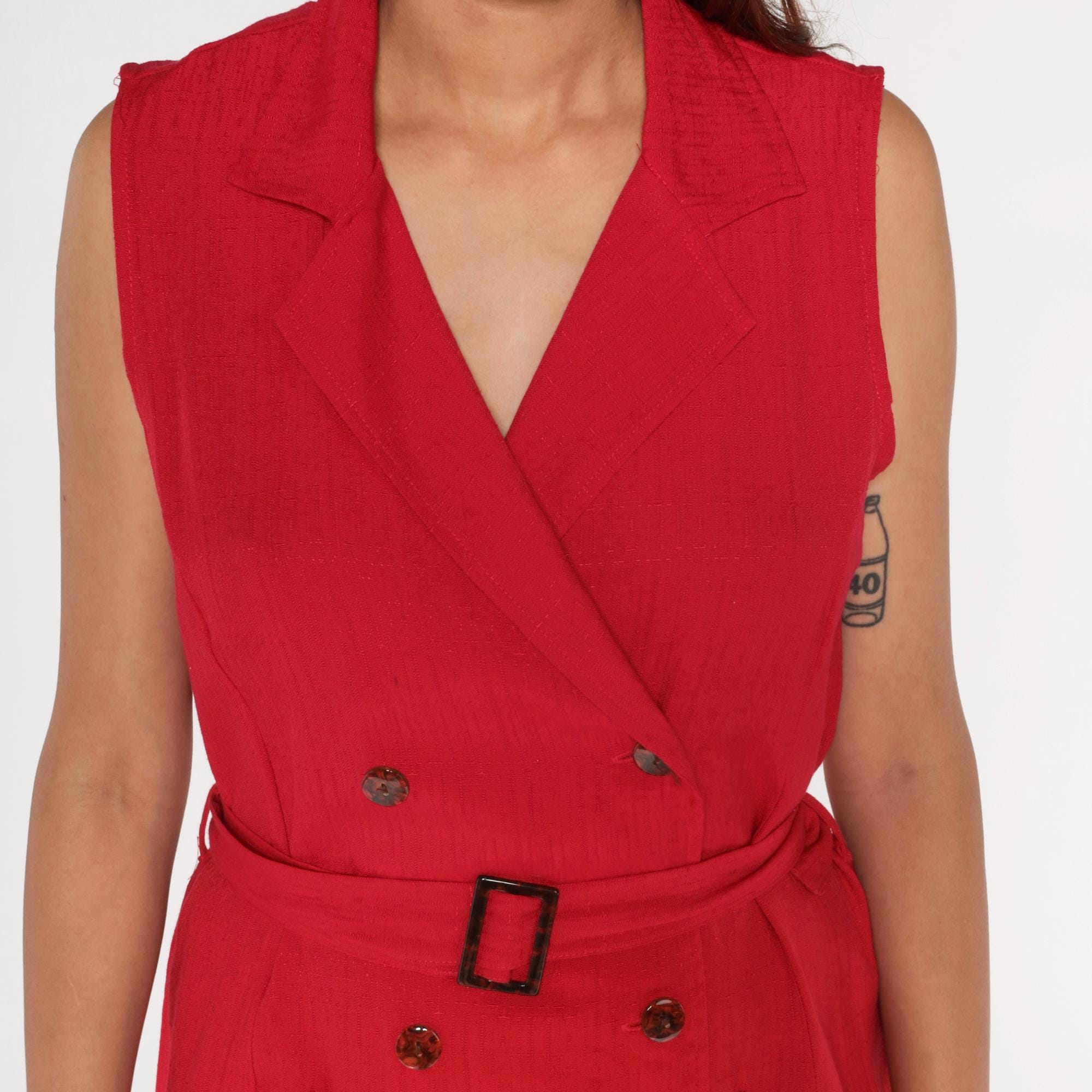 90s red midi dress from sag harbor with notched collar and double-breasted button front. Sleeveless with matching fabric belt and rectangular buckle at waist, patch pockets at hips.