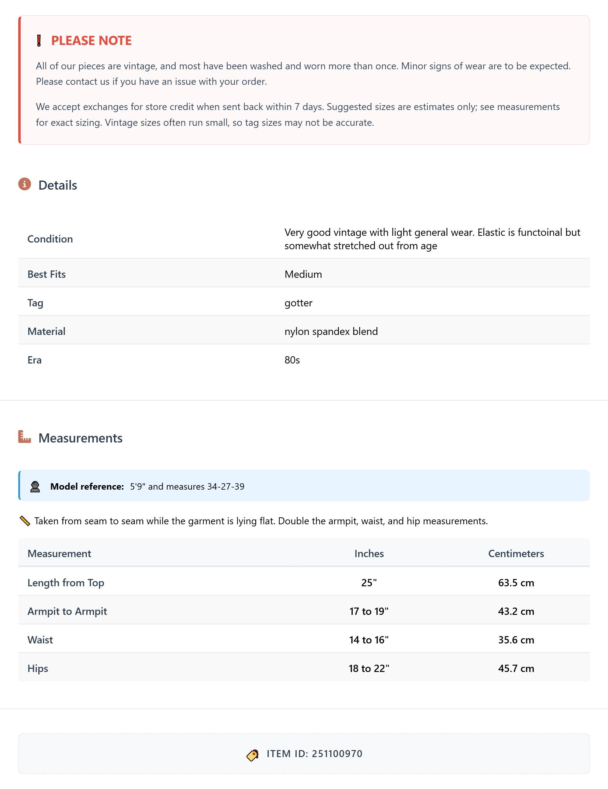 Measurements are taken laying flat and should be doubled where applicable. The "best fits" size is just an estimate, and vintage sizing can vary from modern sizing. Please use measurements to ensure proper fit. The best thing to do is measure a similar item of your own, and compare. When an item has stretch, we will list the unstretched dimensions with the stretched measurement afterwards.