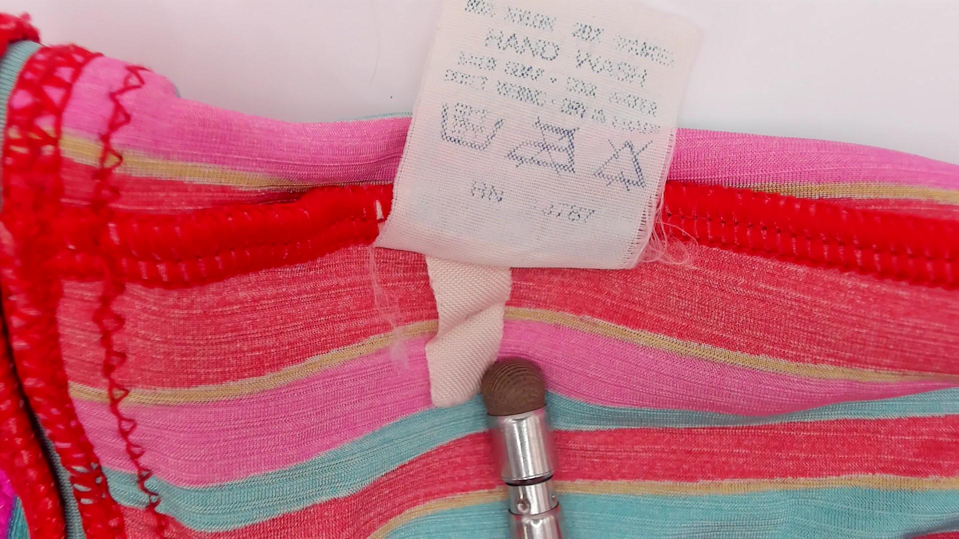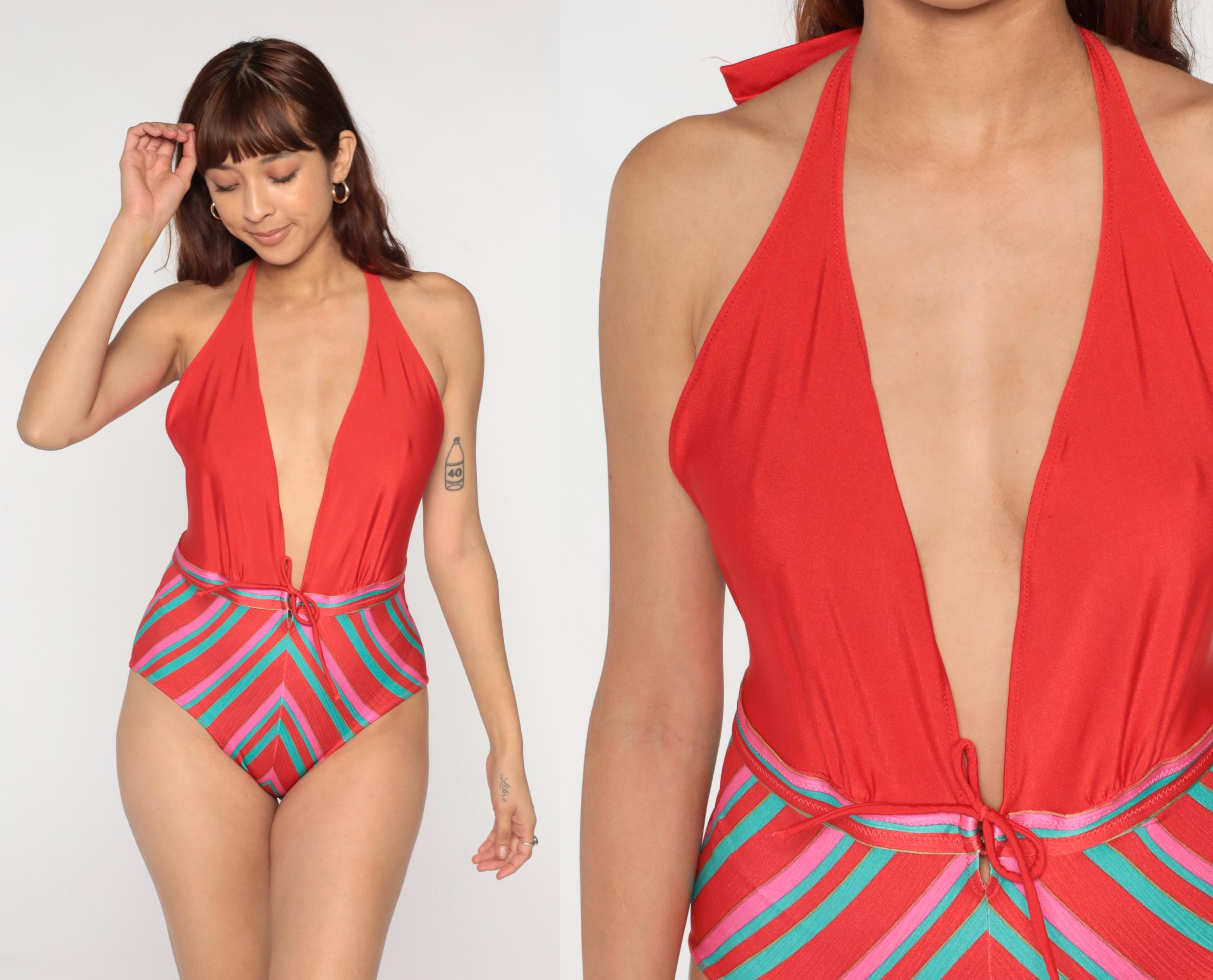 80s coral one-piece halter swimsuit from gotter with plunging V-neckline and tie closure at neck. Solid coral top portion, lower half with multi-directional stripes in coral, turquoise, pink, and white.