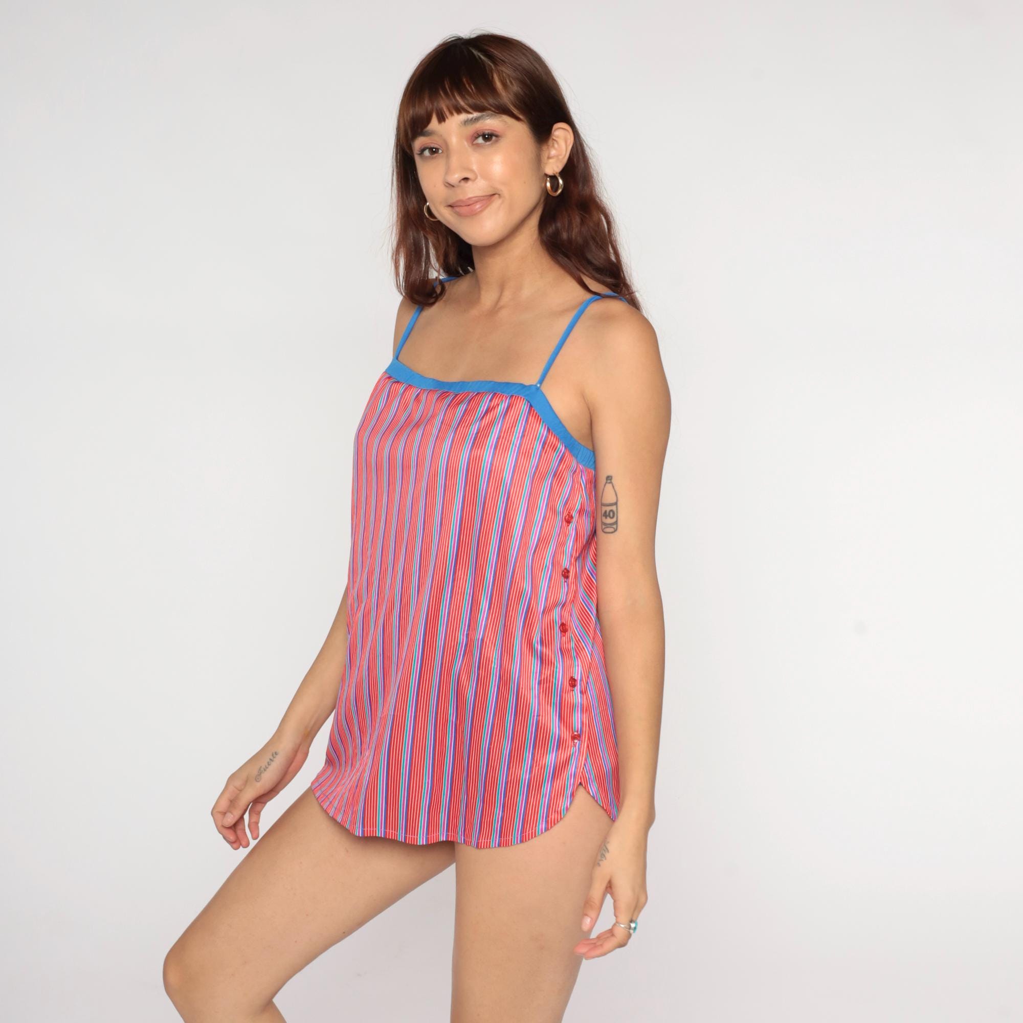 80s blue swimsuit dress from great times with attached striped overlay panel and boy-short style bottom. Red, pink, white, and blue vertical stripes on the loose front panel with side slits. Spaghetti straps and fitted swimsuit base underneath the overlay.