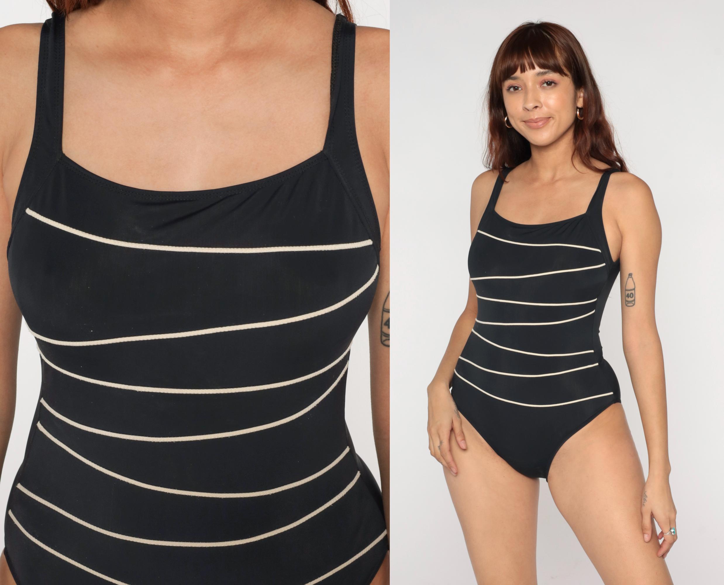 80s black one-piece swimsuit with diagonal white striped pattern across the front. Tank-style straps, scoop neckline, low scoop back.