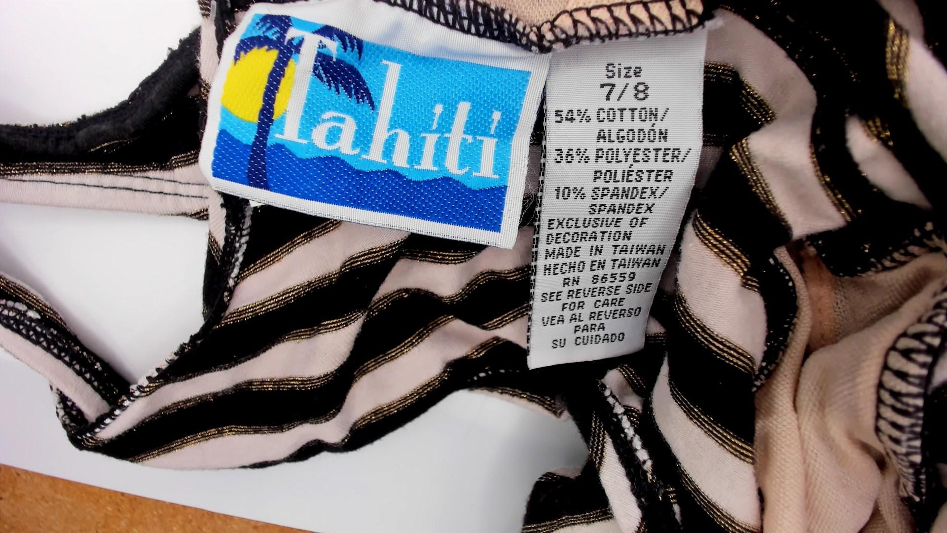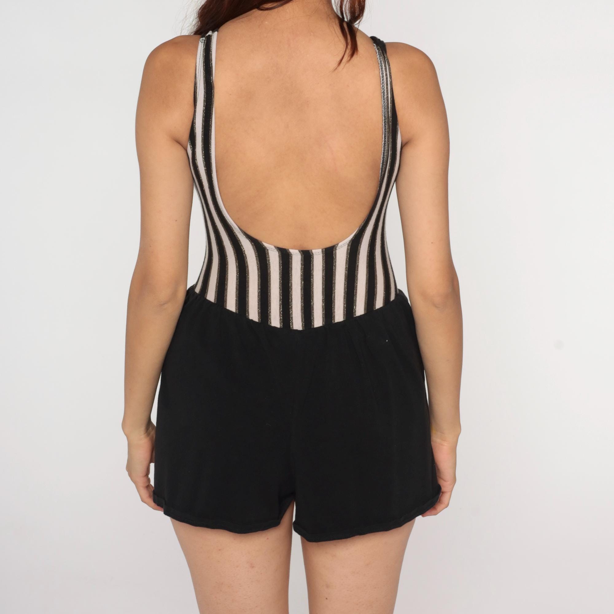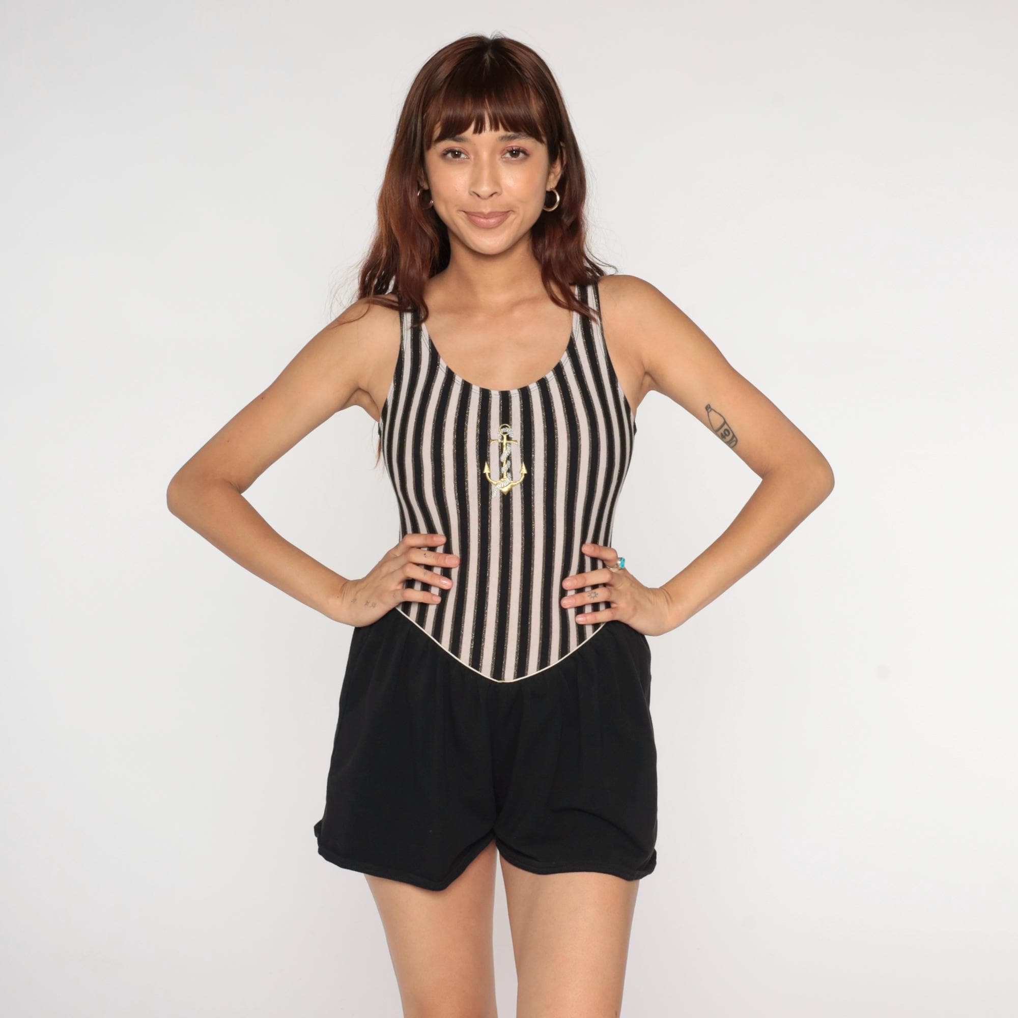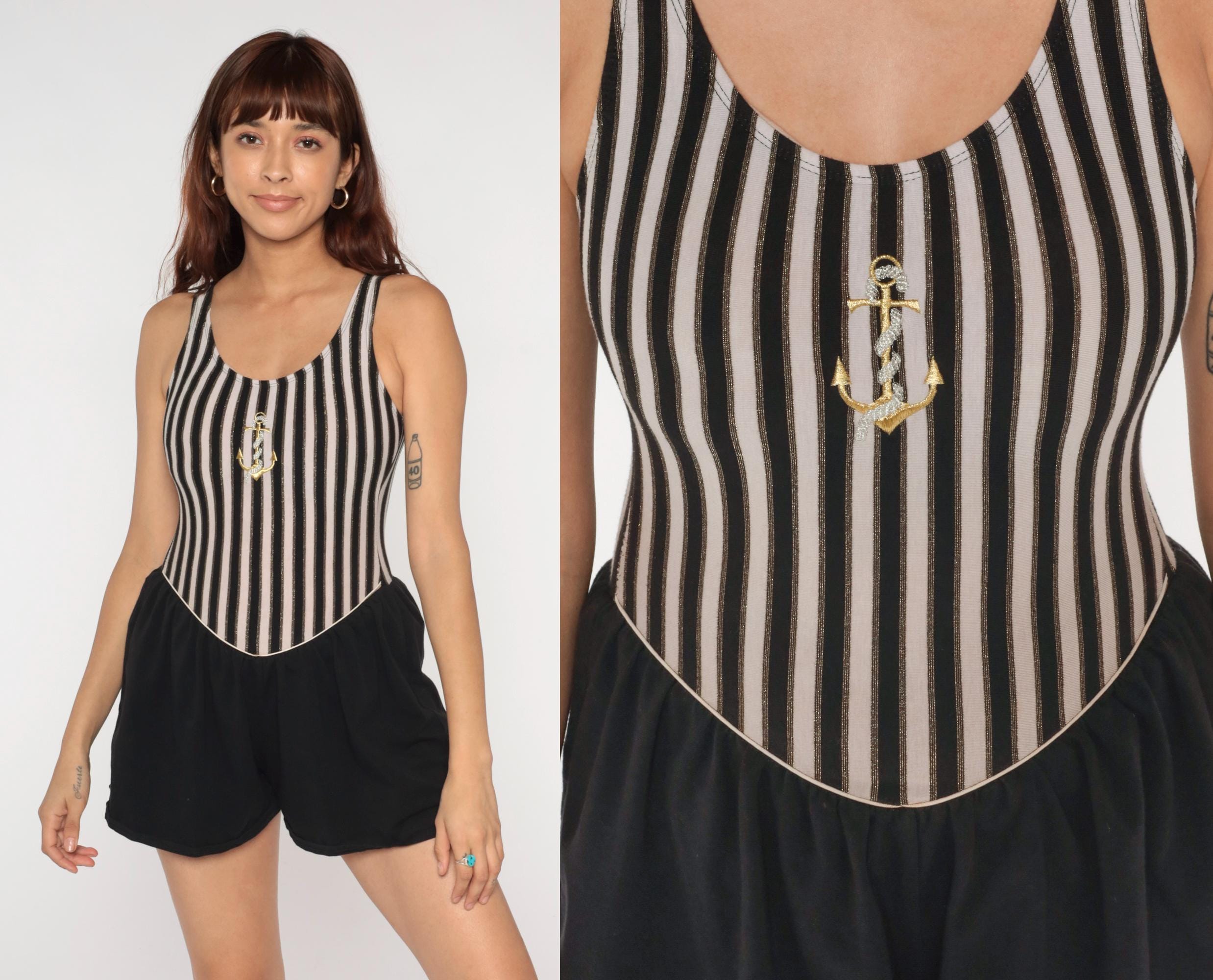 90s black and white vertical striped one-piece swimsuit from tahiti with gold anchor pin at chest. Racerback straps, low scoop back, striped bodice with solid black shorts bottom separated by white piping trim.