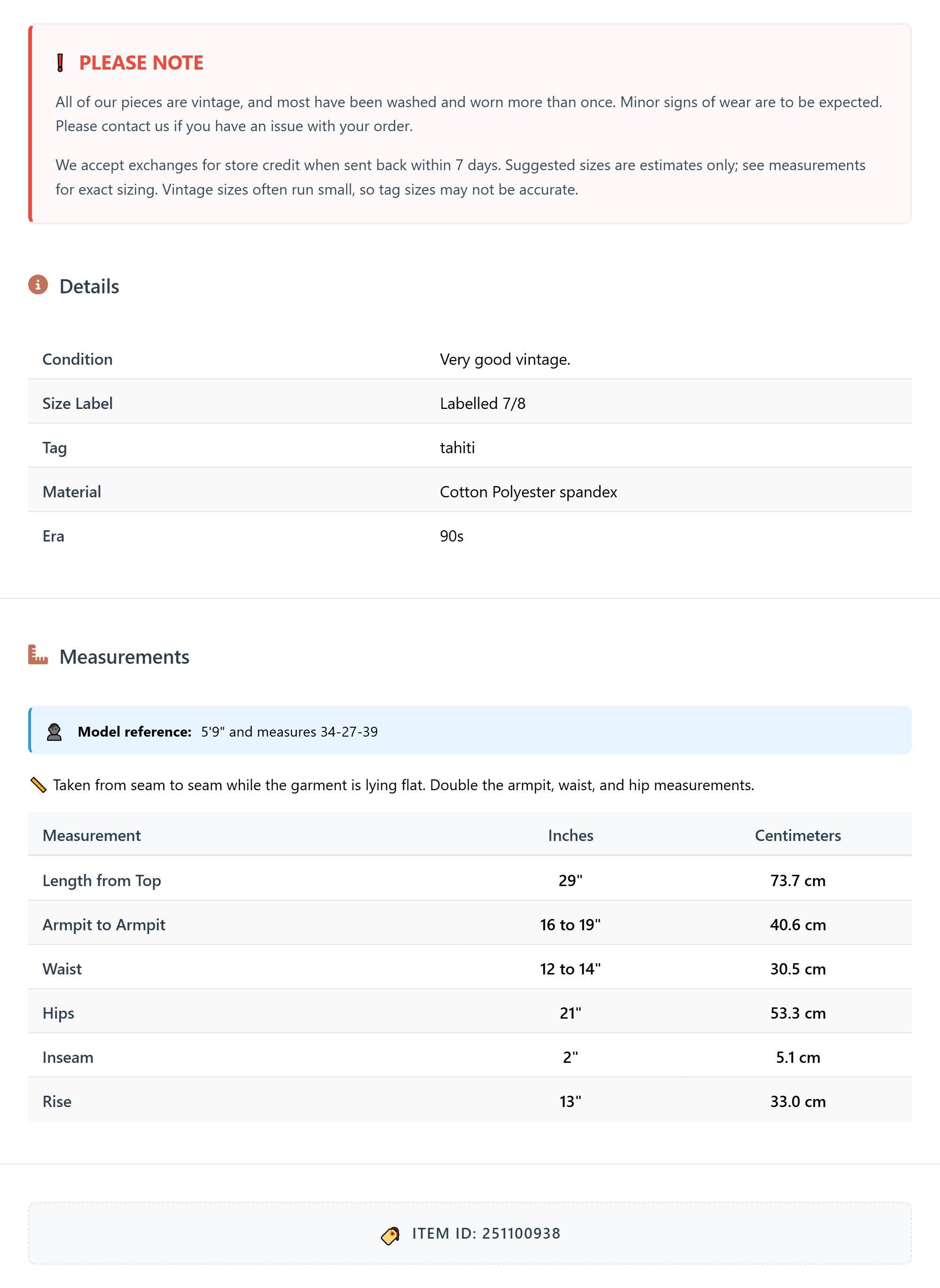All of our pieces are vintage, and most have been washed and worn more than once. Minor signs of wear are to be expected. Please contact us if you have an issue with your order. We accept exchanges for store credit when sent back within 7 days.