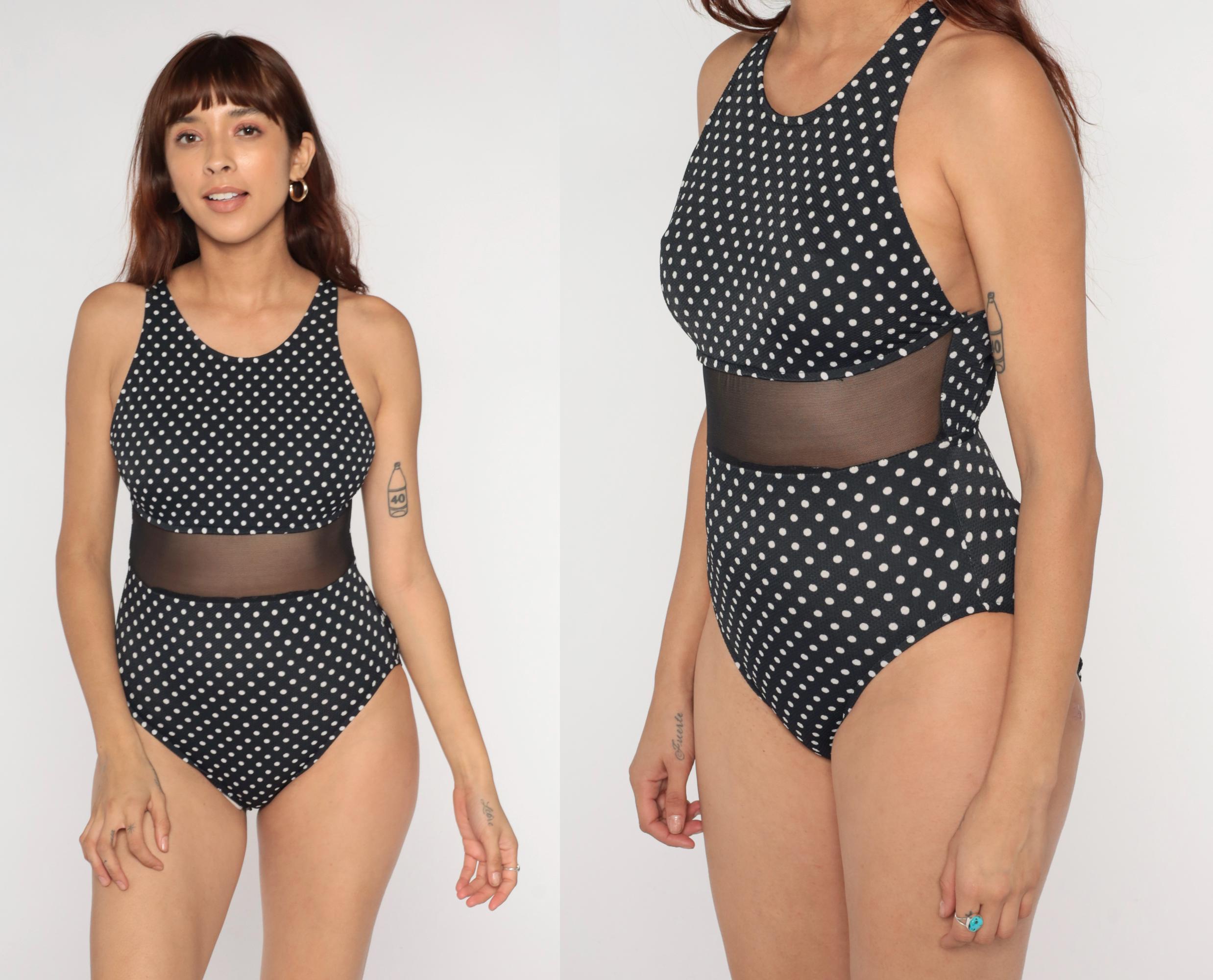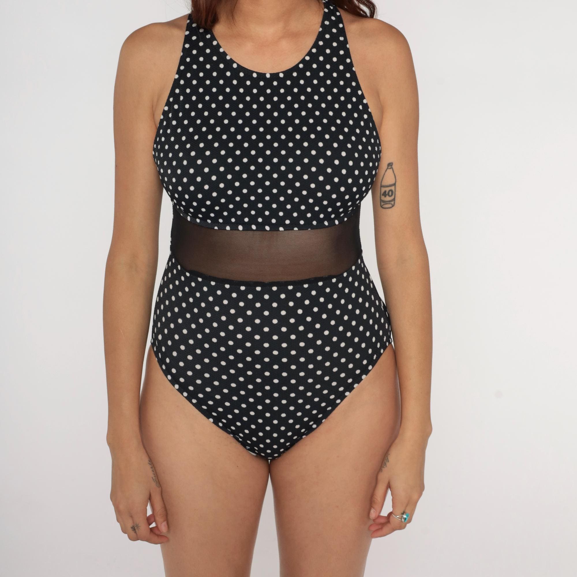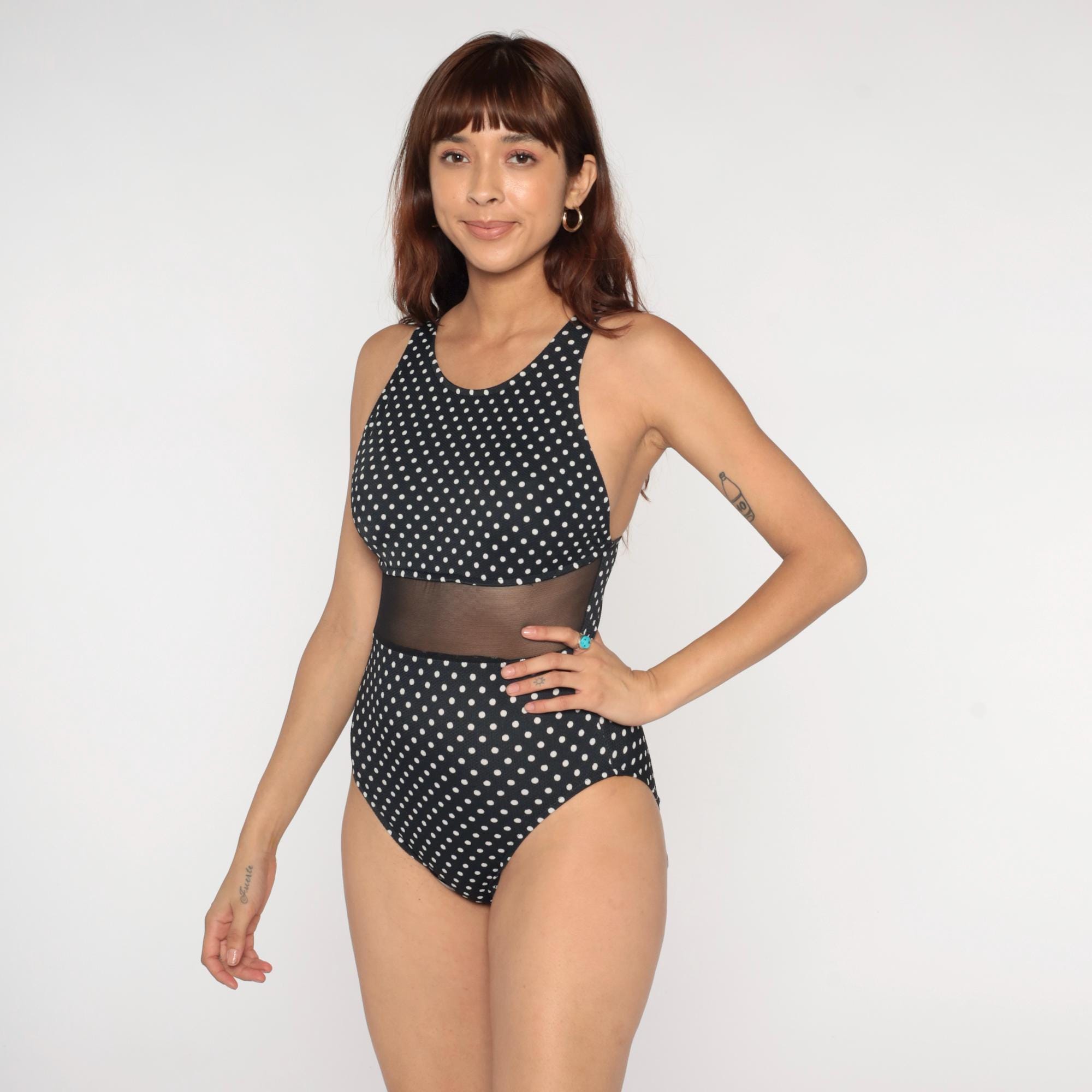 80s black and white polka dot one-piece swimsuit from Jantzen with sheer mesh panel at waist, high scoop neckline, and cross-back straps. Polka dots cover the entire garment in a regular pattern.