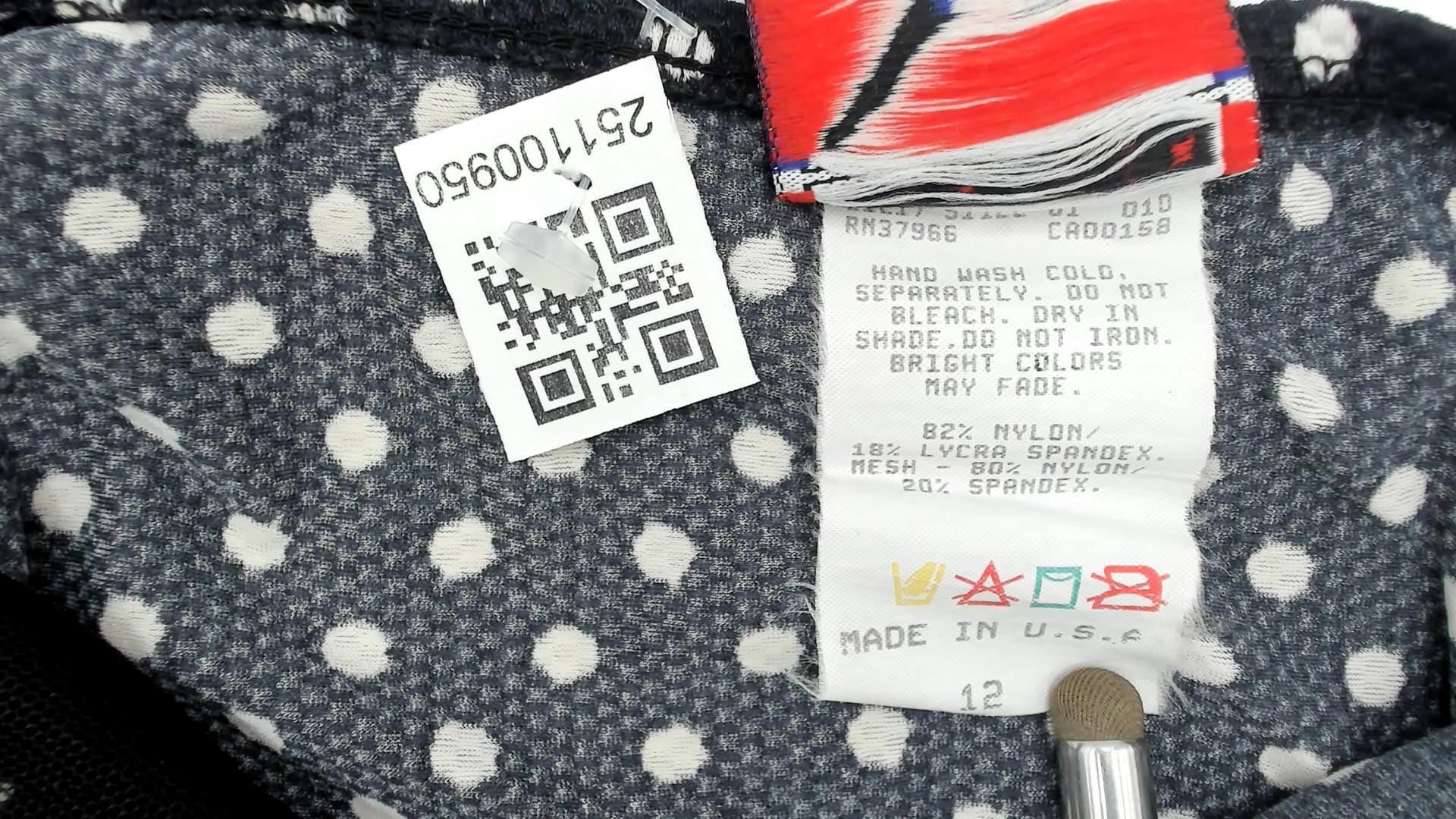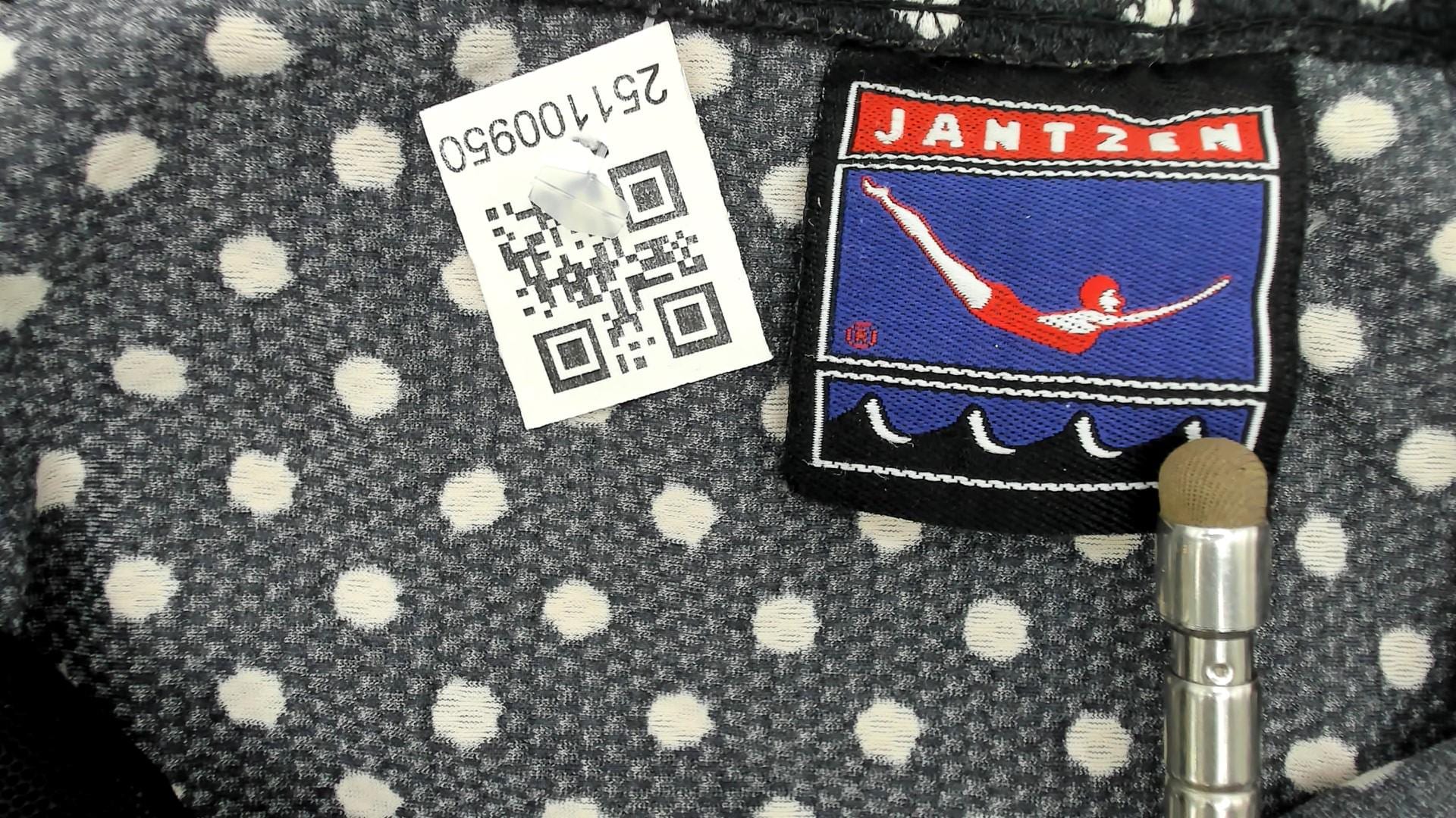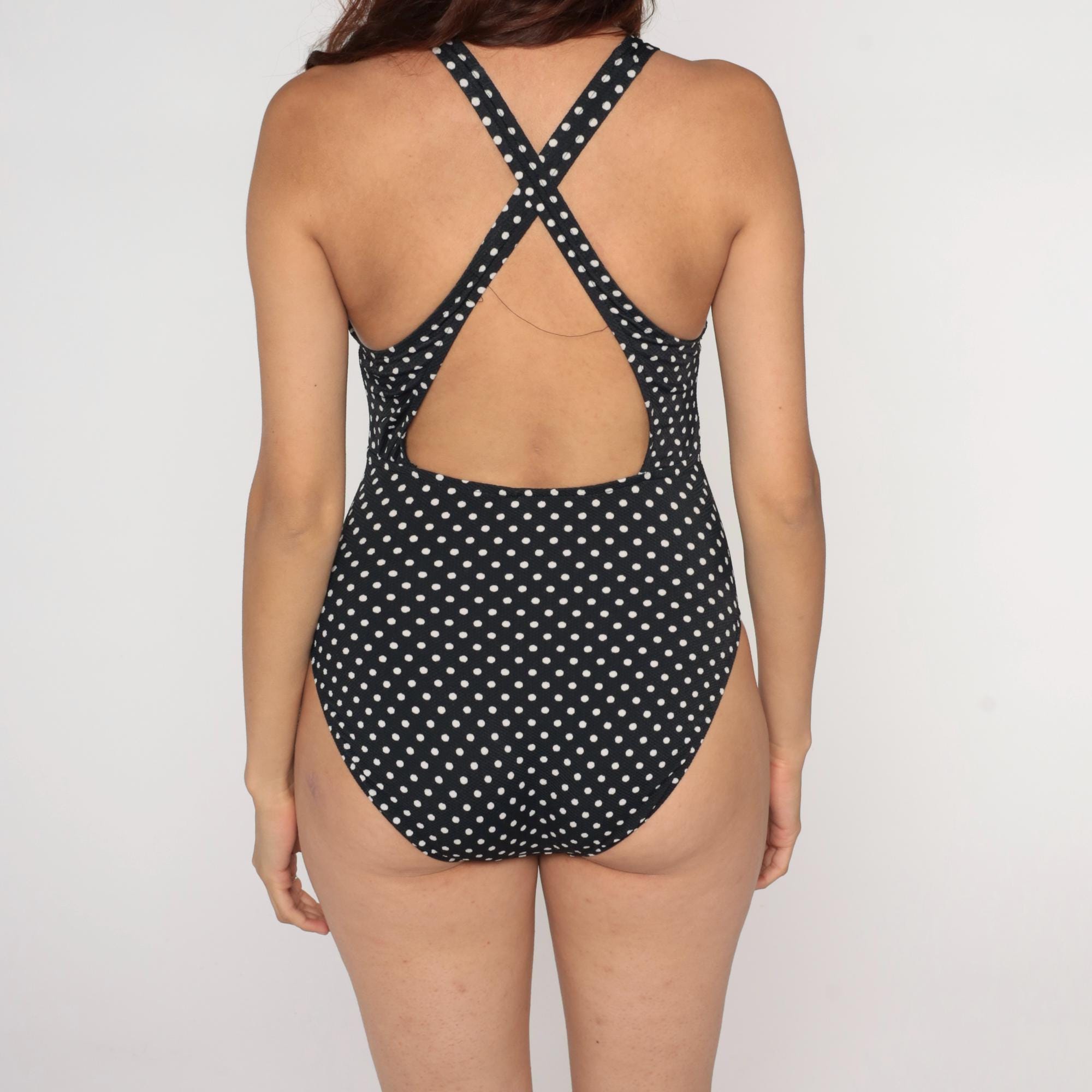 80s black and white polka dot one-piece swimsuit from Jantzen with sheer mesh panel at waist, high scoop neckline, and cross-back straps. Polka dots cover the entire garment in a regular pattern.