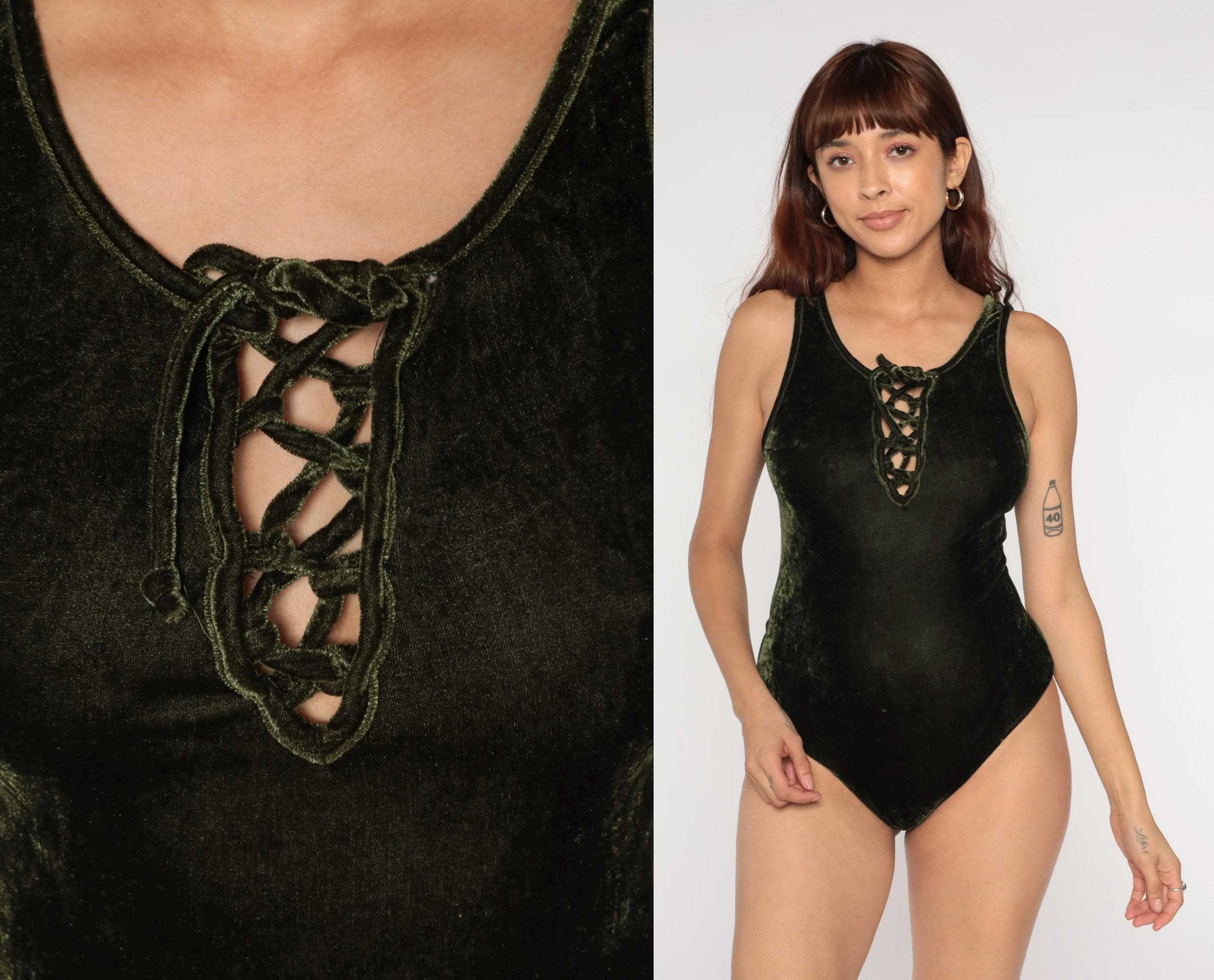 Y2K dark green velvet bodysuit from Charlotte Russe with lace-up detail at the center front neckline. Sleeveless racerback construction with snap crotch closure.