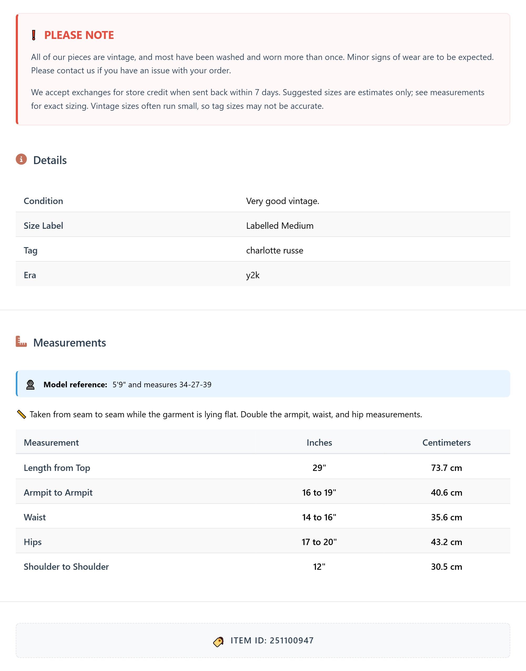 All of our pieces are vintage, and most have been washed and worn more than once. Minor signs of wear are to be expected. Please contact us if you have an issue with your order. We accept exchanges for store credit when sent back within 7 days.