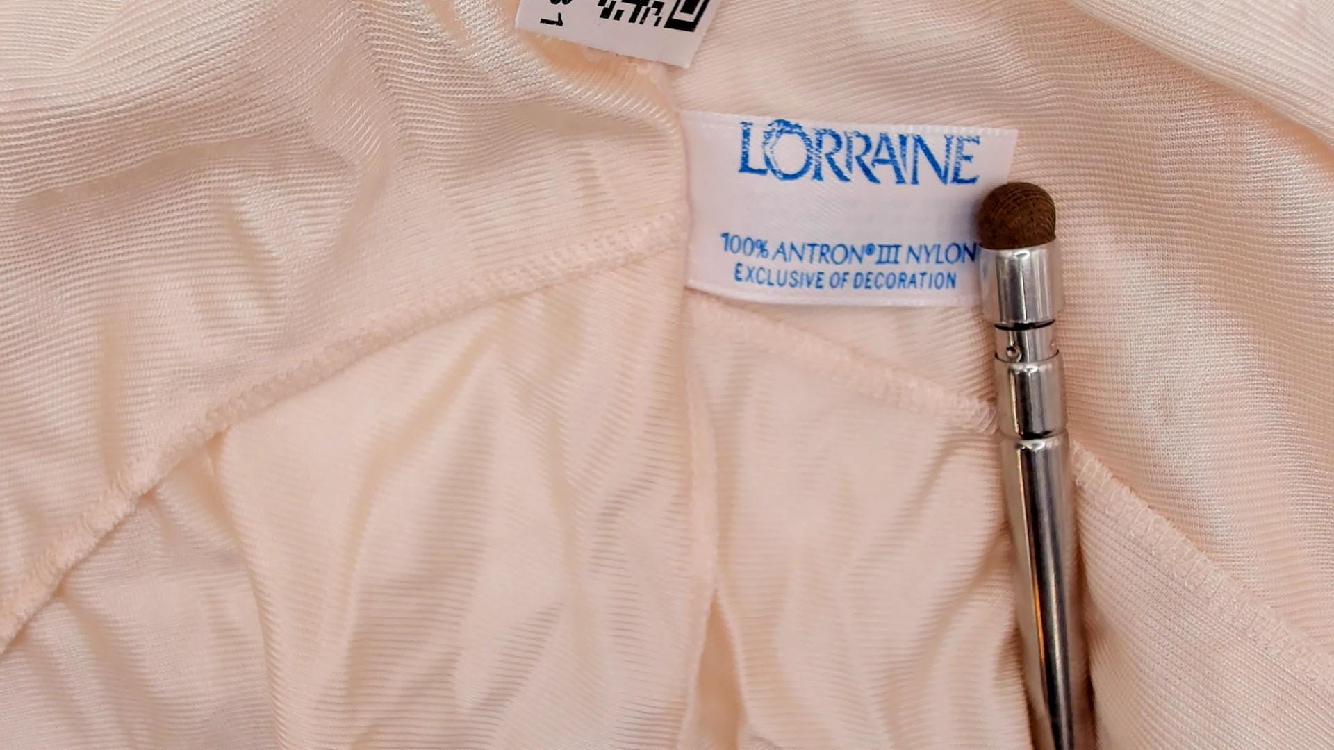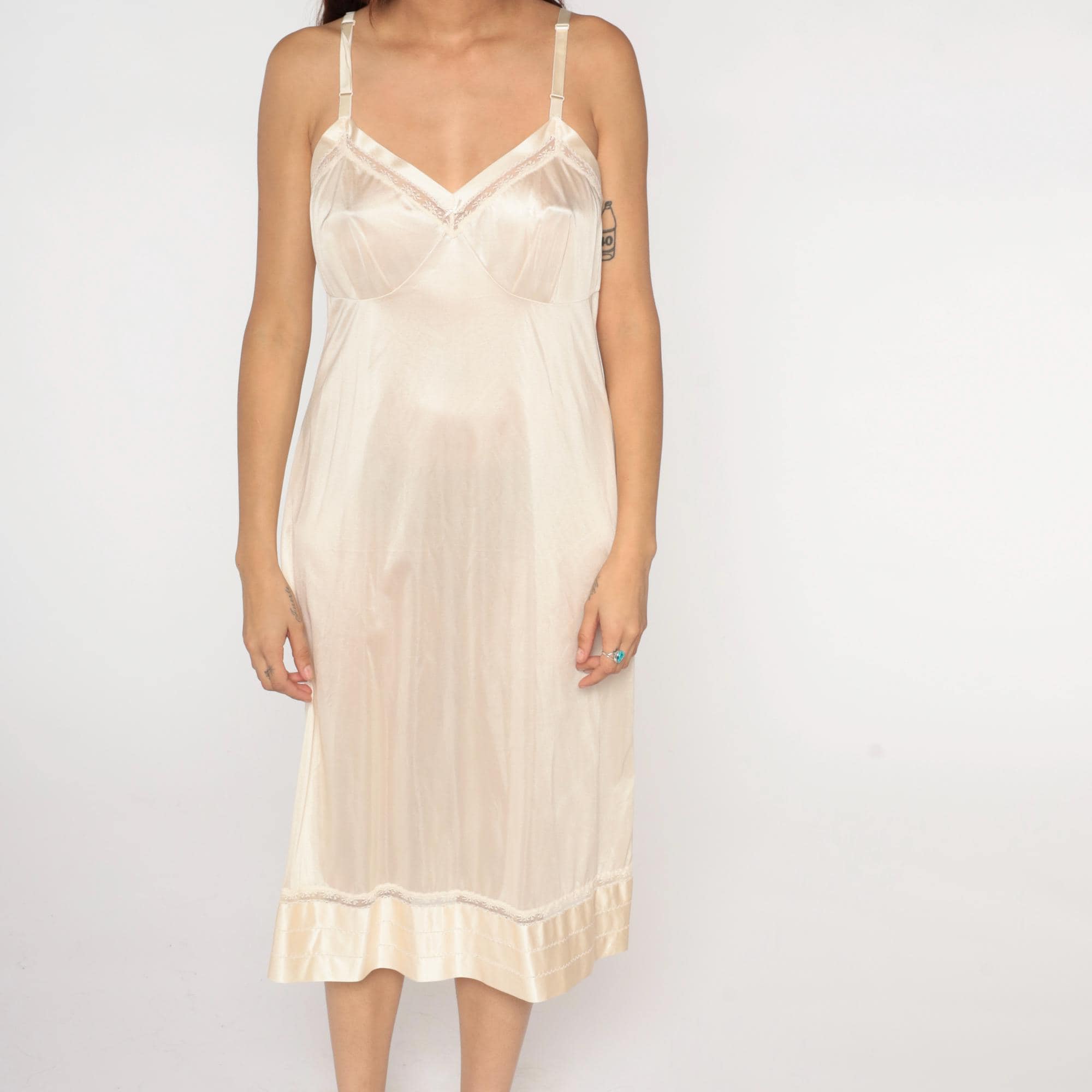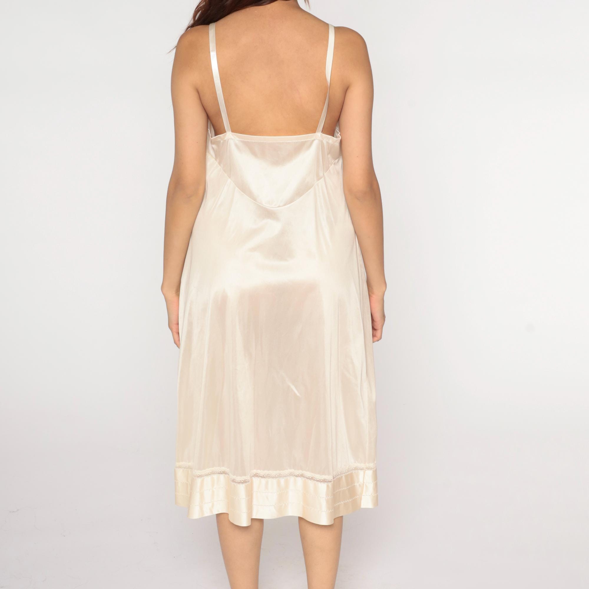 80s cream slip dress from lorraine with adjustable spaghetti straps and V-neckline trimmed in lace. Built-in cup structure in the fitted bodice, ruffle hem at the bottom.