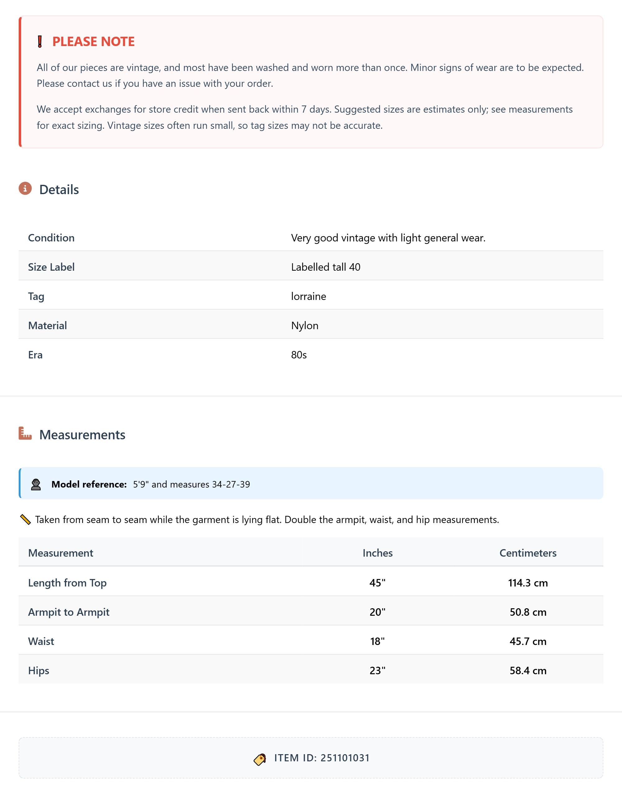 All of our pieces are vintage, and most have been washed and worn more than once. Minor signs of wear are to be expected. Please contact us if you have an issue with your order. We accept exchanges for store credit when sent back within 7 days.