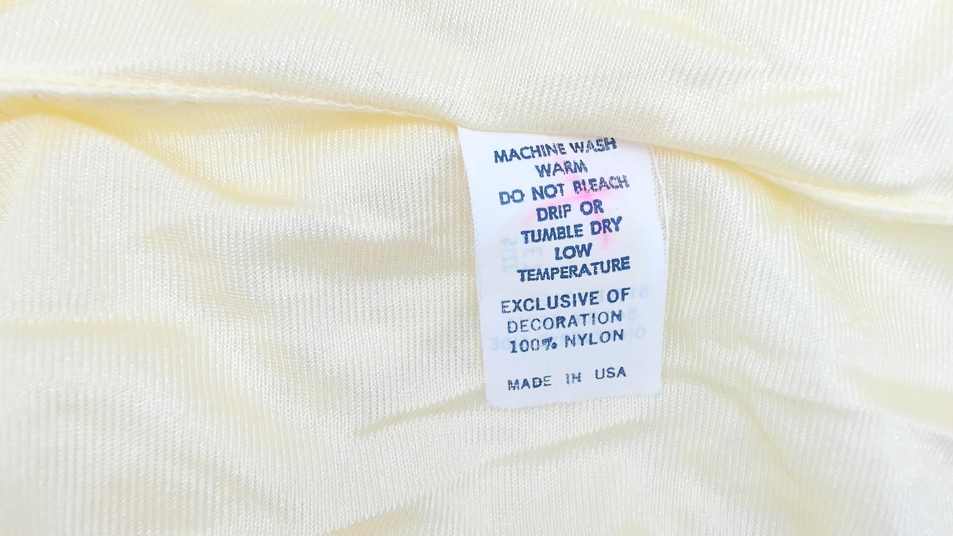80s pale yellow nylon teddy with floral lace trim and deep V-neck front. Lace panel insert at center front with single button closure, tank-style sleeveless construction, scalloped lace trim at leg openings and back neckline.