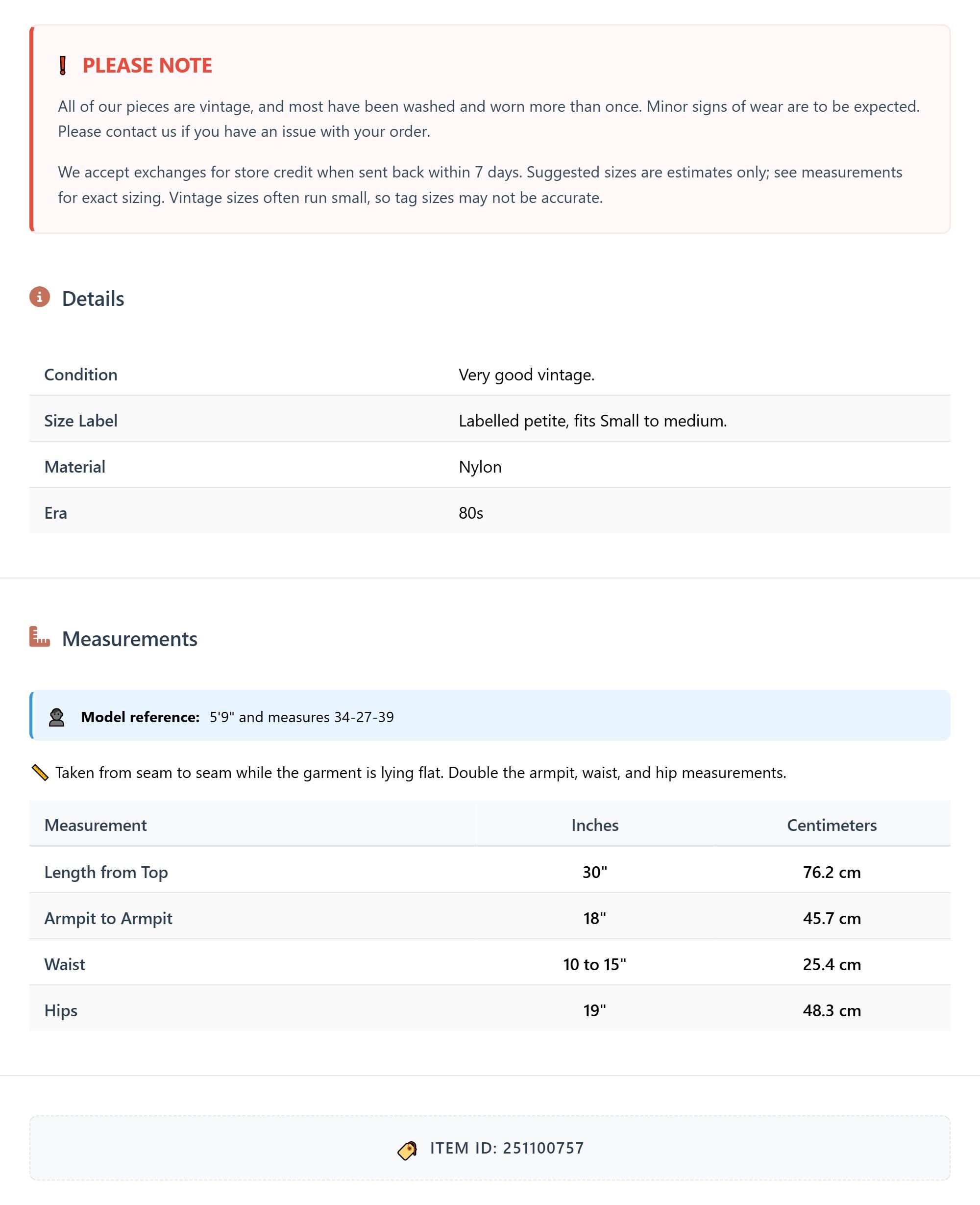 All of our pieces are vintage, and most have been washed and worn more than once. Minor signs of wear are to be expected. Please contact us if you have an issue with your order. We accept exchanges for store credit when sent back within 7 days.