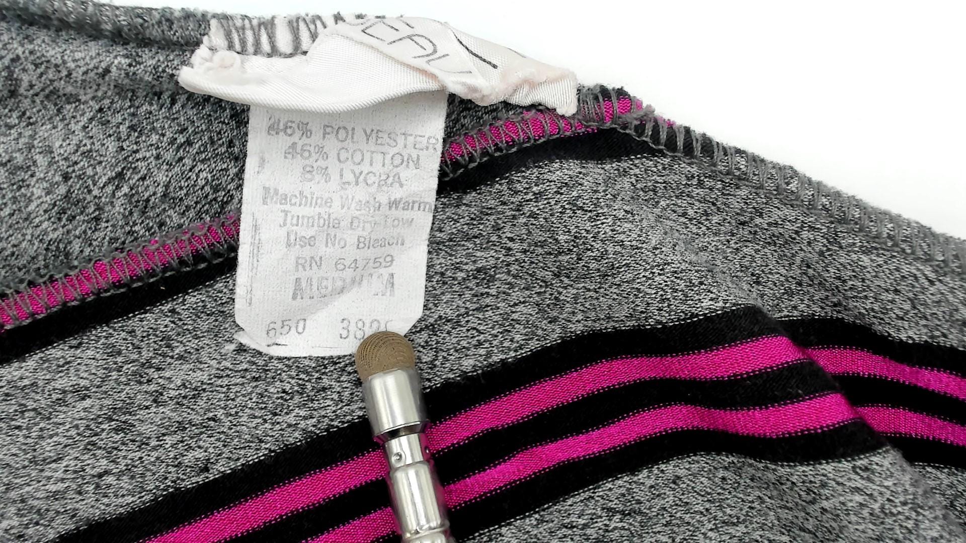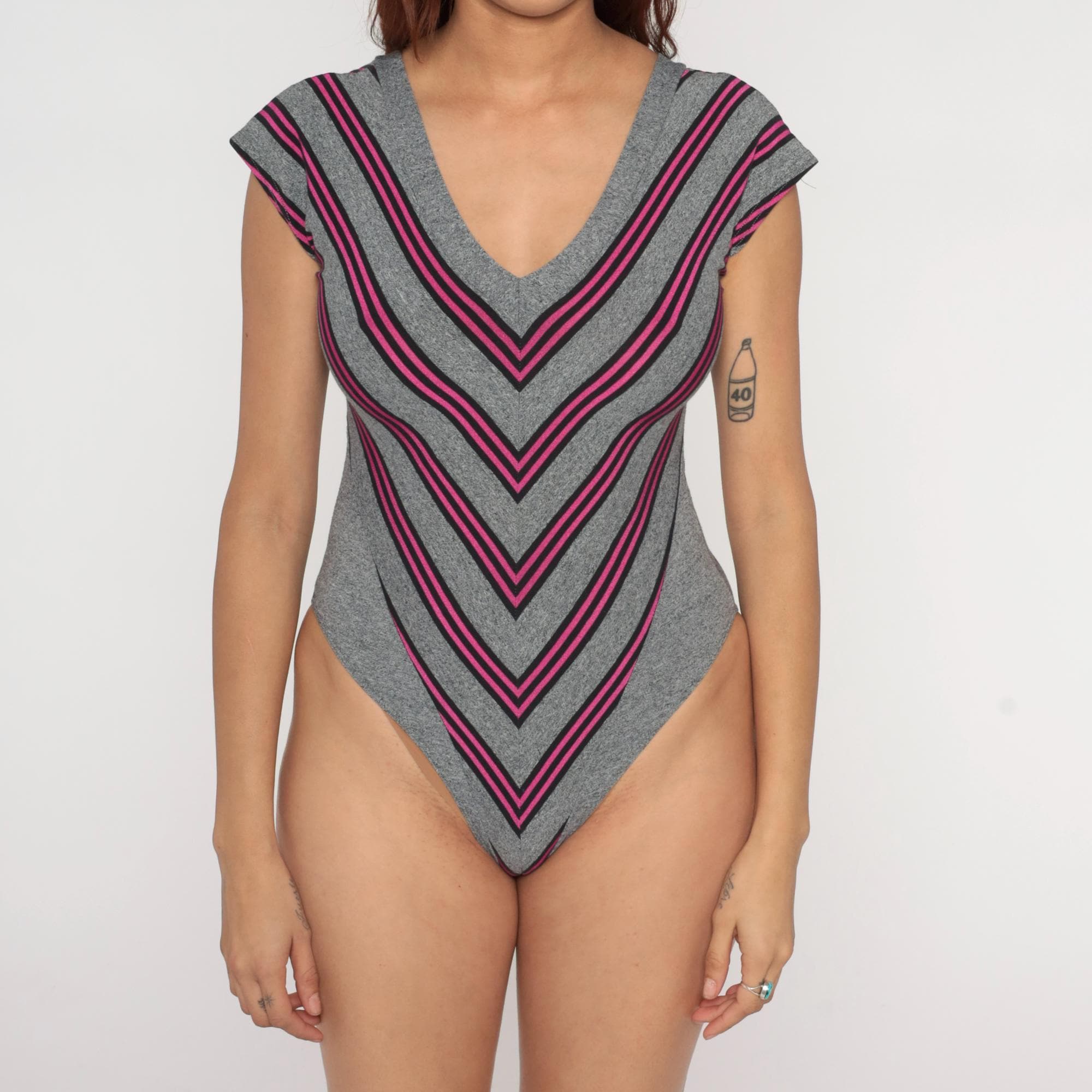 80s gray striped bodysuit with pink and black vertical stripes forming chevron pattern across the front. V-neckline at front and back, cap sleeves, high-cut leg openings.