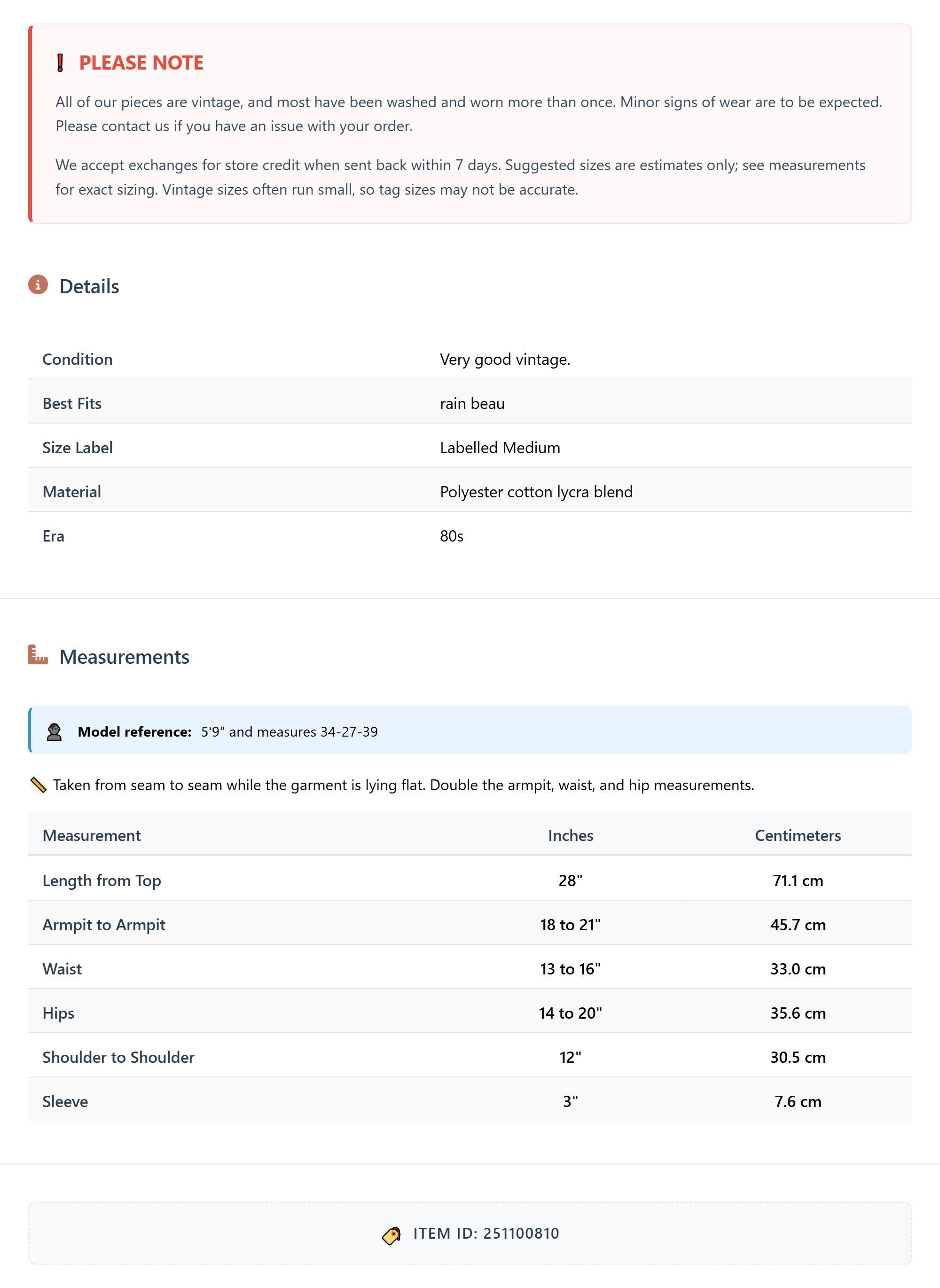 Measurements are taken laying flat and should be doubled where applicable. The "best fits" size is just an estimate, and vintage sizing can vary from modern sizing. Please use measurements to ensure proper fit. The best thing to do is measure a similar item of your own, and compare. When an item has stretch, we will list the unstretched dimensions with the stretched measurement afterwards.