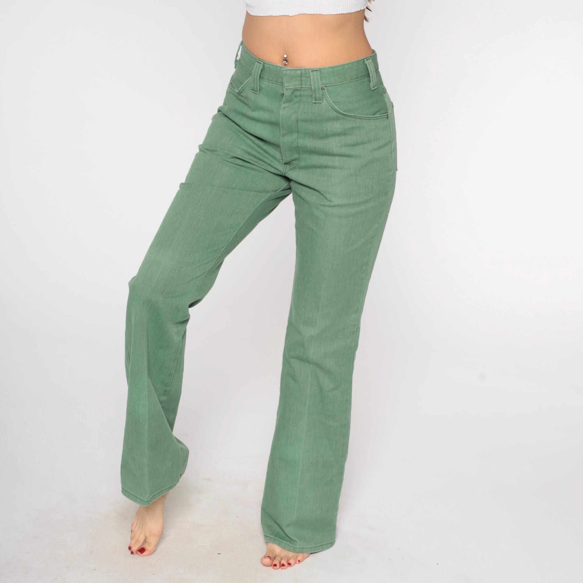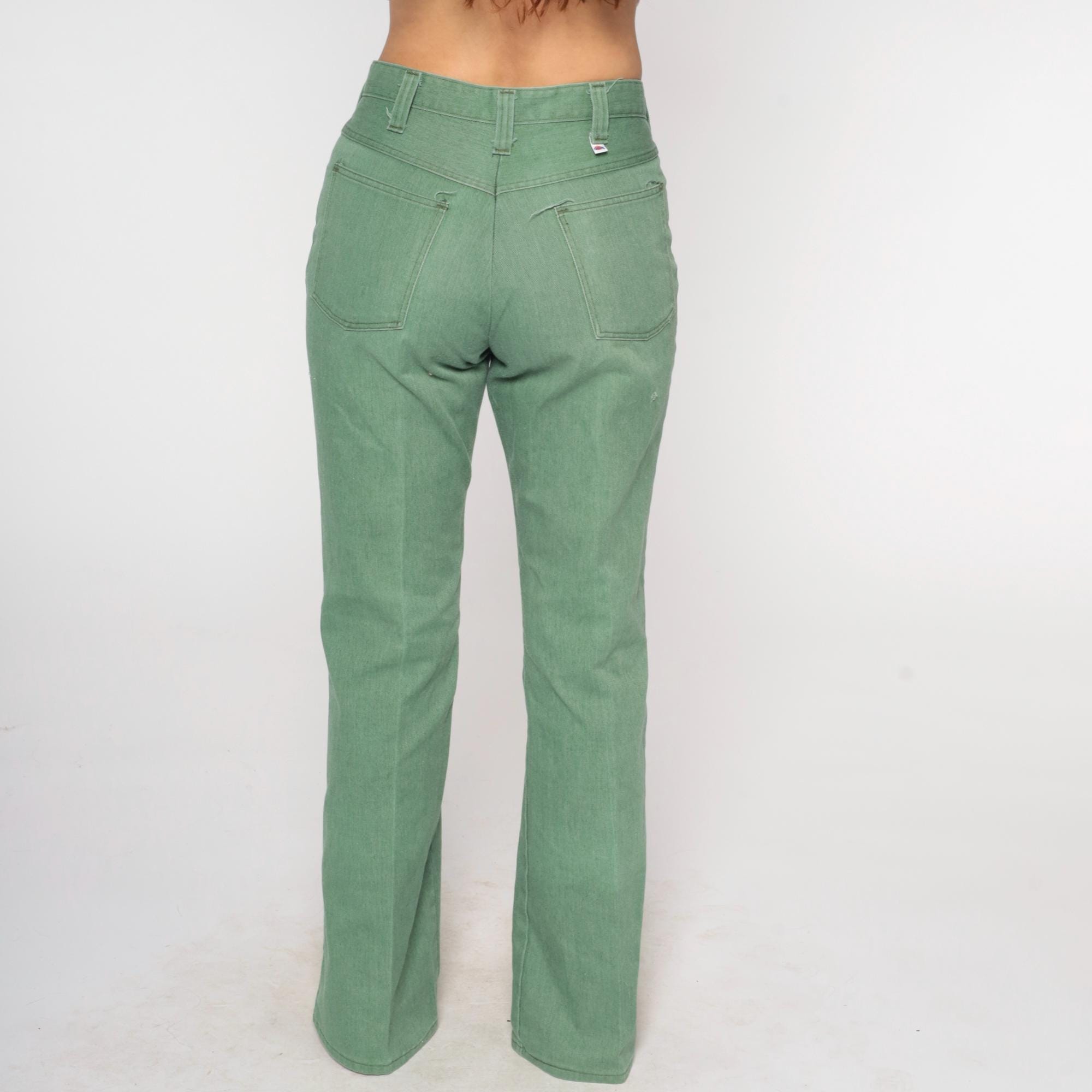 80s sage green flared jeans from Dickies in a cotton and polyester blend. Five-pocket construction with button and zip fly closure, belt loops at waist, and contrast topstitching throughout. Straight leg through thigh opening to a subtle flare at hem.