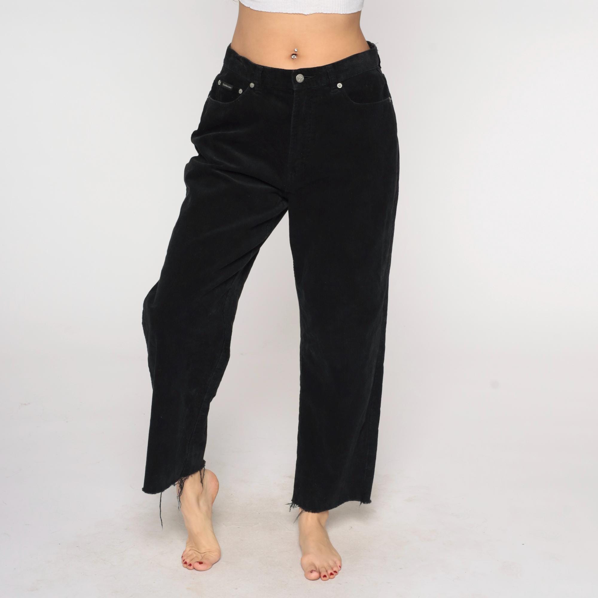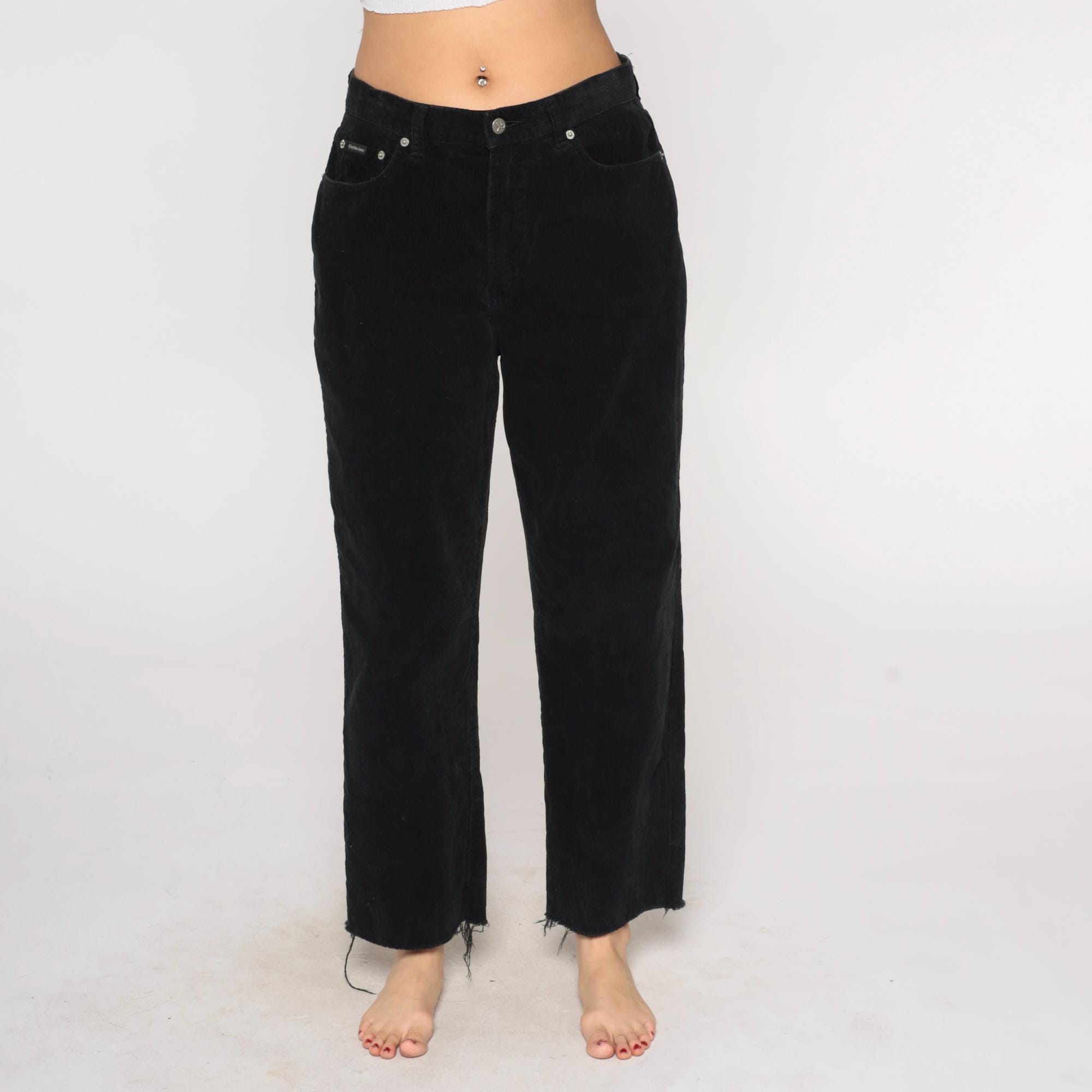 Y2K black corduroy pants from Calvin Klein with wide straight leg cut and raw unfinished hem. Five-pocket jean-style construction with button and zip fly closure.