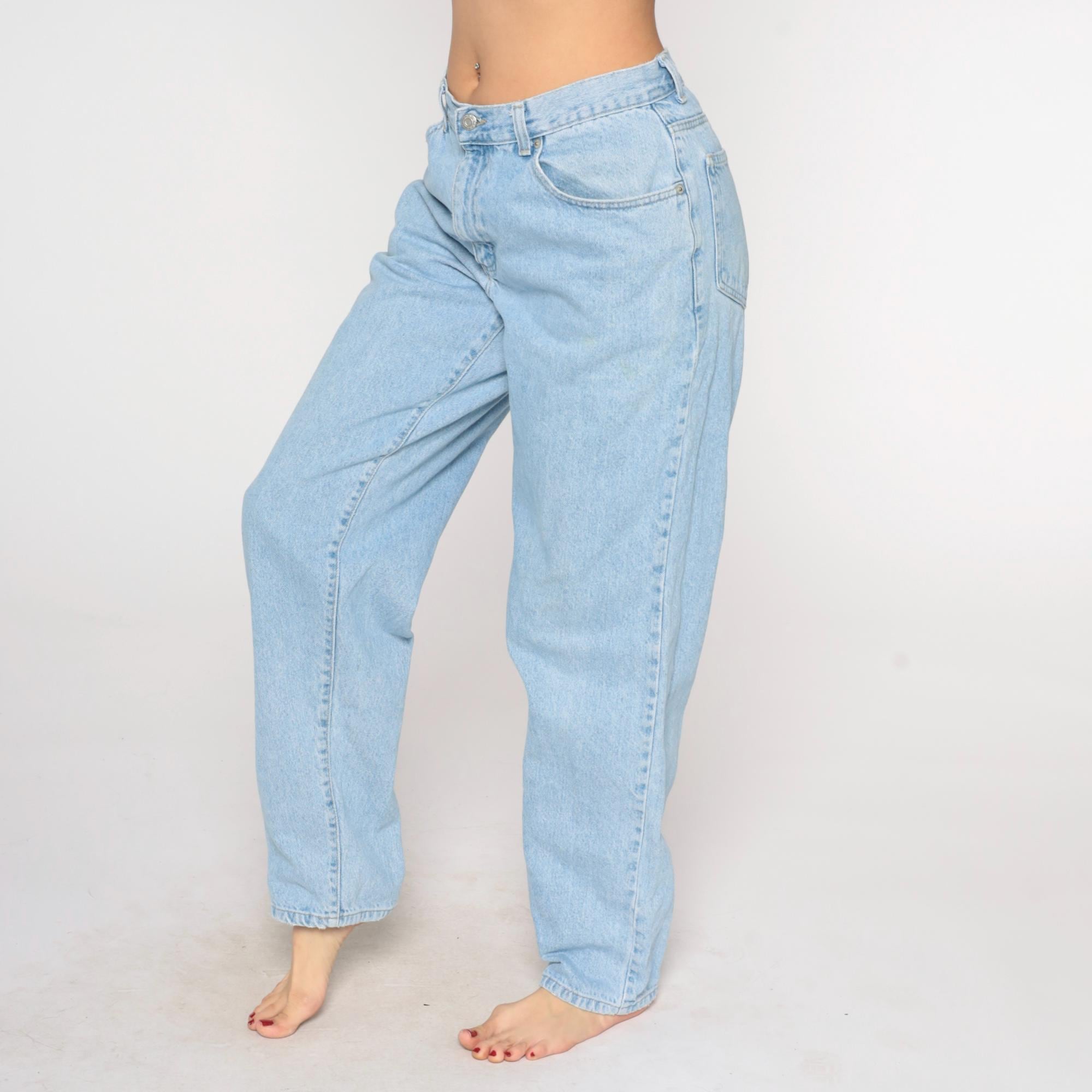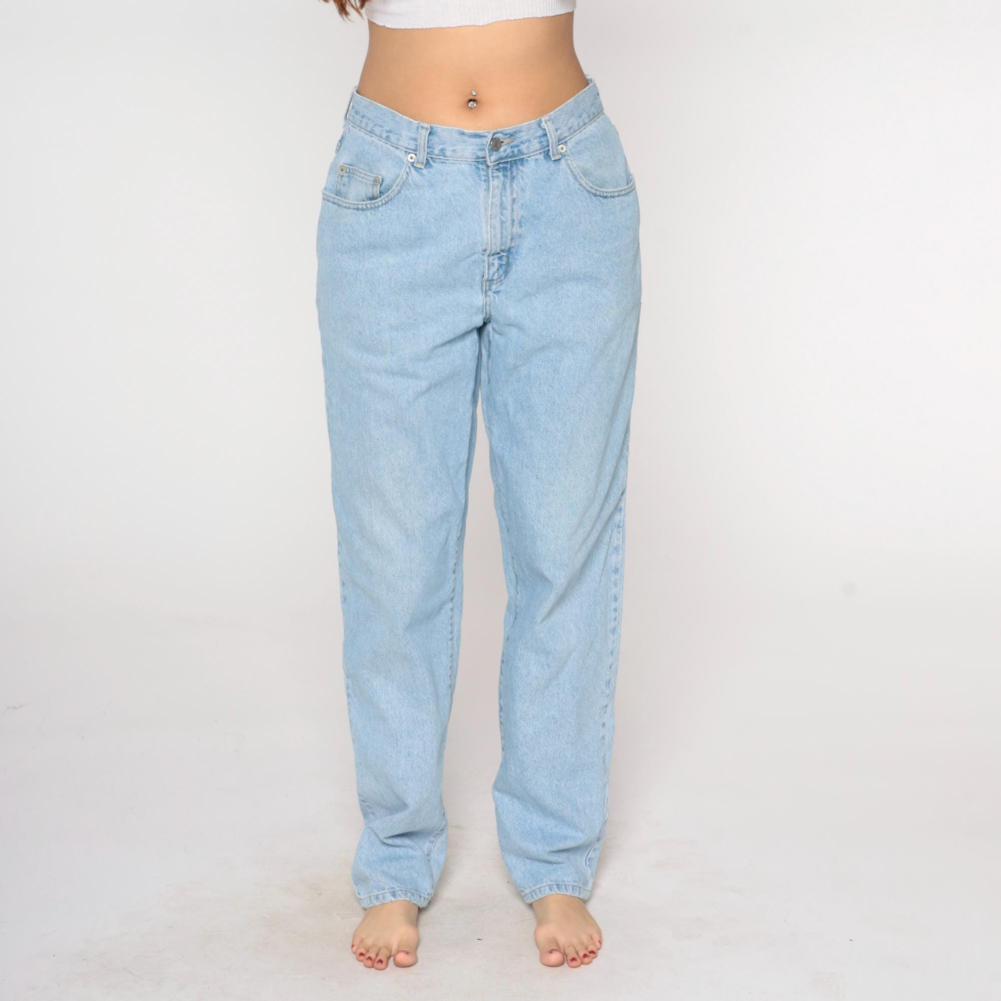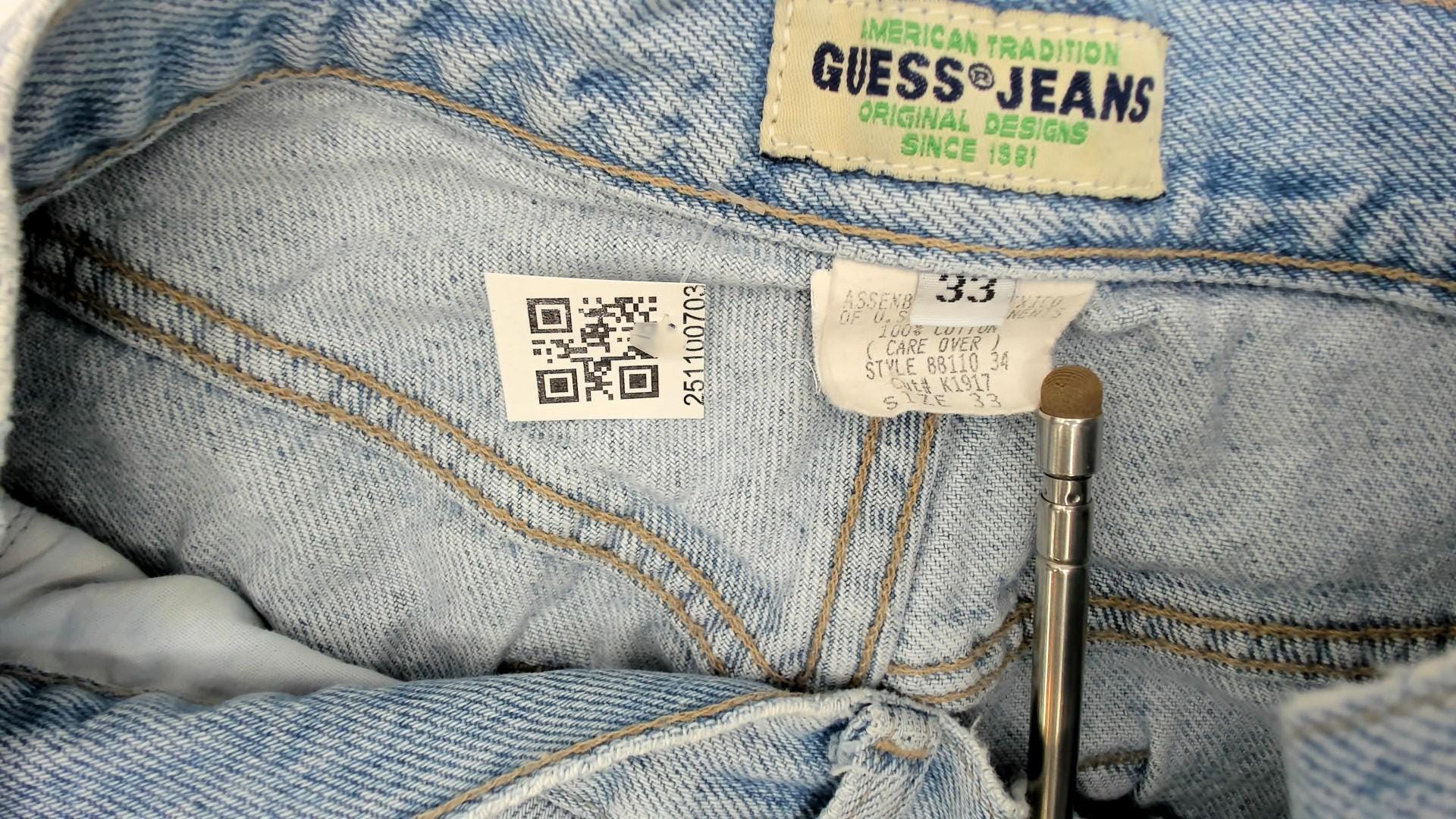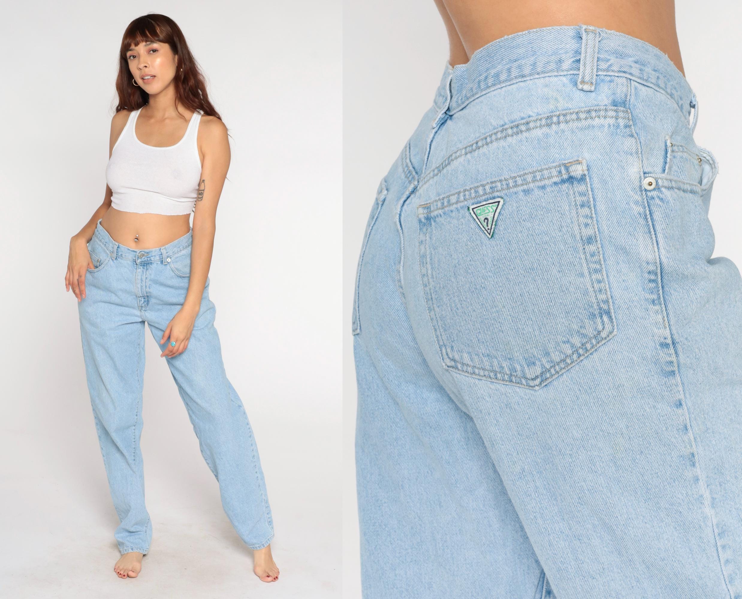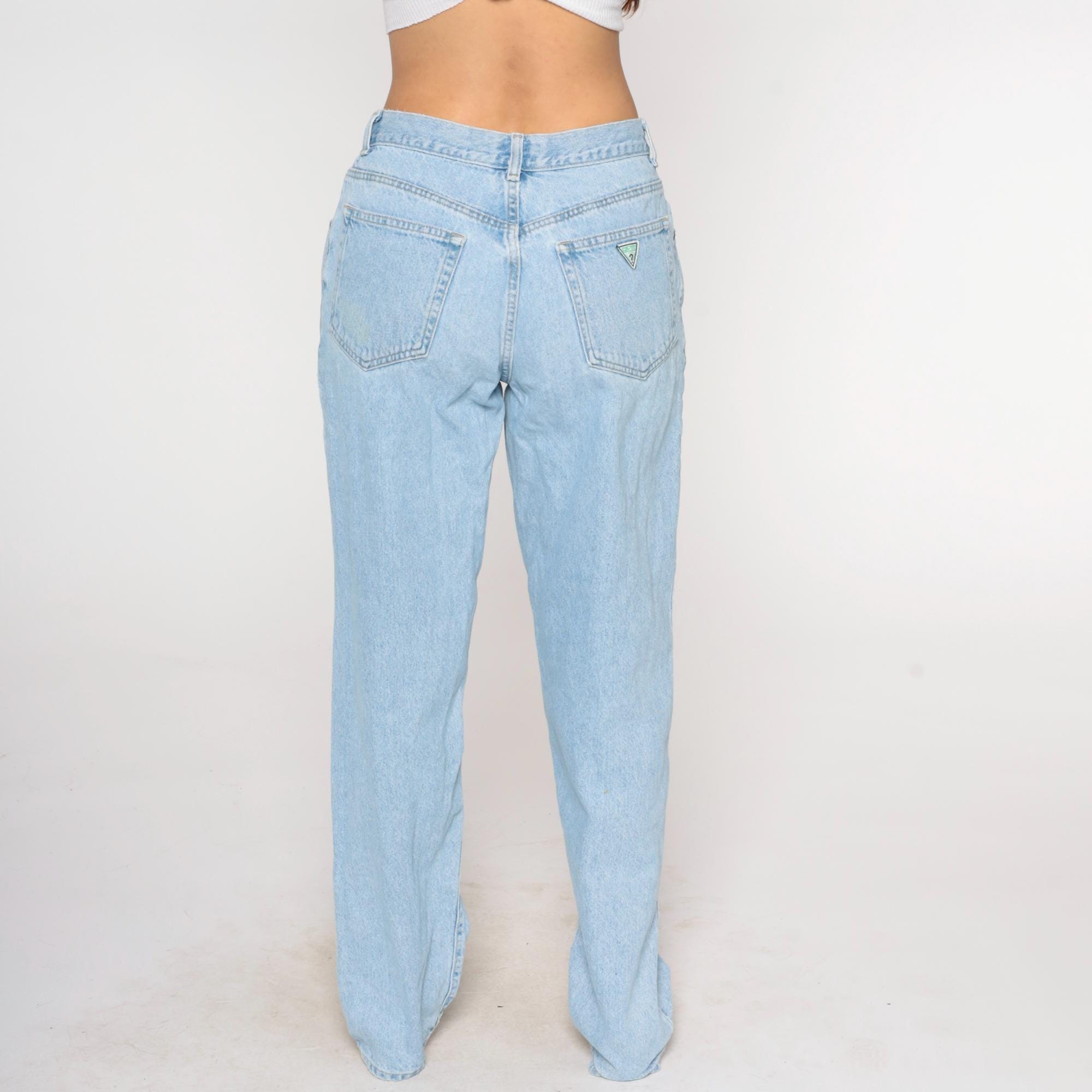 90s light blue high-waisted straight leg jeans from Guess with signature triangle logo on back pocket. Button fly closure, classic five-pocket styling, light stonewash finish throughout.