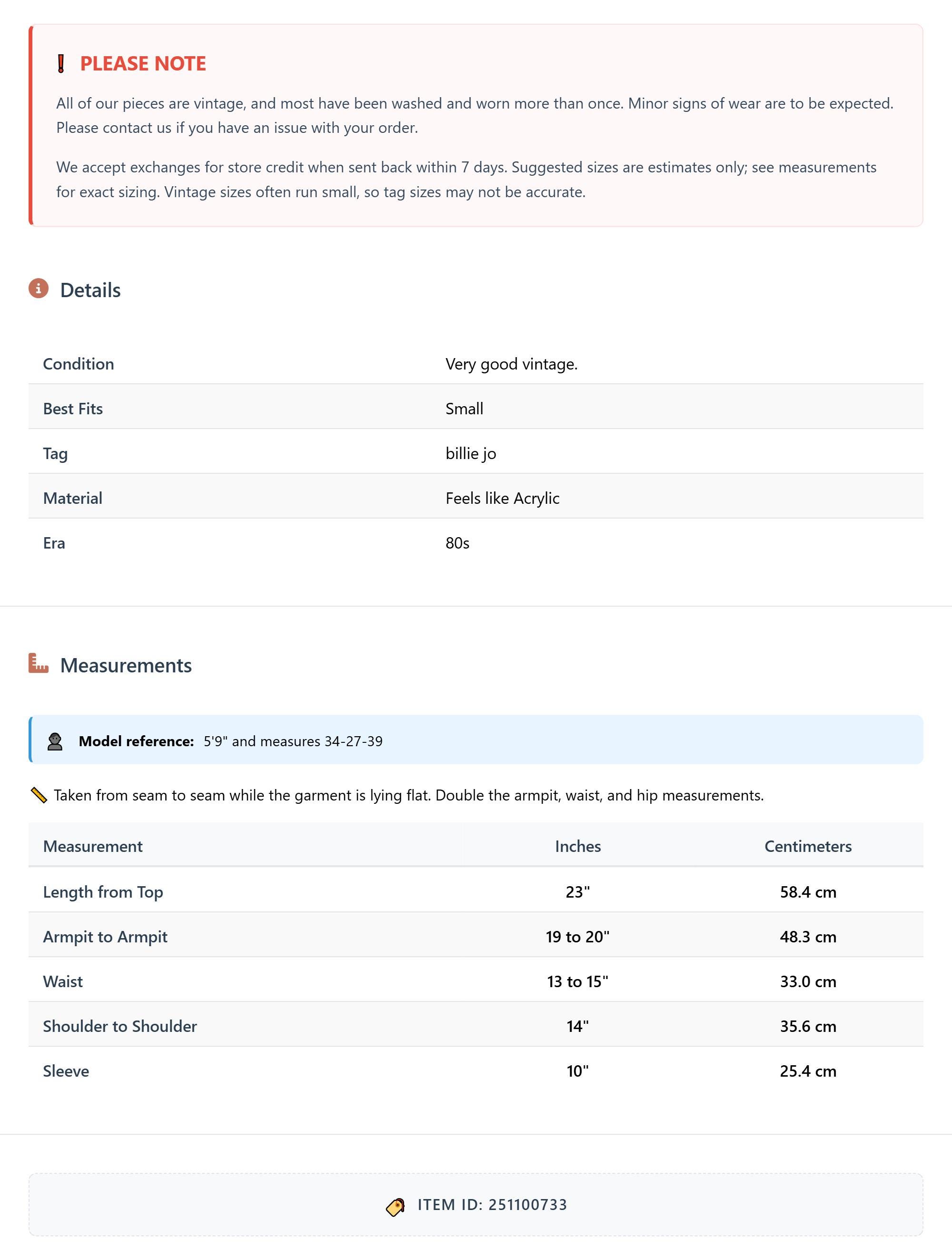 Suggested sizes are estimates only; see measurements for exact sizing. Vintage sizes often run small, so tag sizes may not be accurate.
