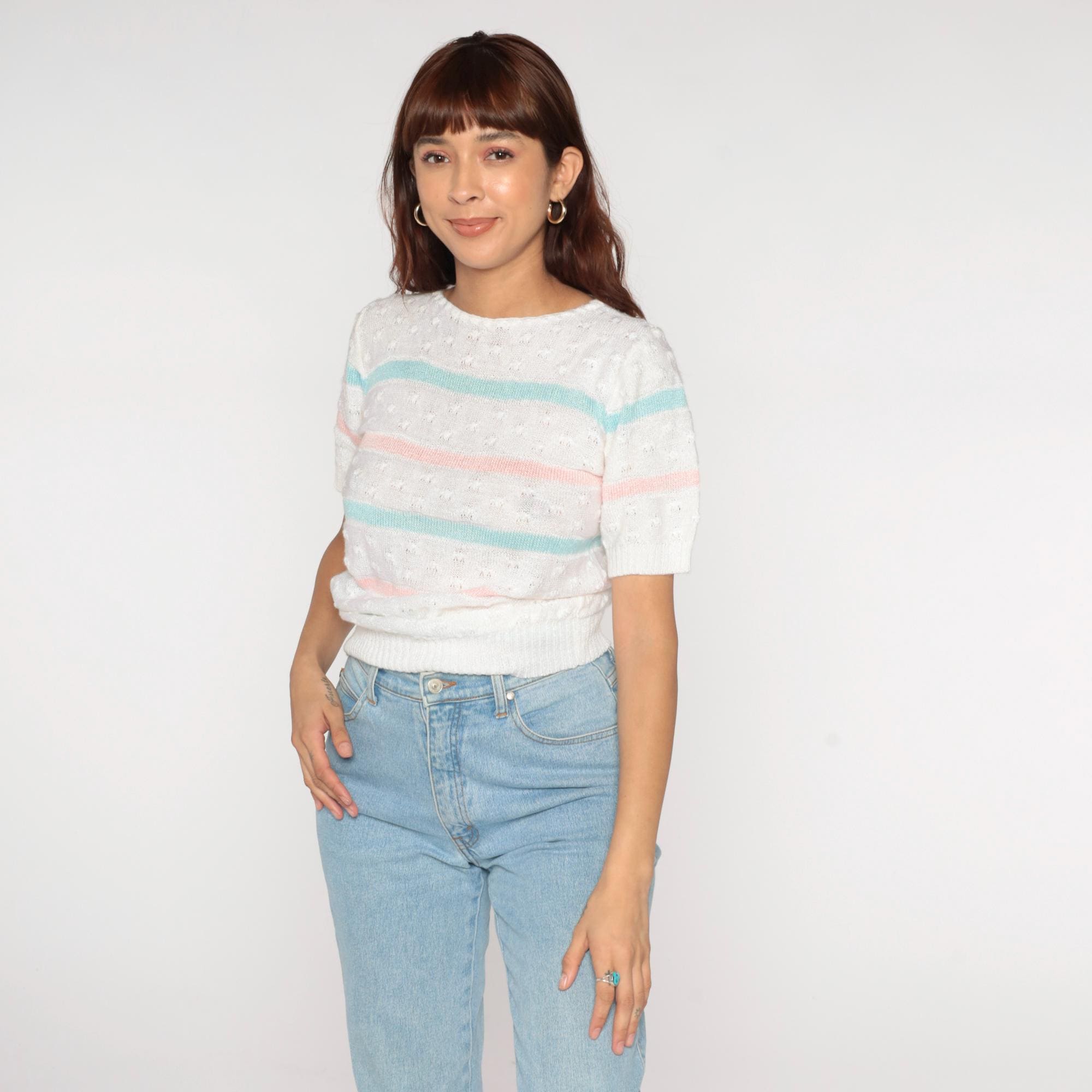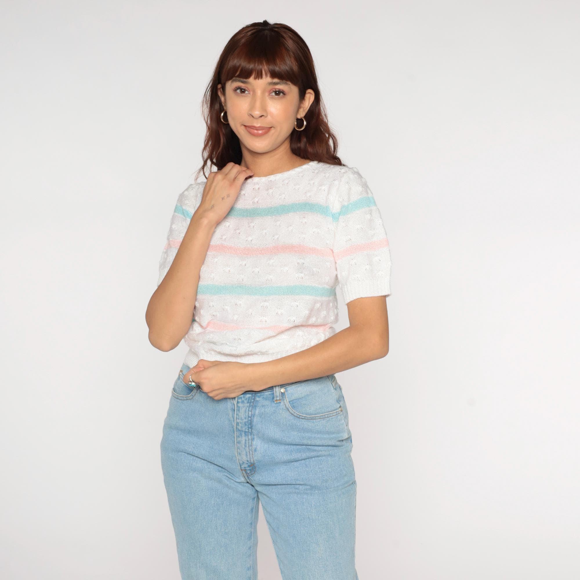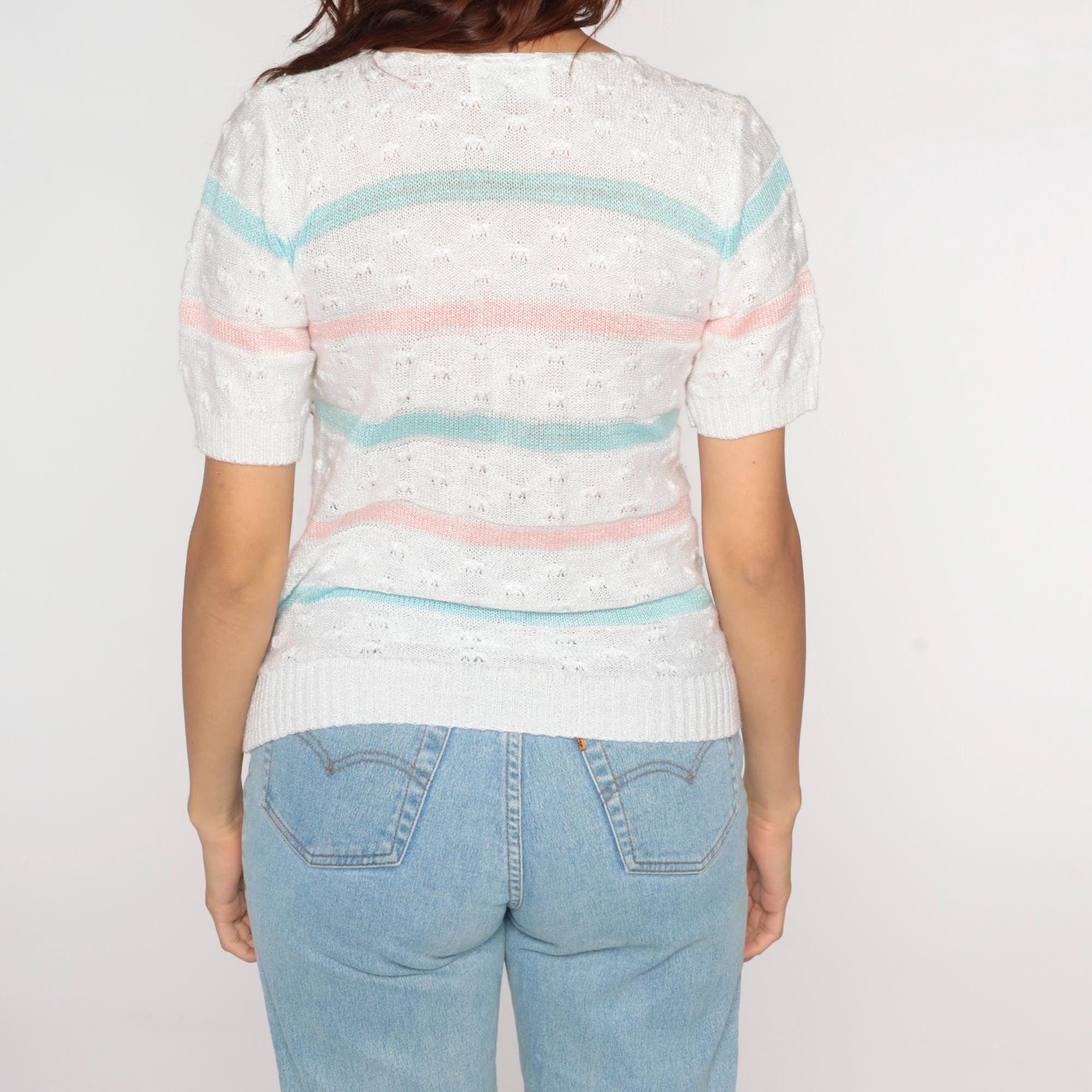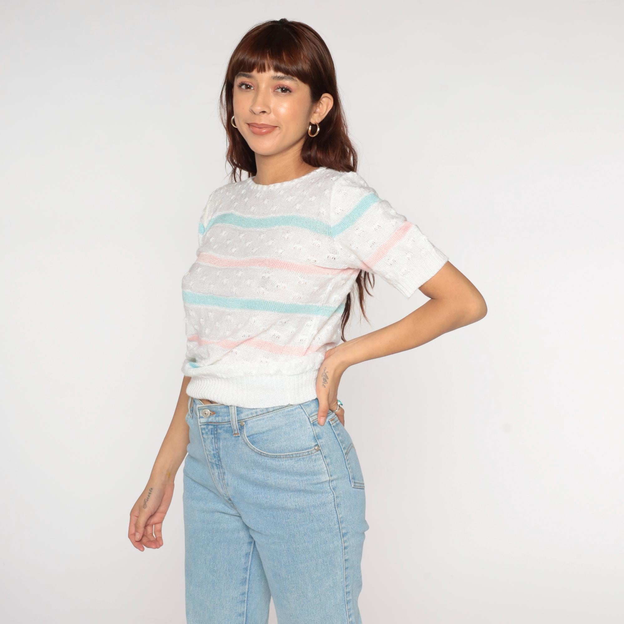 80s cream sweater from billie jo with pastel horizontal stripes in pale pink and light blue. Pointelle open knit texture throughout, short sleeves, crew neckline with ribbed trim at collar, cuffs, and hem.