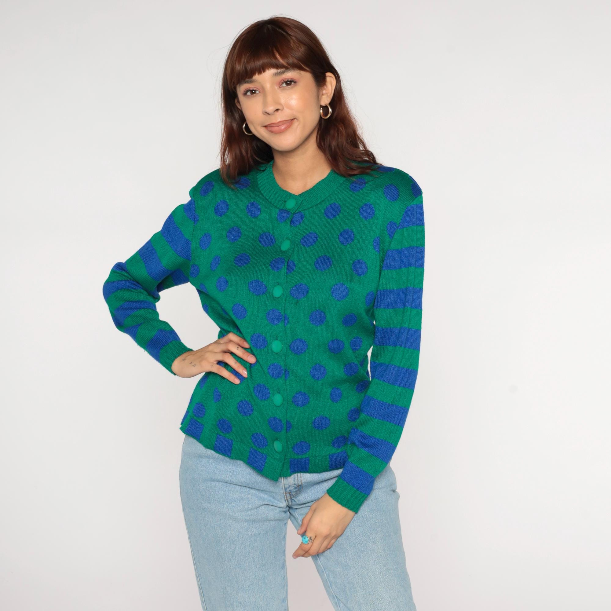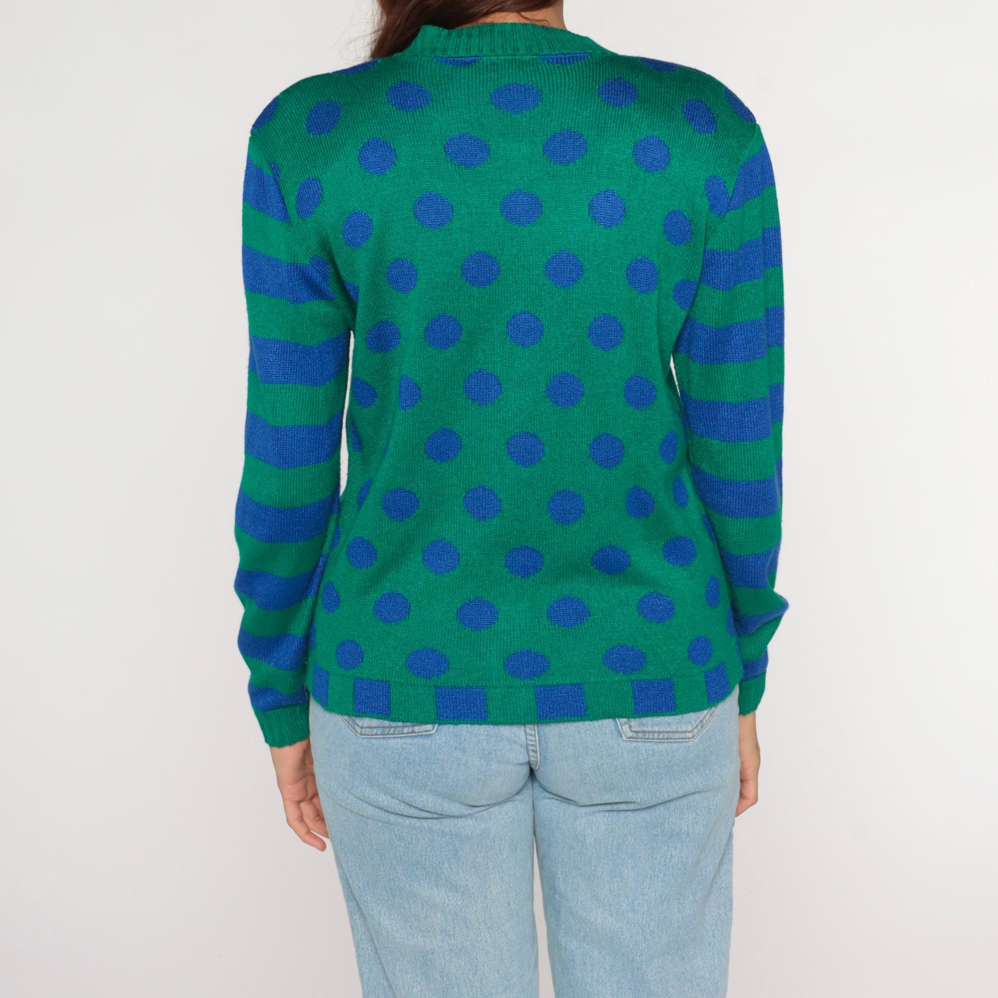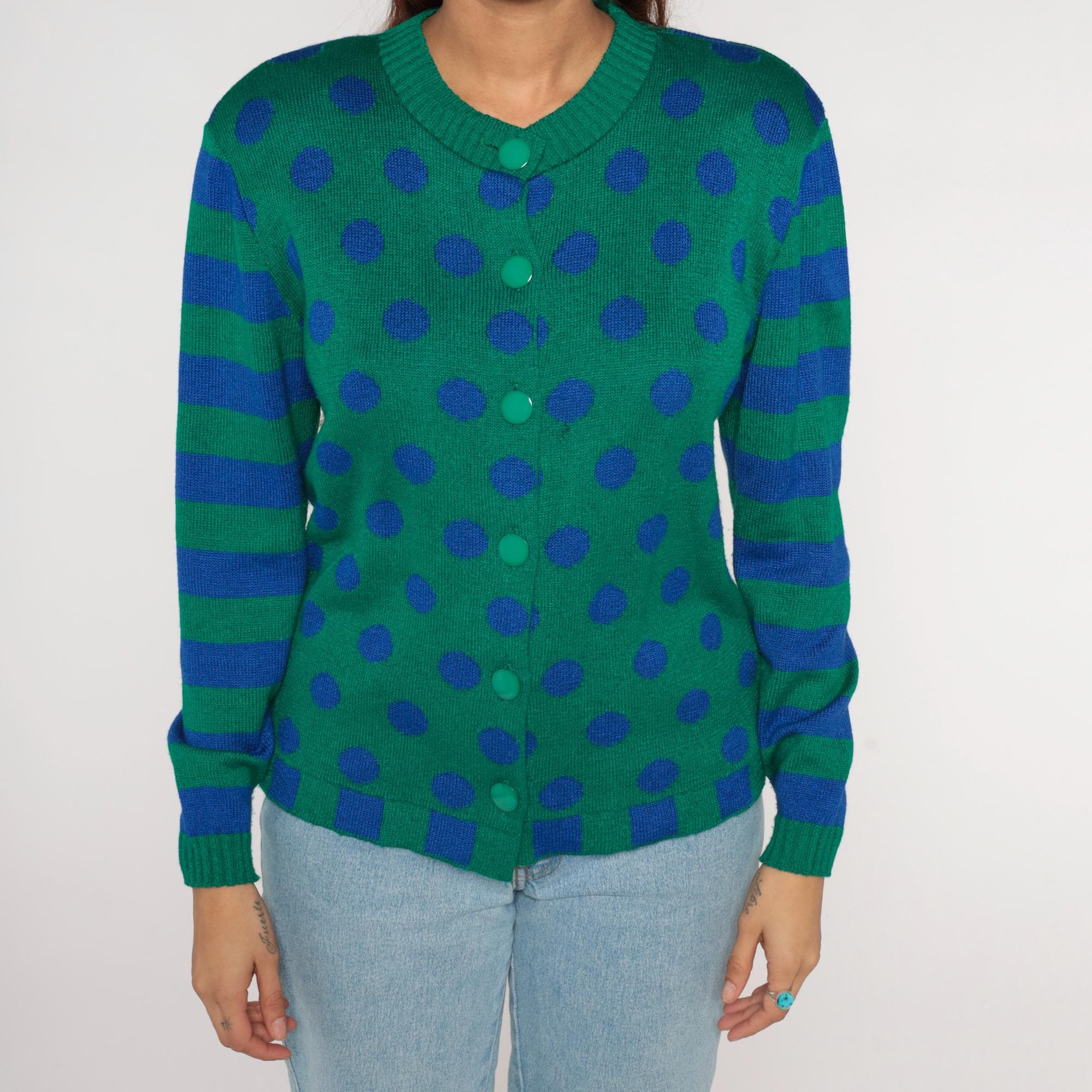 80s green cardigan from ami knits with blue polka dots across the body and blue and green horizontal stripes on the sleeves. Button front closure with matching green buttons, V-neck collar, ribbed trim at collar, cuffs, and hem with blue and green checkerboard pattern.