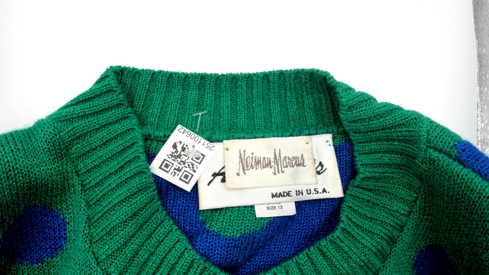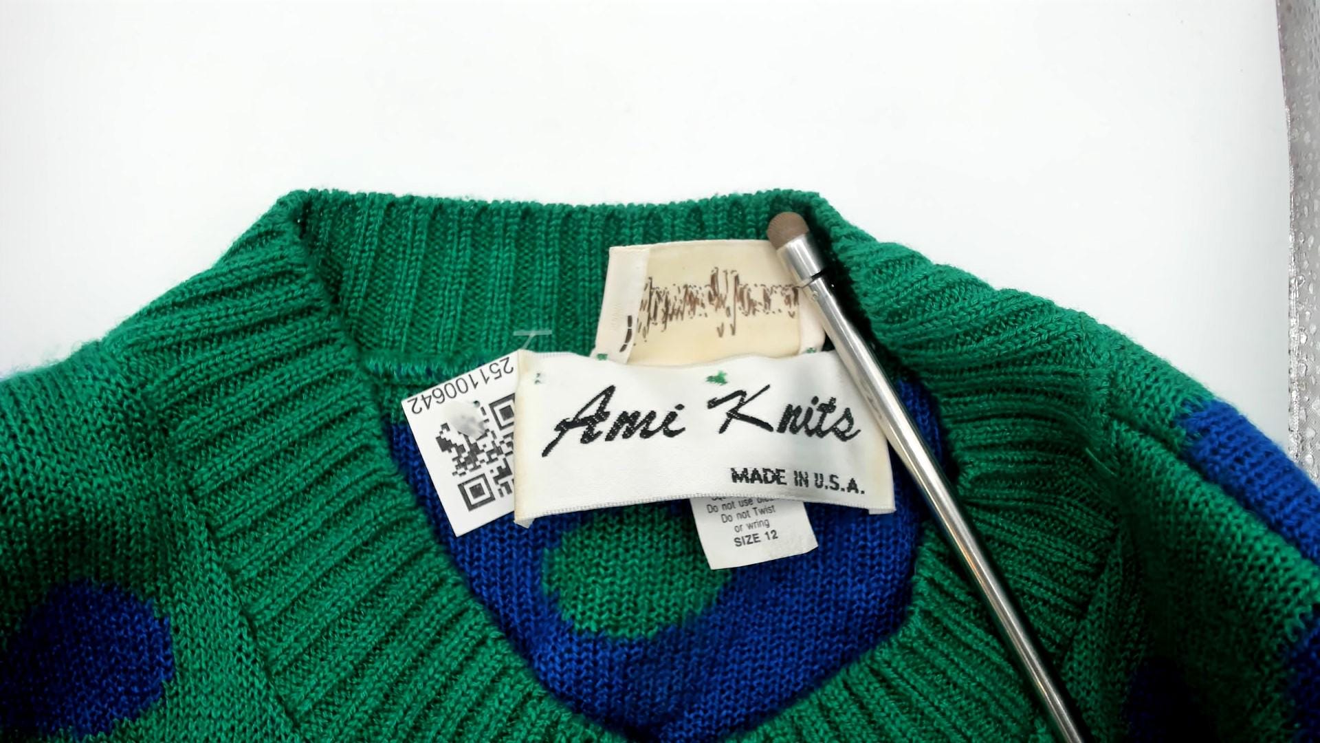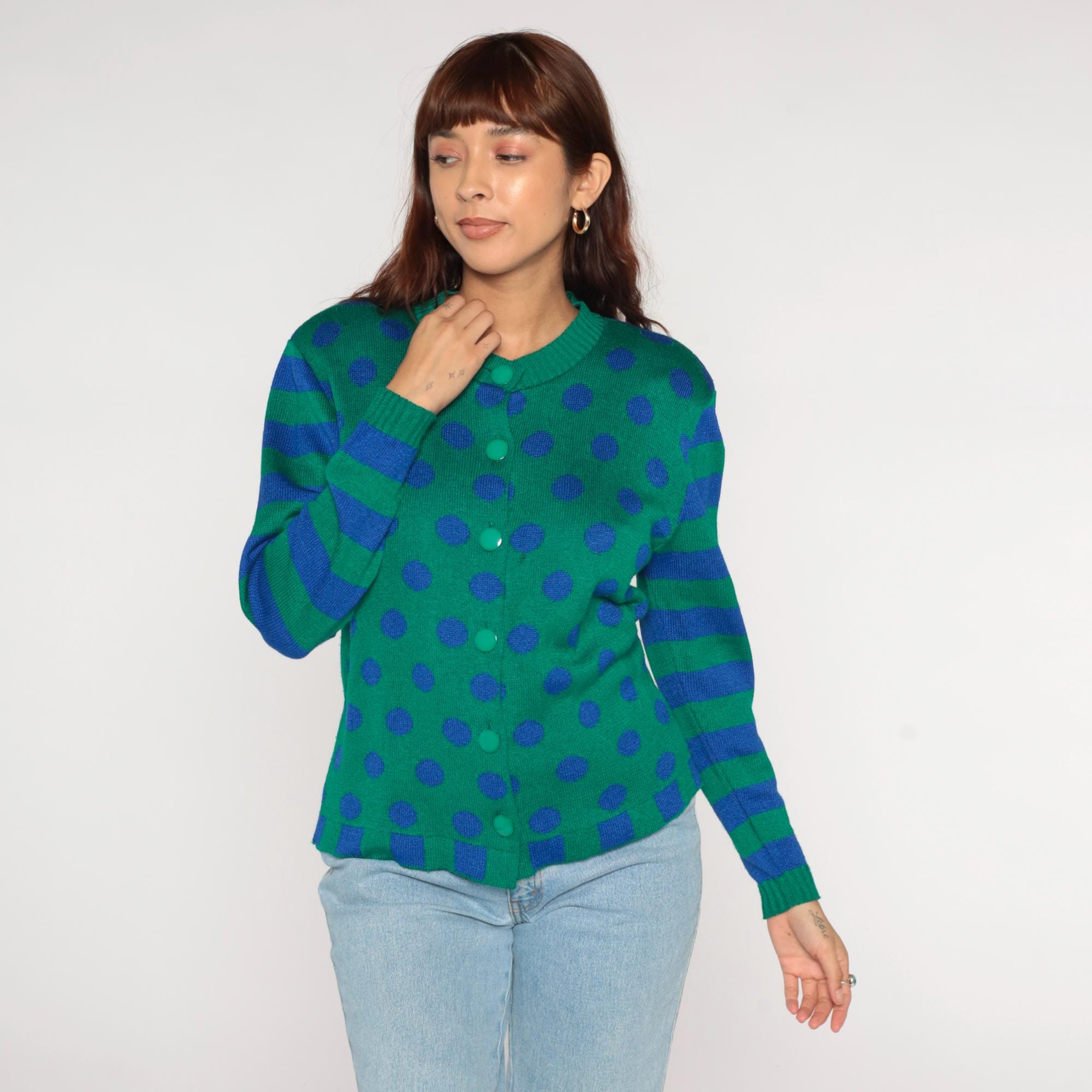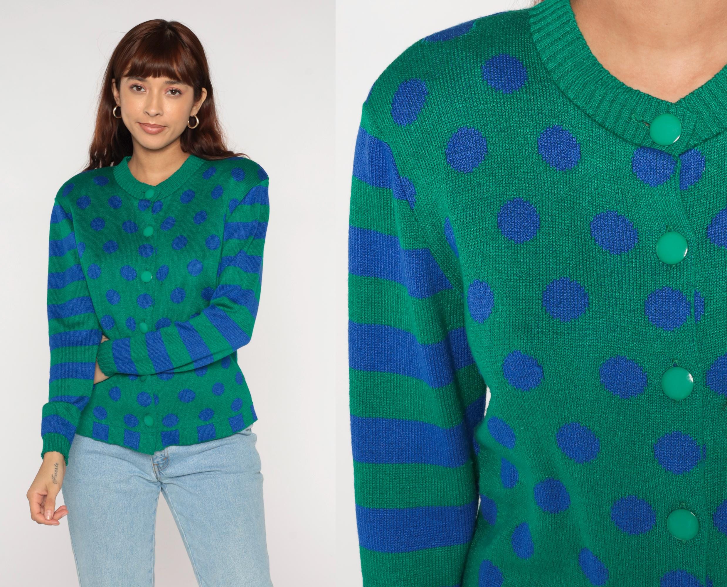 80s green cardigan from ami knits with blue polka dots across the body and blue and green horizontal stripes on the sleeves. Button front closure with matching green buttons, V-neck collar, ribbed trim at collar, cuffs, and hem with blue and green checkerboard pattern.