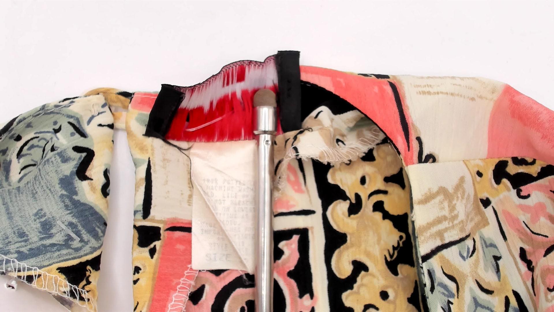 90s short-sleeve blouse with all-over patchwork tile print in pastel pink, yellow, pale blue, cream, and black. Each geometric block features decorative scrollwork and floral motifs creating a quilted appearance.