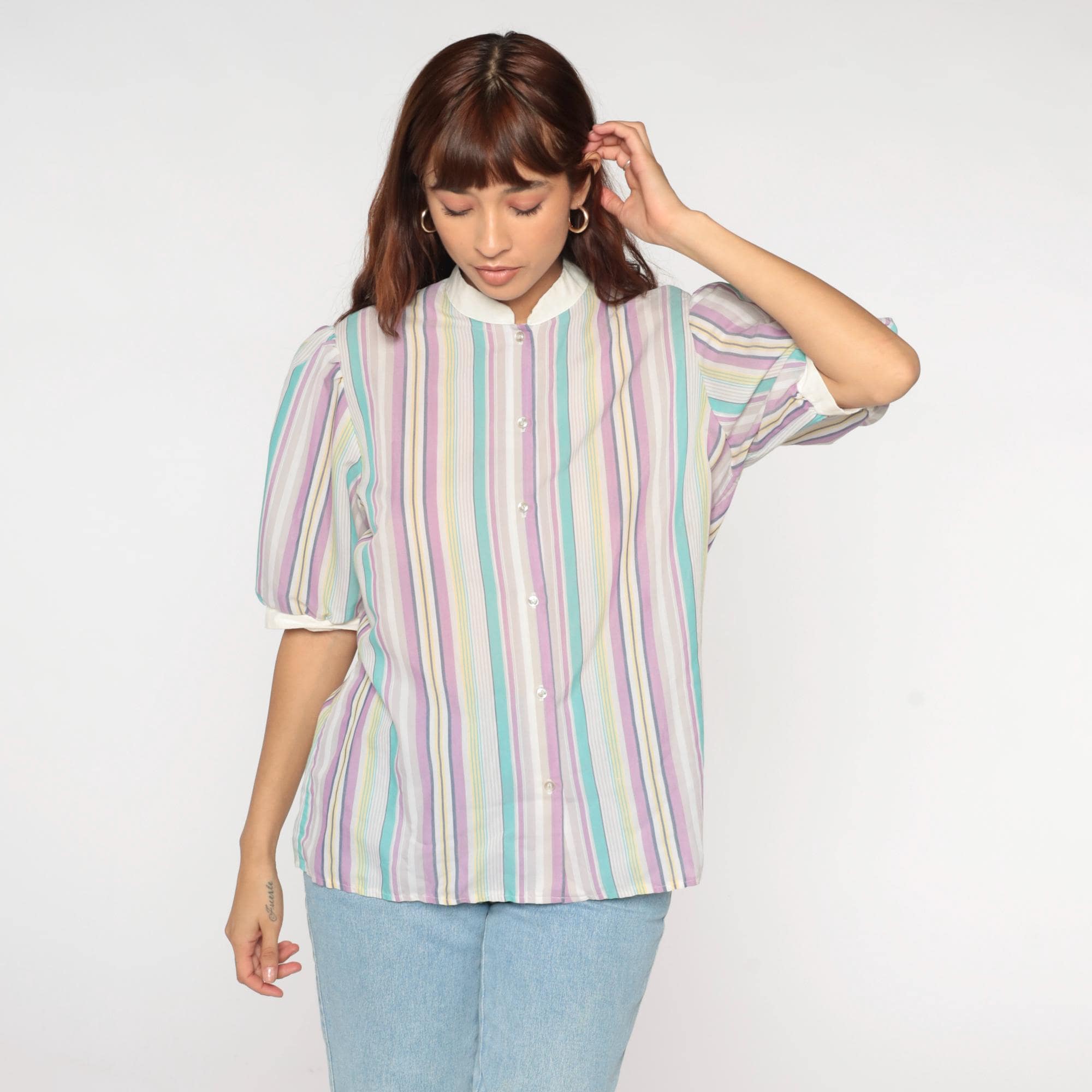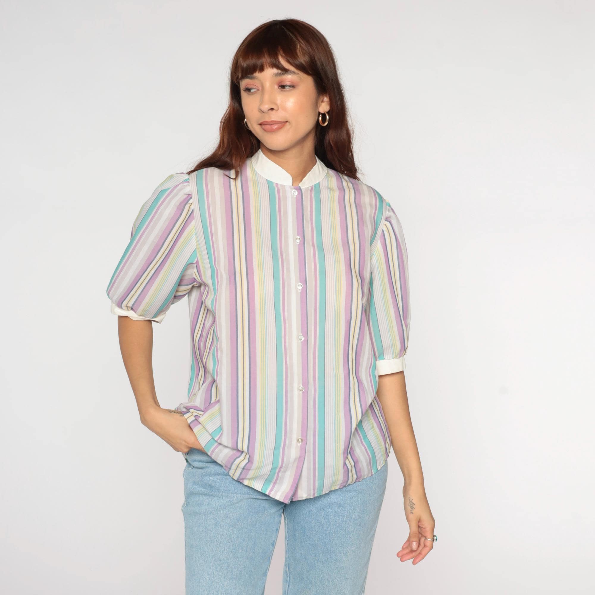 80s pastel striped shirt from koret with white peter pan collar and button front closure. Lavender, mint, yellow, and pink vertical stripes across the fabric. Short puffed sleeves with white cuffs matching the collar.