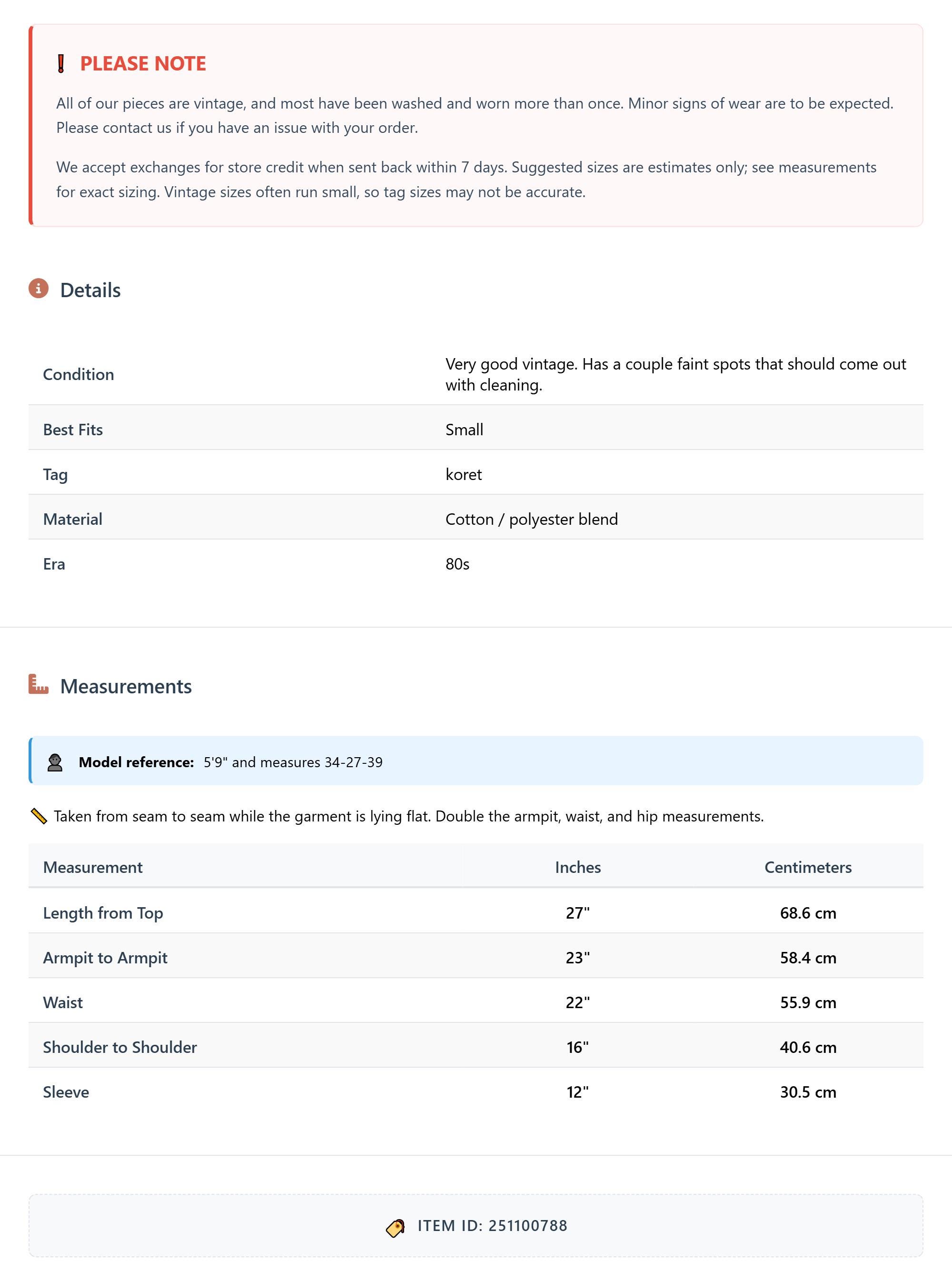 All of our pieces are vintage, and most have been washed and worn more than once. Minor signs of wear are to be expected. Please contact us if you have an issue with your order. We accept exchanges for store credit when sent back within 7 days.