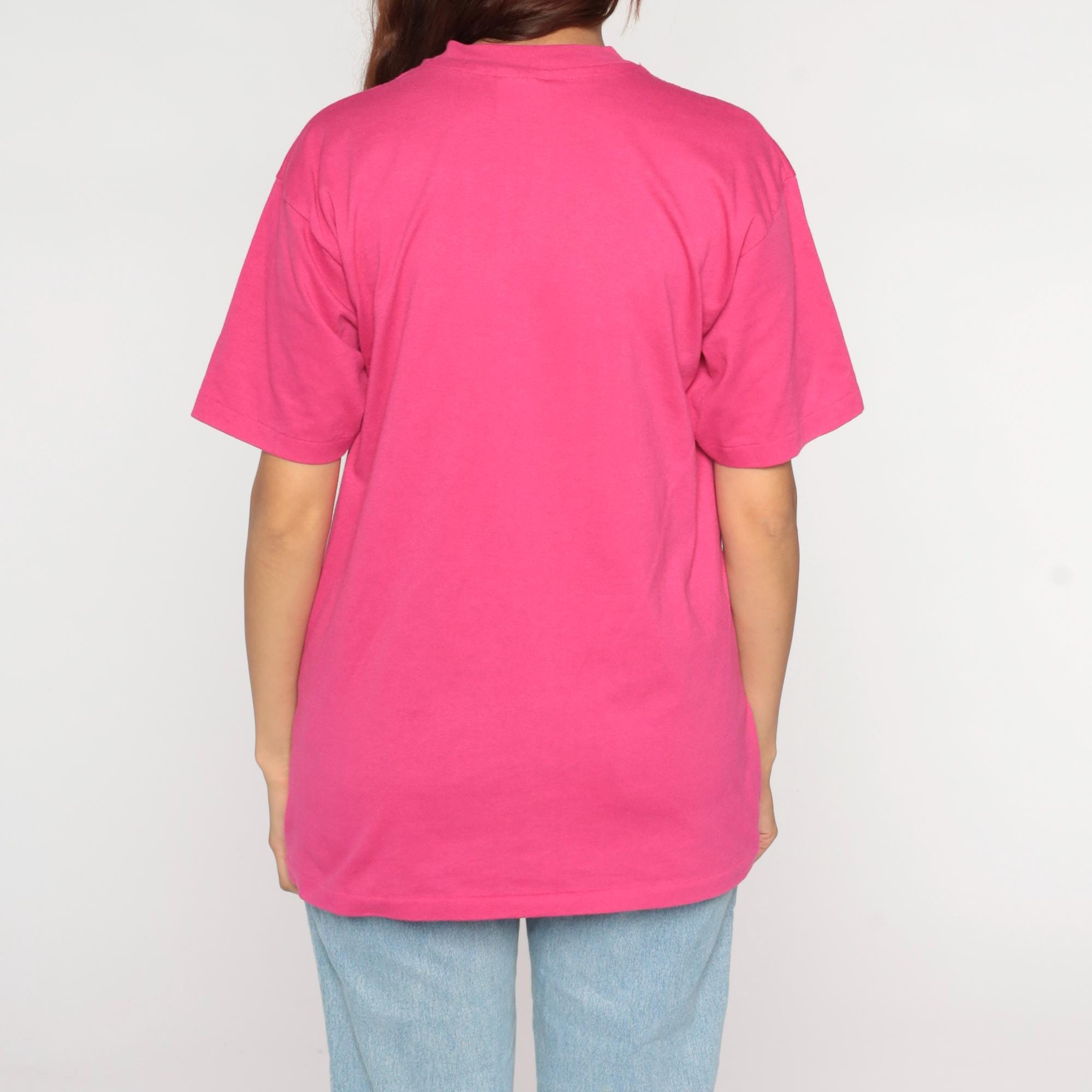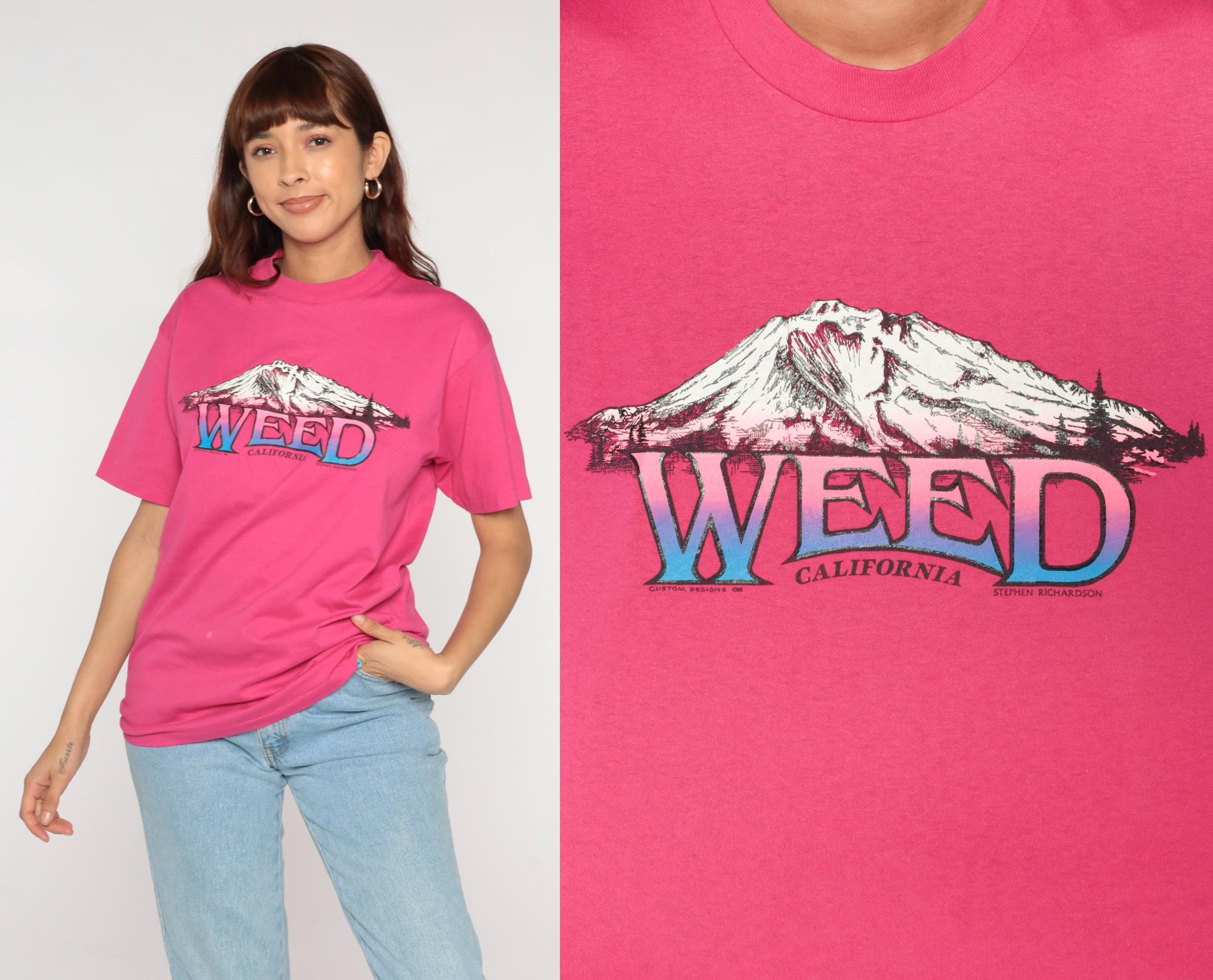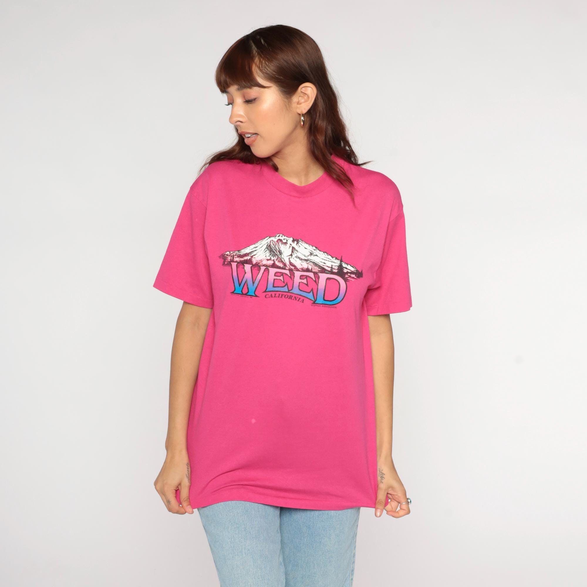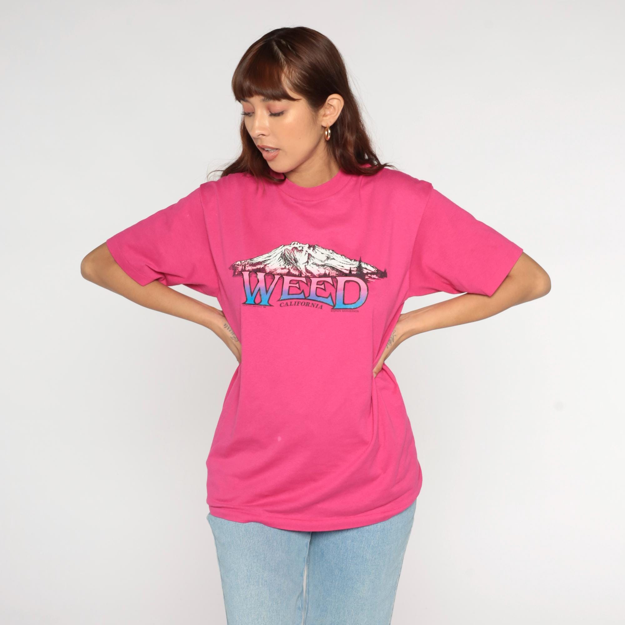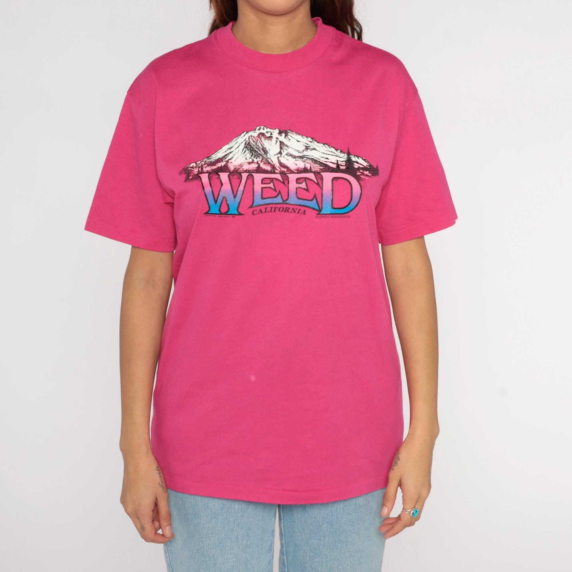 80s hot pink graphic t-shirt from Hanes with "Weed California" lettering and mountain illustration across the front in gradient pink and blue. Crew neck with short sleeves.