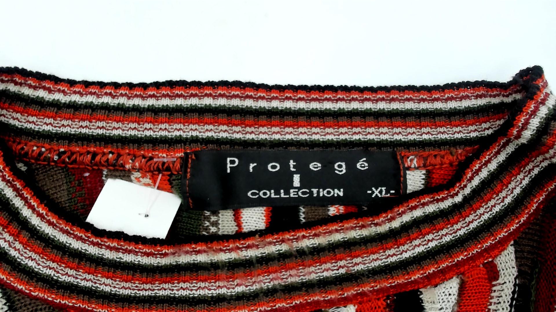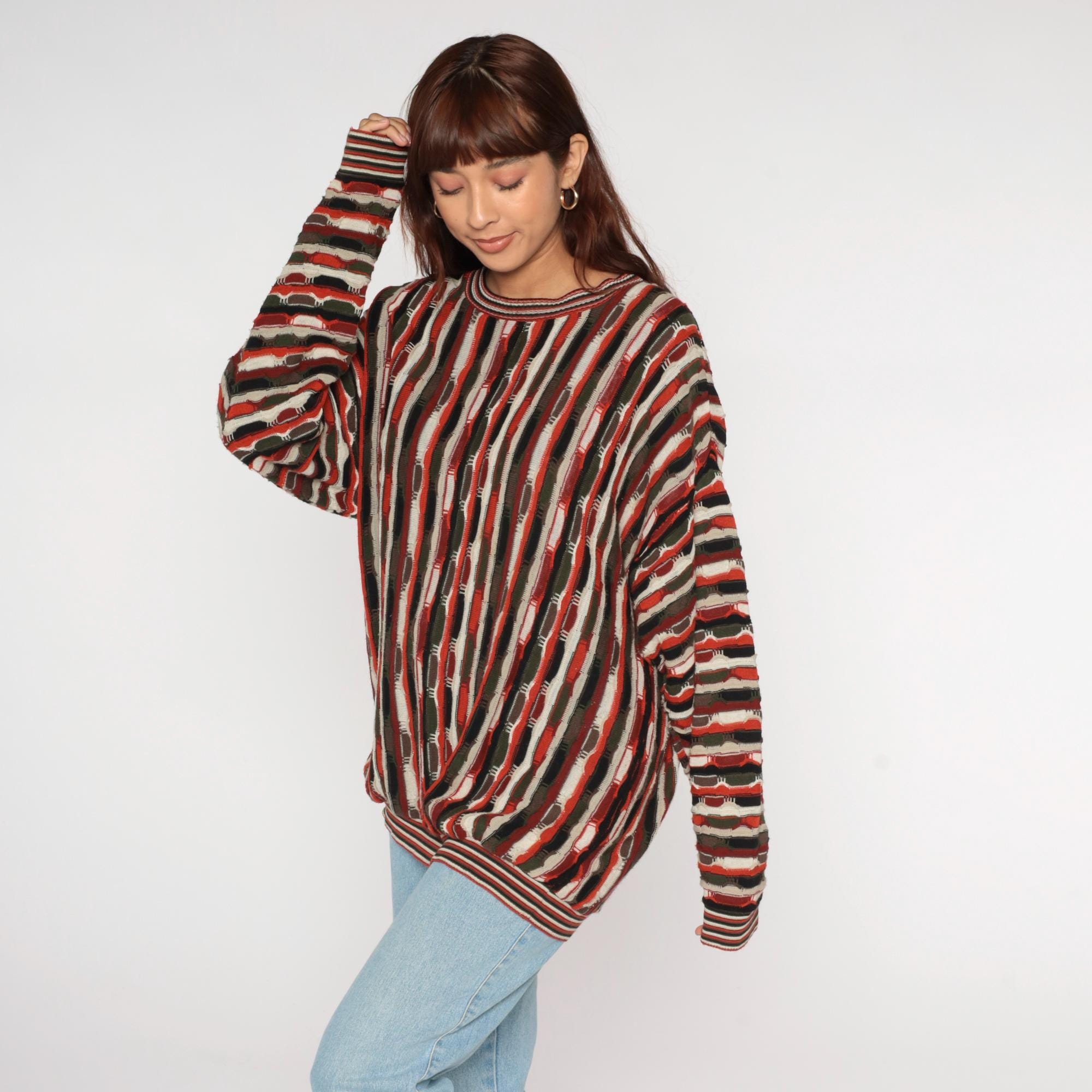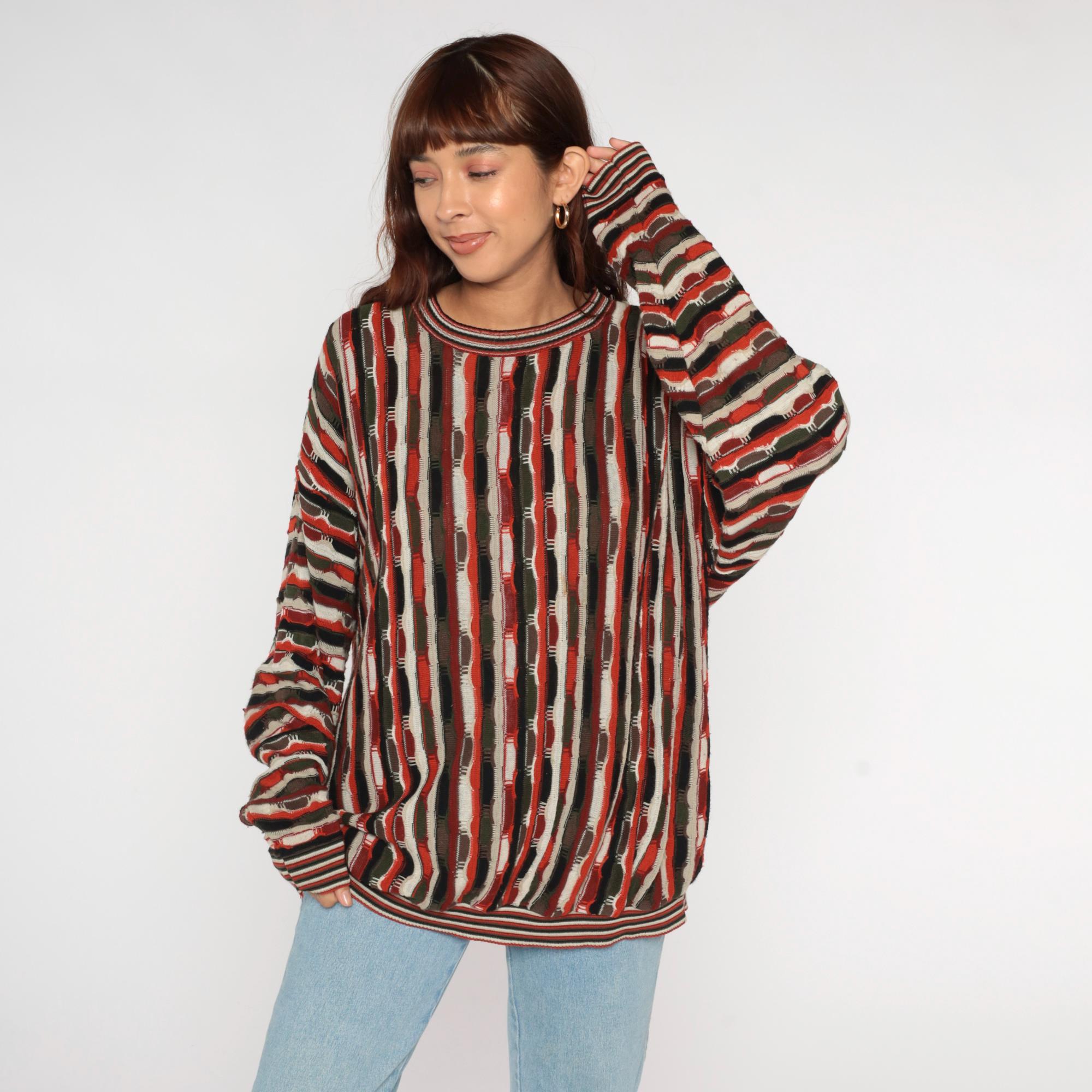 90s oversized sweater from protege with irregular vertical stripes in rust red, olive green, black, and cream. Crew neckline with ribbed collar, long sleeves with ribbed cuffs, ribbed hem. Horizontal striping pattern on sleeves contrasts with vertical body stripes.