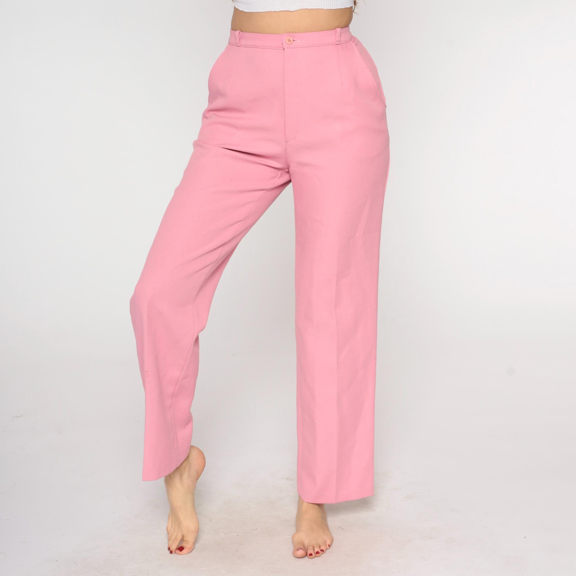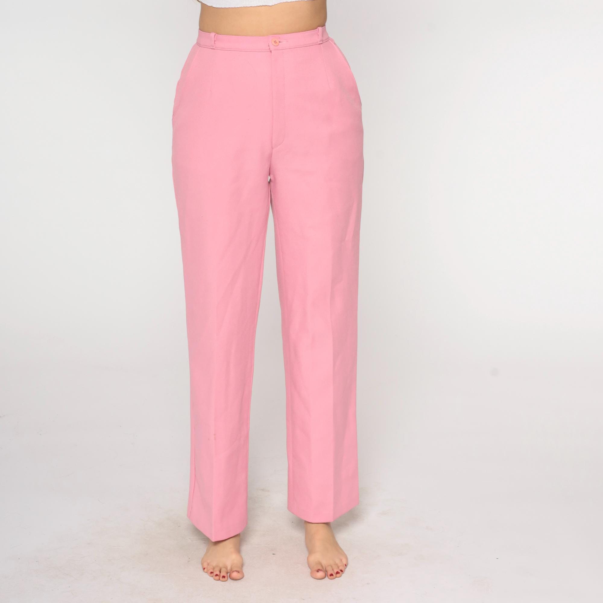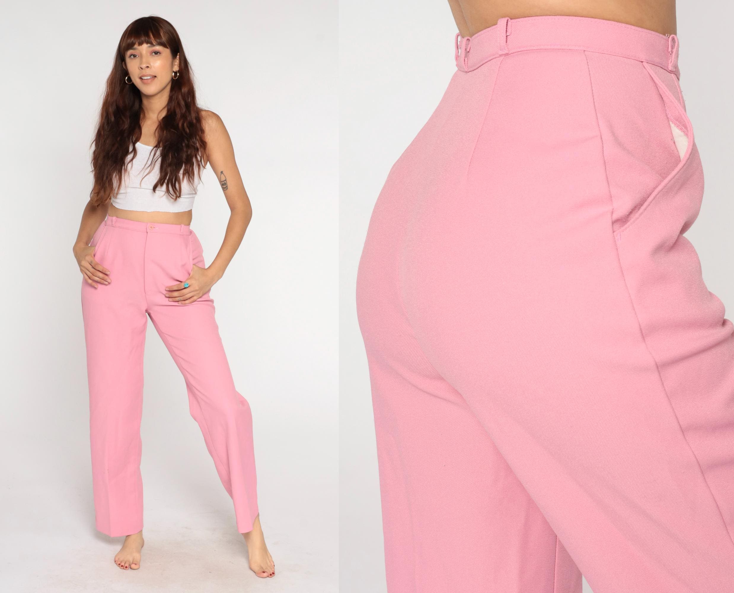 70s bubblegum pink high waisted pants from Levi's with wide straight leg cut and belt loops at waist. Front hip pockets, button and zip fly closure.