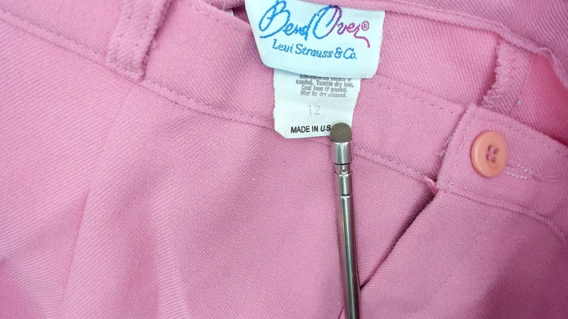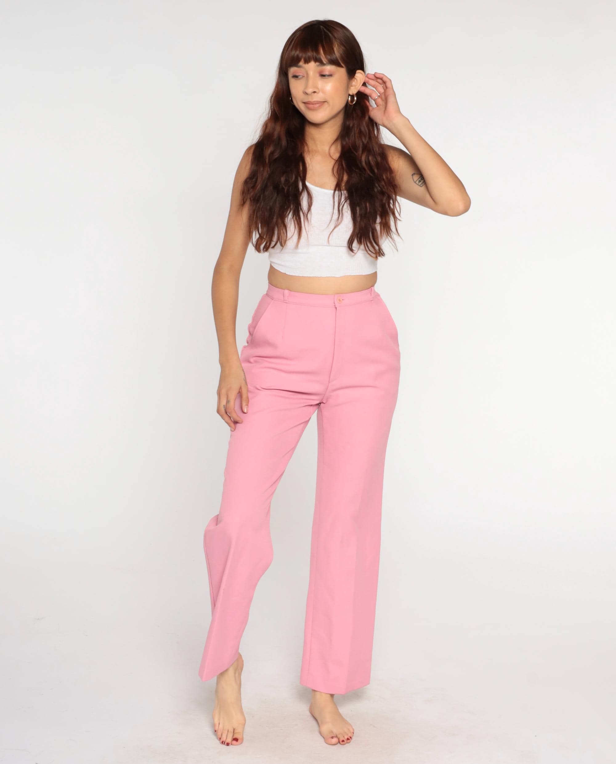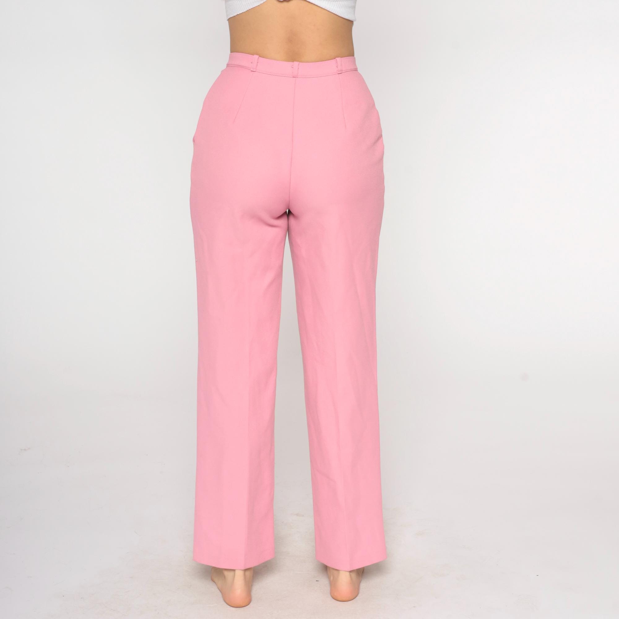 70s bubblegum pink high waisted pants from Levi's with wide straight leg cut and belt loops at waist. Front hip pockets, button and zip fly closure.