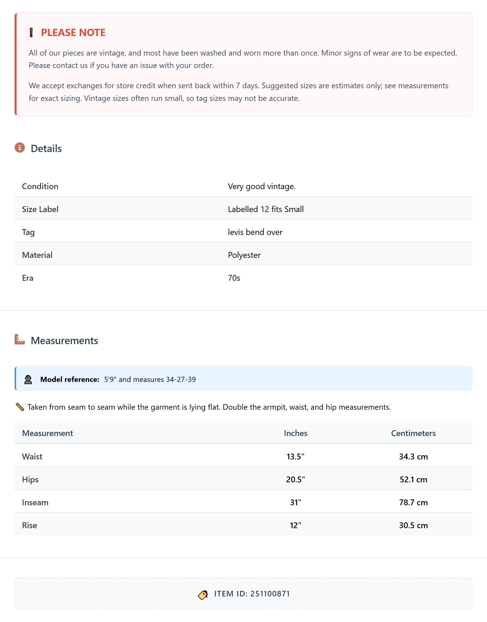 Vintage denim was usually made without any stretch, unlike modern jeans. Check the measurements to ensure proper fit, and remember to give yourself a little wiggle room in the waist and hips, depending on your preferred fit.