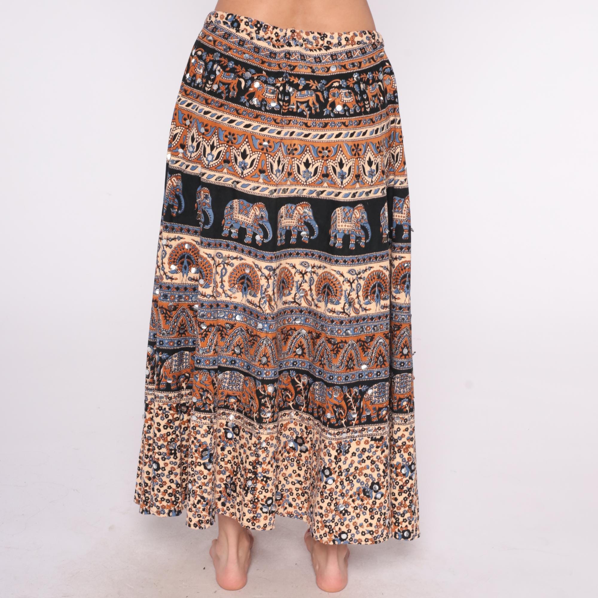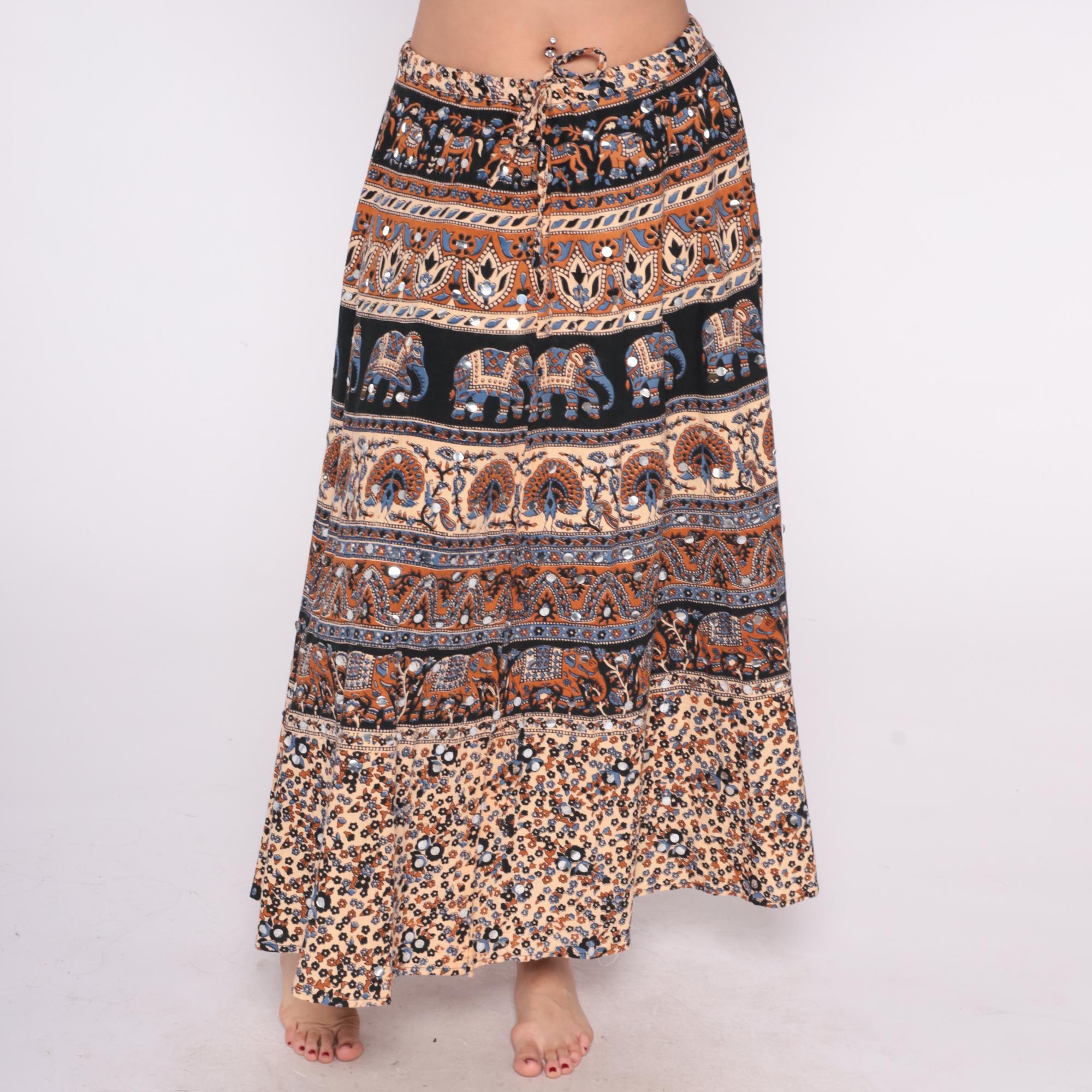 90s tiered maxi wrap skirt from le saige with horizontal bands of alternating patterns including decorated elephants on black, paisley in rust and blue, lotus motifs, and small florals on cream. Drawstring waist with tie closure, gathered throughout multiple tiered sections. Rust, orange, black, cream, and blue colors across the patchwork-style bands.