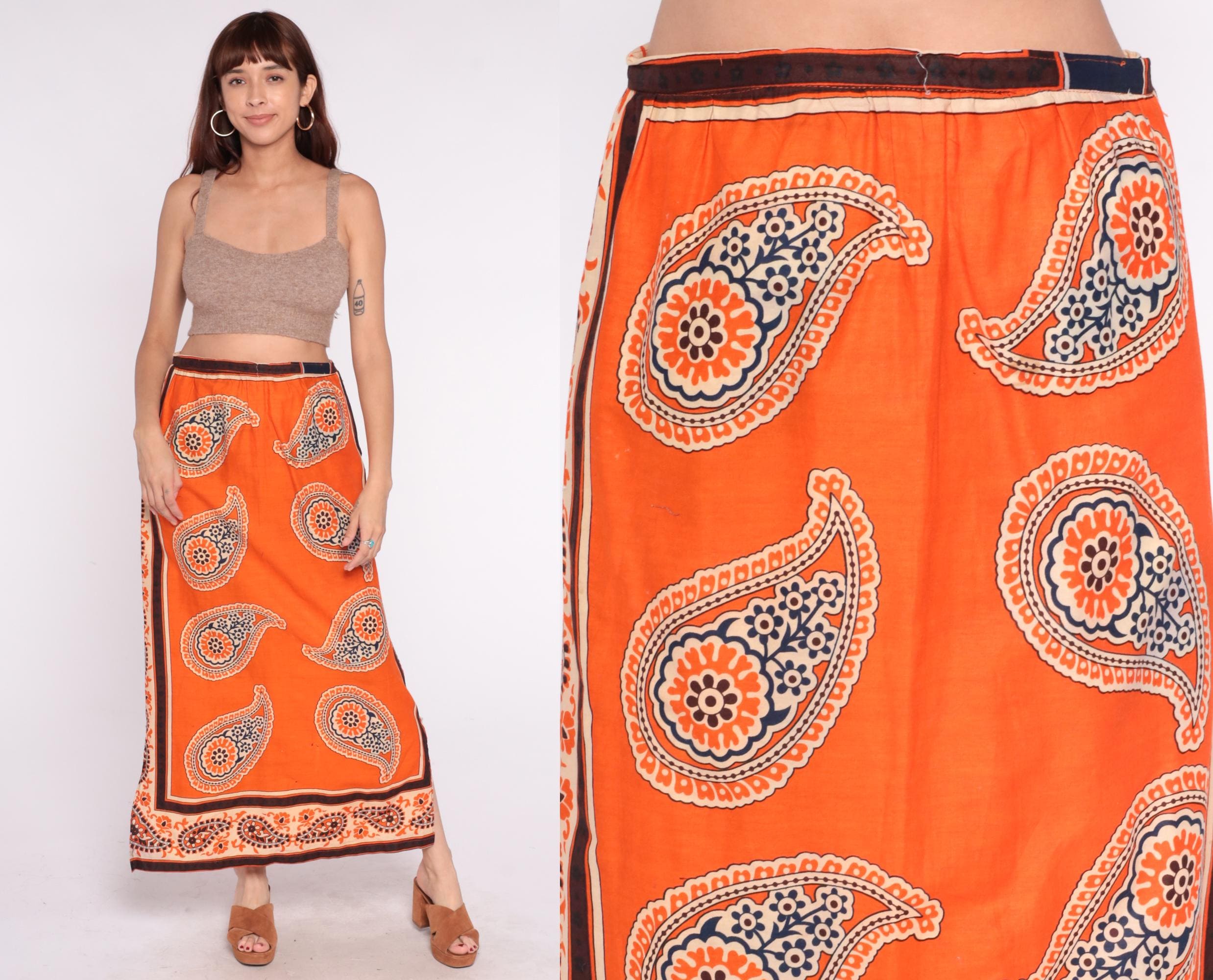 70s orange paisley wrap maxi skirt with border print at hem. Brown, beige, and tan paisley motifs across bright orange fabric.