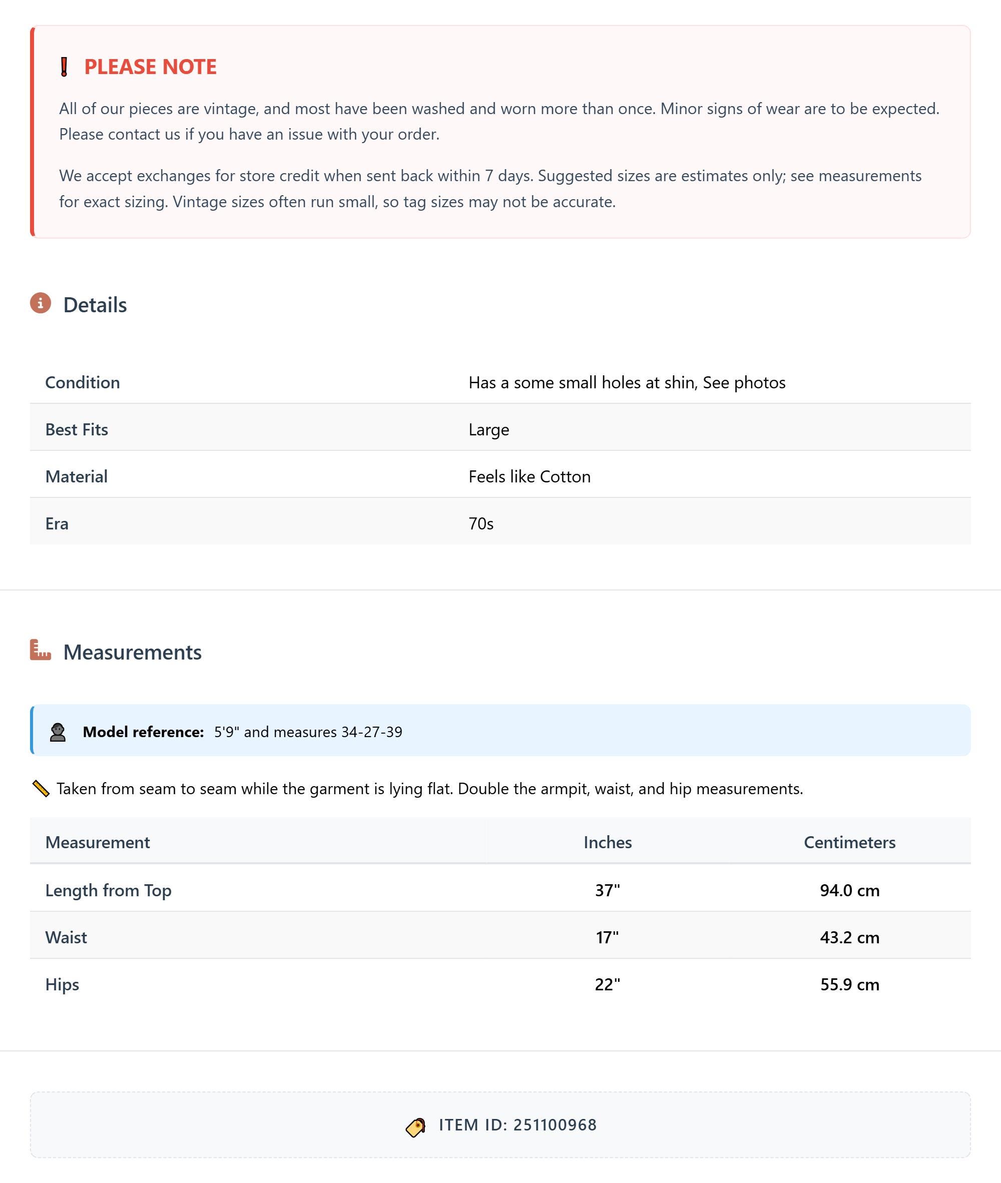 All of our pieces are vintage, and most have been washed and worn more than once. Minor signs of wear are to be expected. Please contact us if you have an issue with your order. We accept exchanges for store credit when sent back within 7 days.